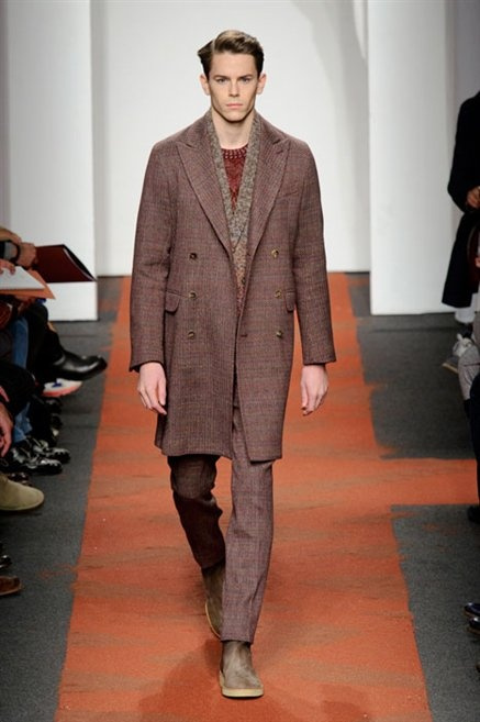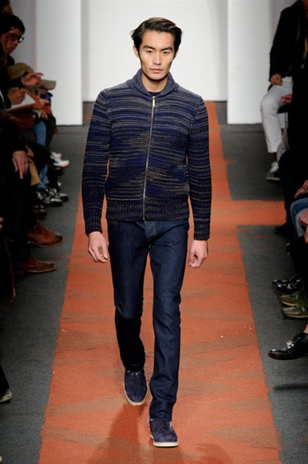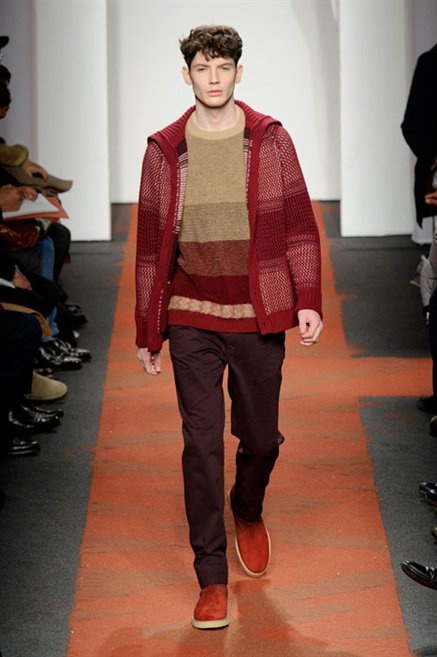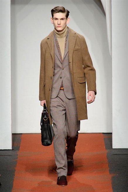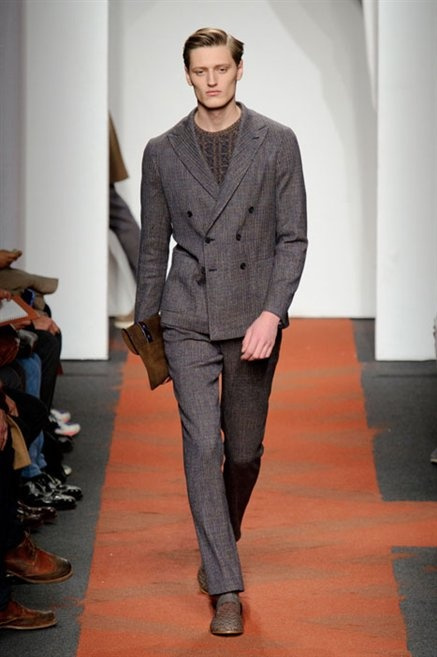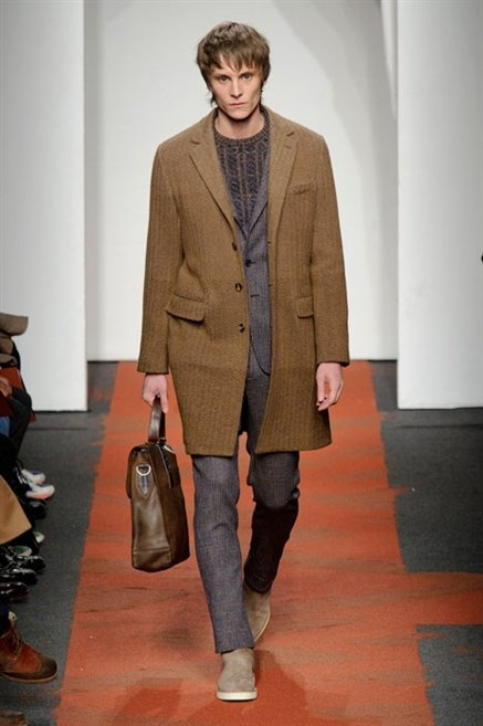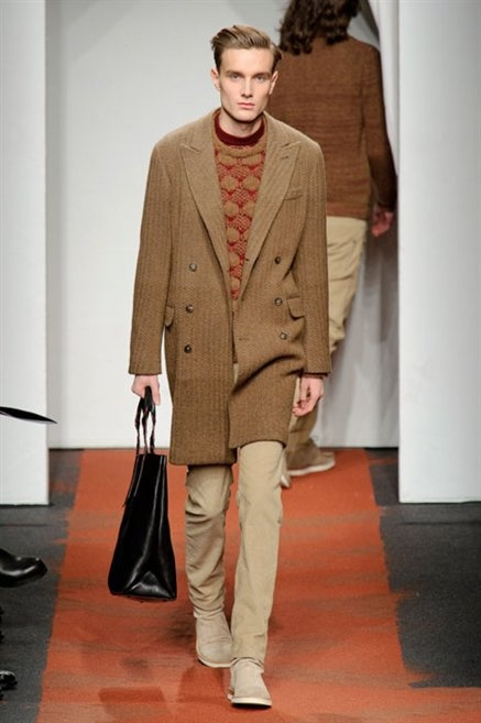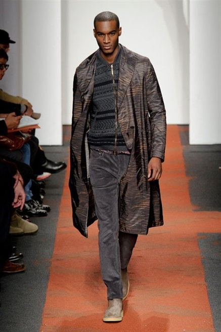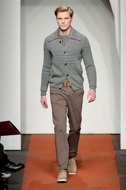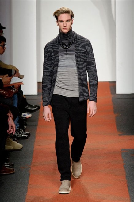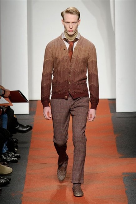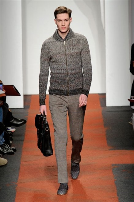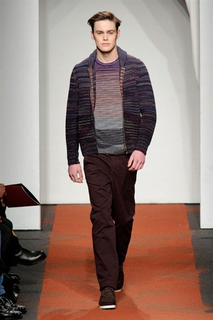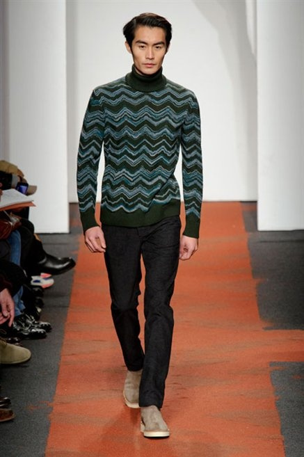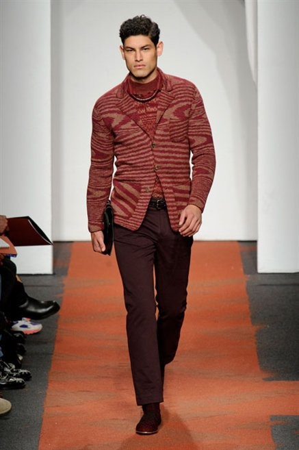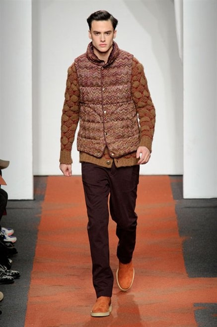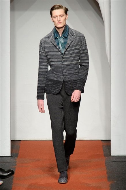 I colori sono linee indipendenti che seguono un proprio percorso. Solitarie, spiccano le une tra le altre. Nessuna prevale. Non ci sono toni accesi, impasti o mix artefatti. Tutto è disegnato secondo una precisa volontà. Missoni sceglie di vestire un uomo dal carattere forte, che non ha bisogno di adornarsi di luci chiassose. La personalità è l'accessorio più importante. Nelle morbide linee della maglieria si insinua il jeans. Blu scuro, deciso. Intuitivo. L'uomo Missoni è un viaggiatore elegante, che decide di passare inosservato, almeno in apparenza. Restano i rossi, bruciati e aranciati. I blu. Il nero è una rapida apparizione. Assorbe la luce e scompare.