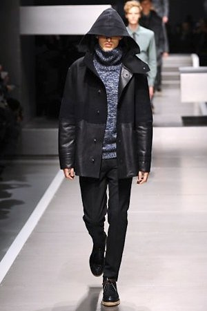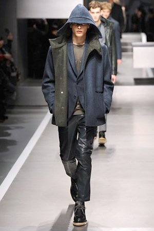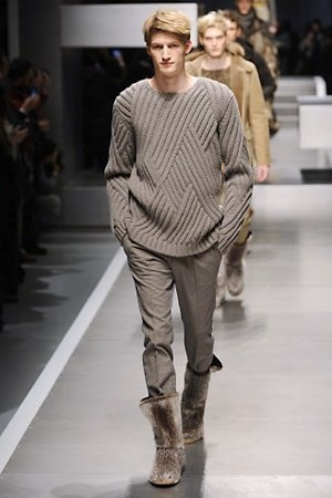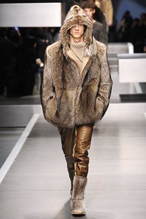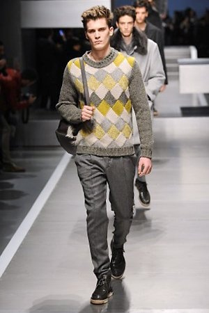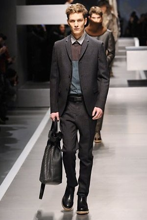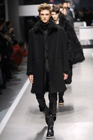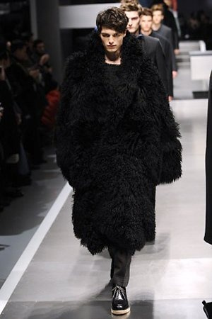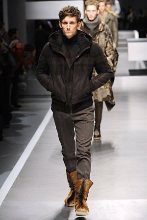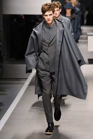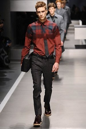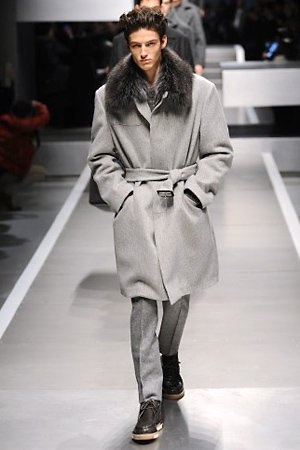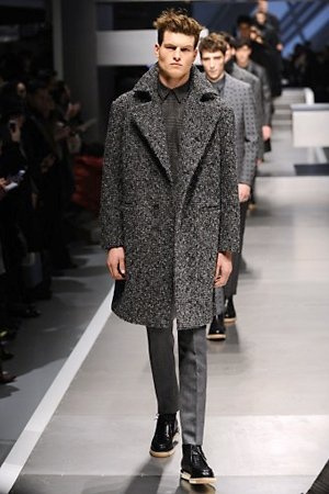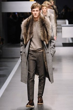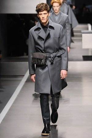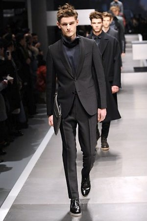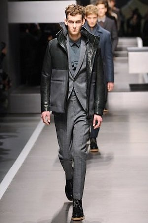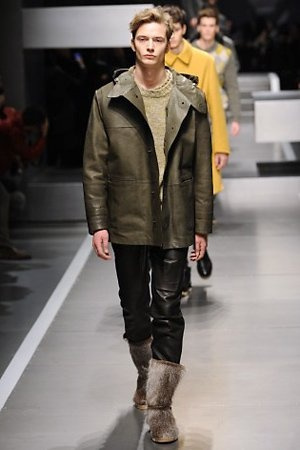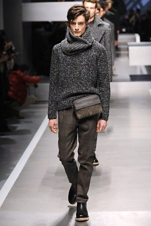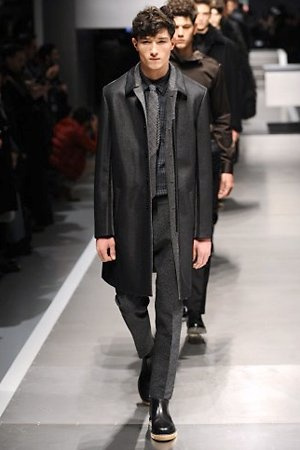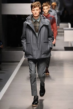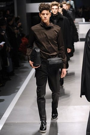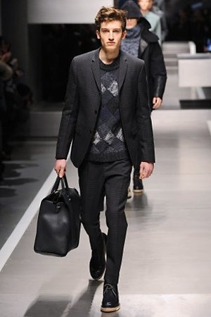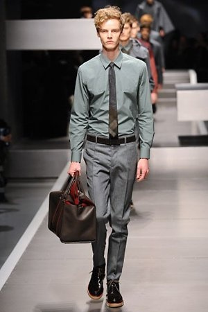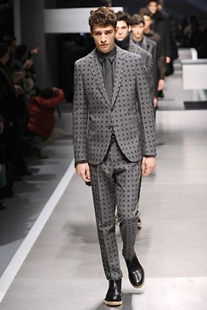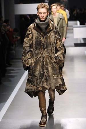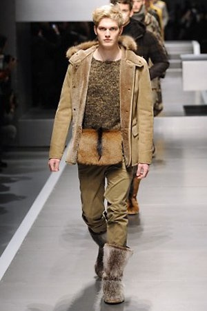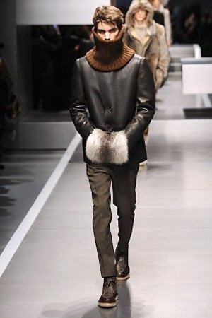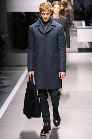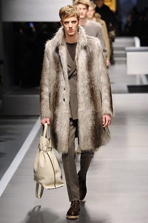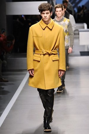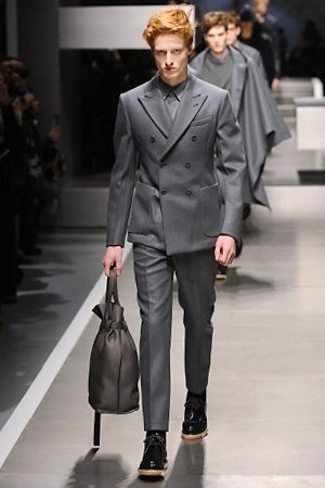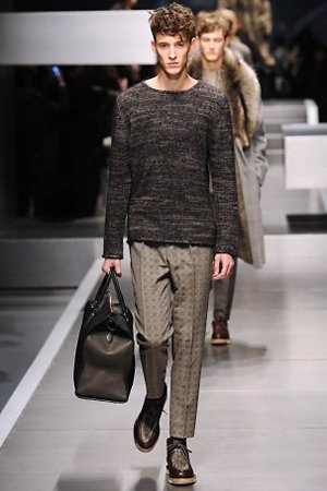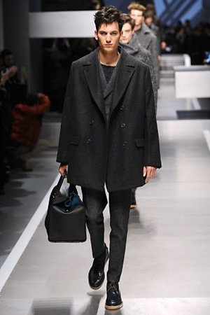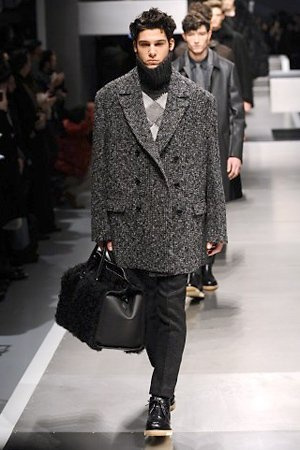 Business man con un background selvaggio. Anche qui la palette di colori non sfocia in tonalità accese: blu, grigio, nero. Senape e rosso le uniche note stonate. Panno, lana, pelle. Il gelo lo si combatte non fermandosi. Bag maschili e stringate che fanno il verso a pellicce e boots. Cappotti doppiati e completi impeccabili. Cura nel dettaglio e nelle lavorazioni. L'uomo Fendi avanza fiero nel prossimo autunno/inverno.