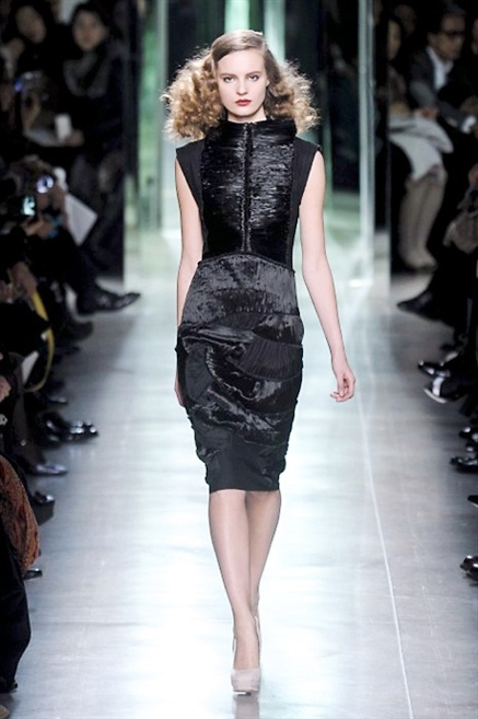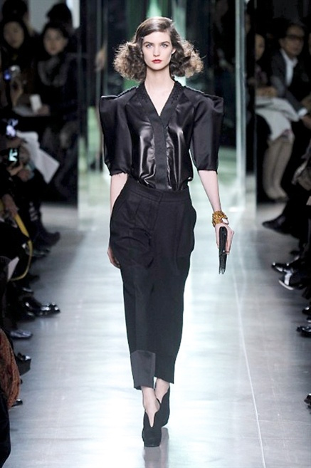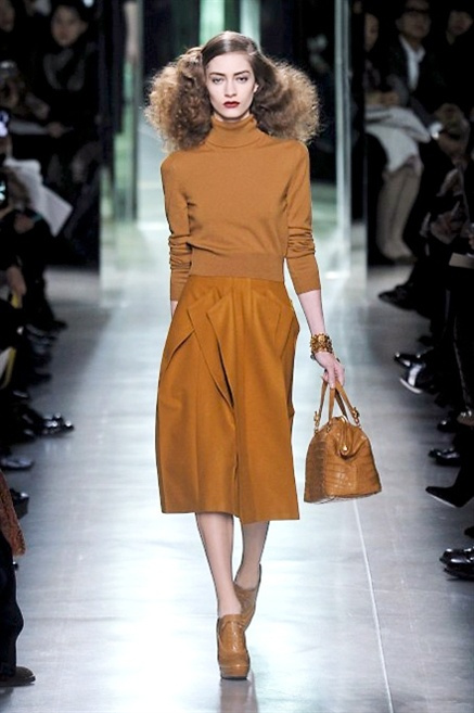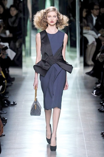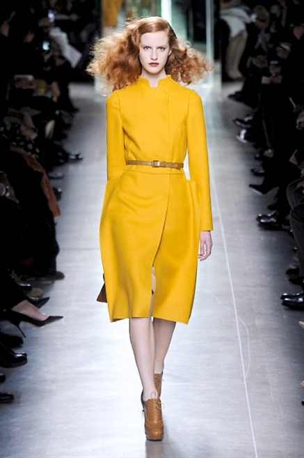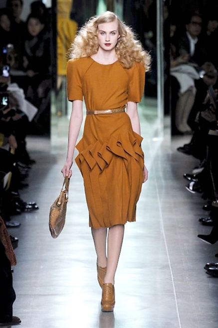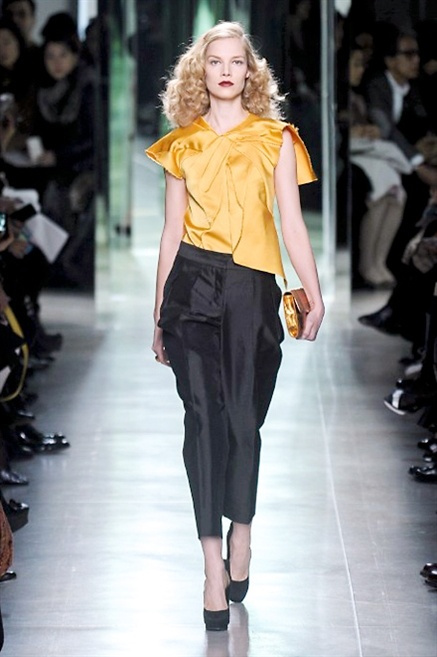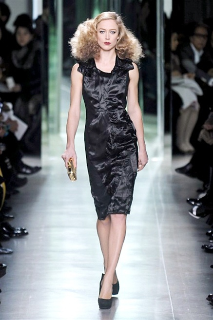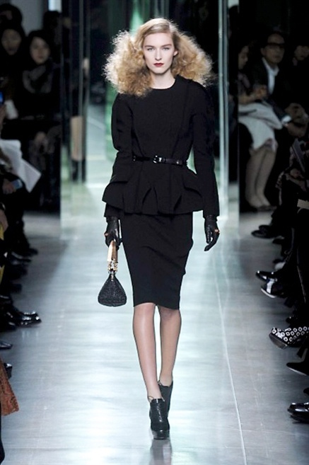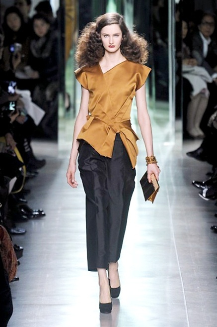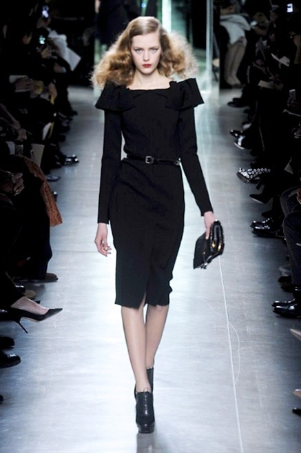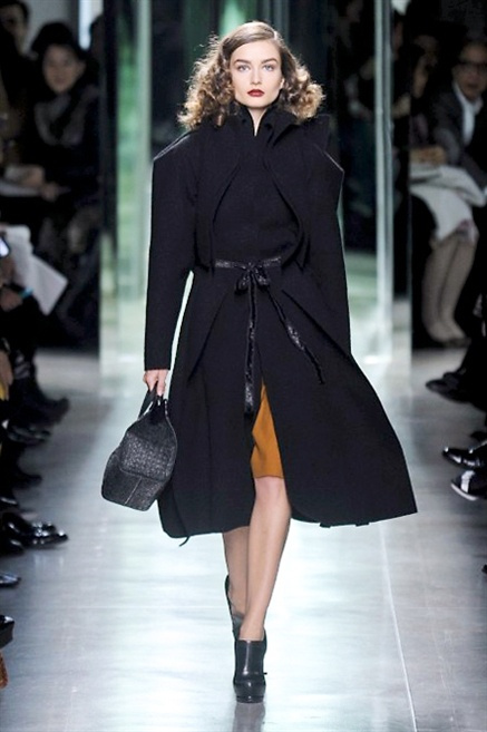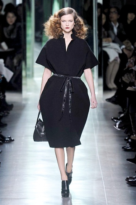 Intrecci innescati da linee che a volte non restano parallele. L'eleganza rigorosa che contraddistingue Bottega Veneta viene, per la prossima stagione, accantonata. Il palcoscenico ora appartiene a luci e ombre. Giochi di proporzioni degne di un architetto: gonne plissettate, giacche strutturate, volant. I volumi diventano più ampi e i materiali più spessi. Miscele di accostamenti e colori: dal cuoio al nero, dal blu al giallo e, infine, al rosso. Macchie di colore e immagini astratte su tubini raffinatiCintura in vita e spalle costruite come se fossero le torri di un castello. Le lunghezze non vanno oltre al ginocchio e lasciano immaginare gambe sinuose. La seduzione parte dall'intuito.