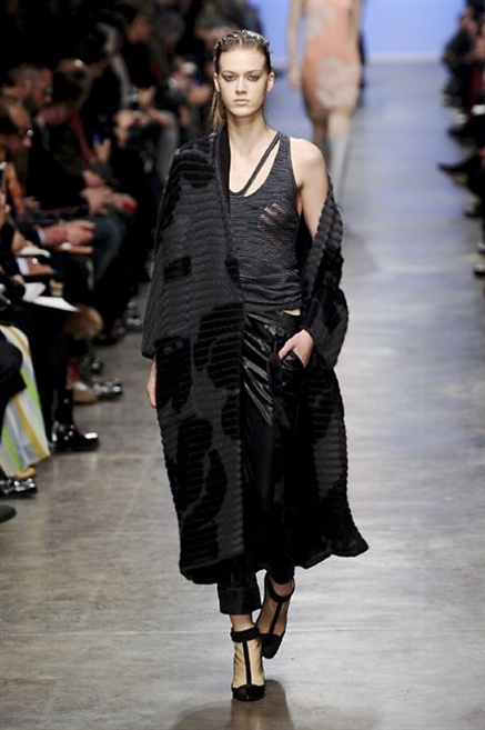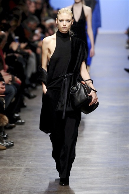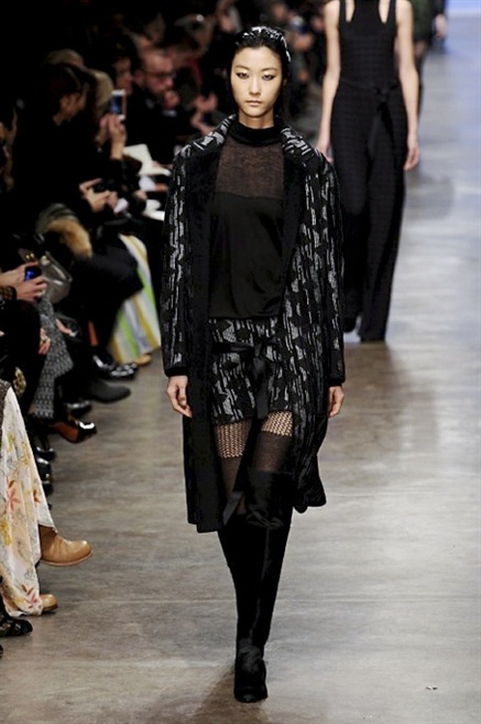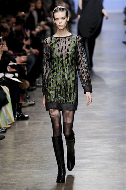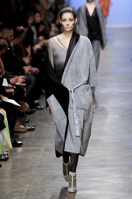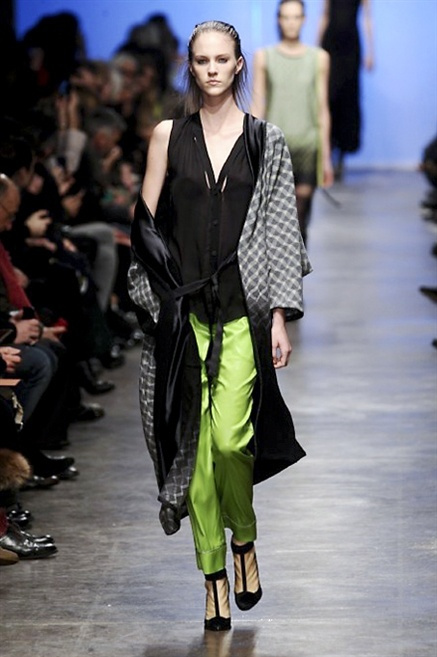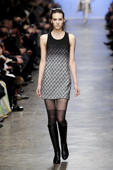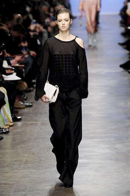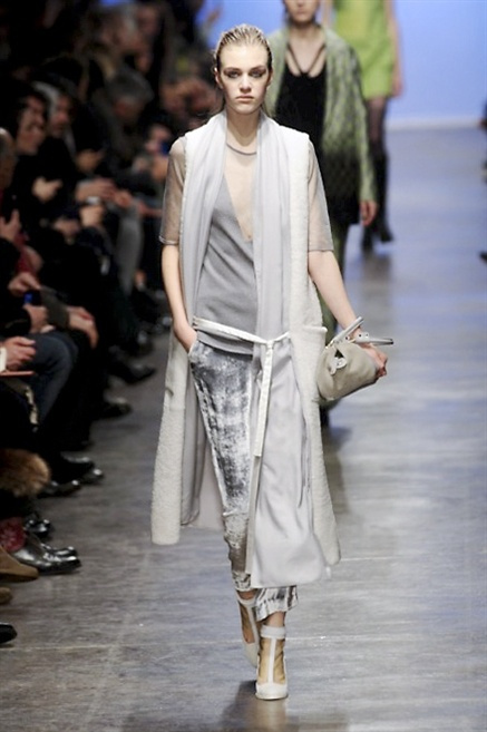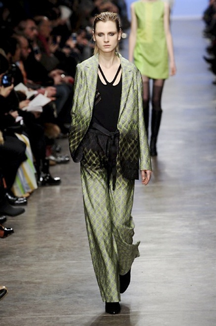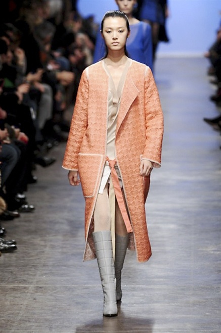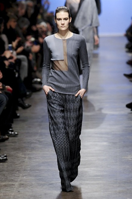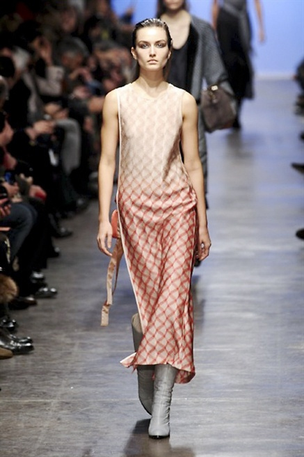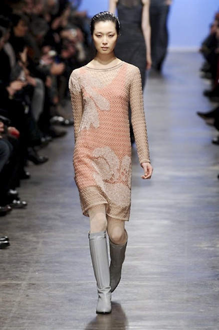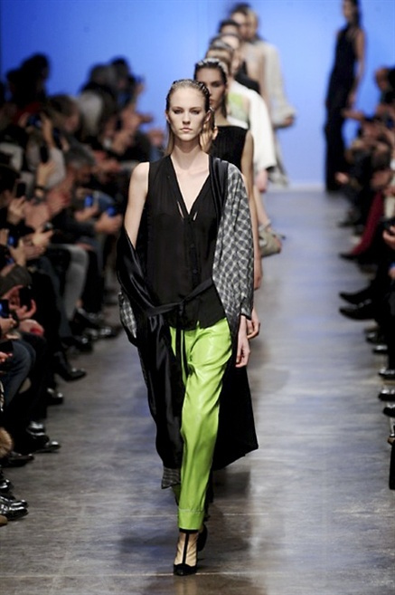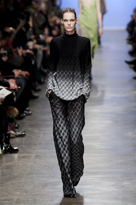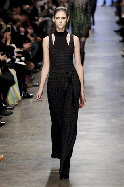 Colori pieni, uniformi. Manca la trama Missoni, sostituita da sfumature e trasparenze. Lunghezze e forme sinuose regalano una silhouette morbida. Nessun eccesso. Pura semplicità. La palette di colori si tinge di nero, prevalentemente, lasciando spazio al verde mela, al pesca, al blu e al grigio. Immancabili pennellate di bianco. I capispalla sono destrutturati: nessuna spallina, nessuna curvatura imposta. Indossare un cappotto deve essere un piacere attorno a cui ci si avvolge, quindi, imperativo sentirsi comfortable. Anche la fattezza ne rende l'immagine, infatti, sono realizzati in montone.La femminilità della maglia lavorata e le trasparenze che scoprono un nude look si alternano a scialli calati sulle spalle. Morbide seduzioni non ostentate.