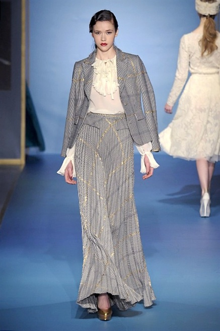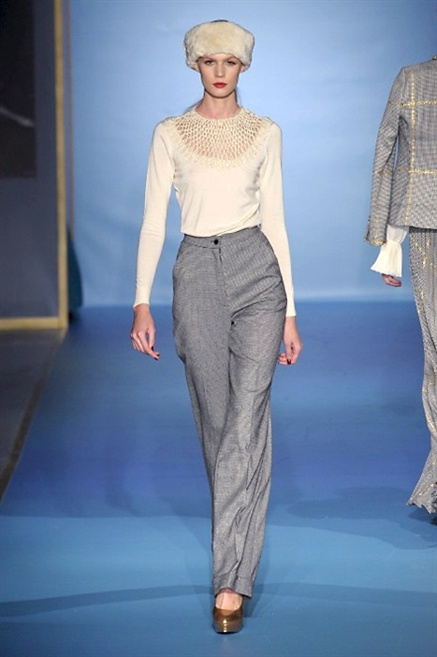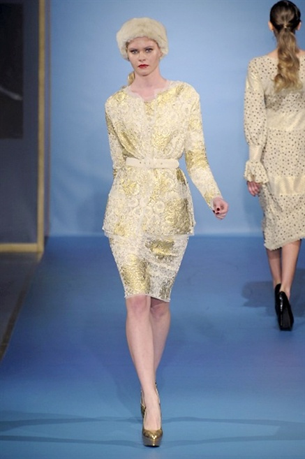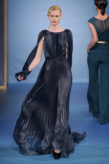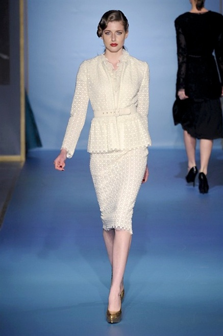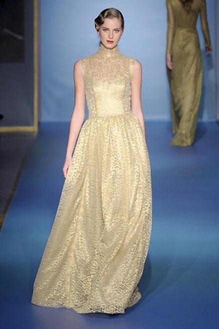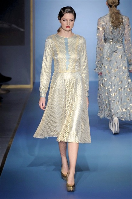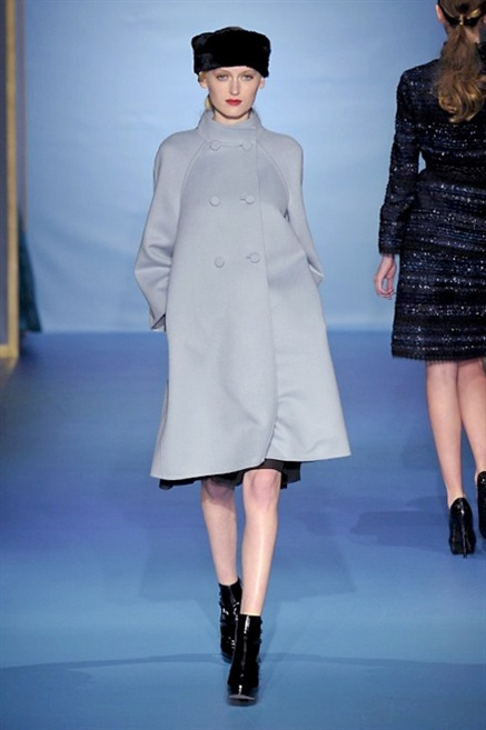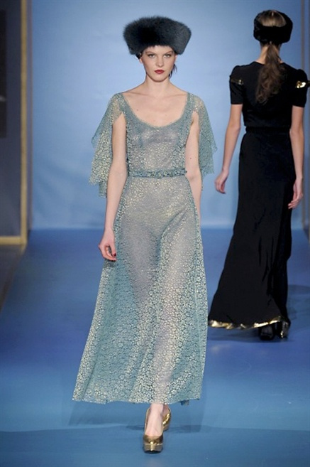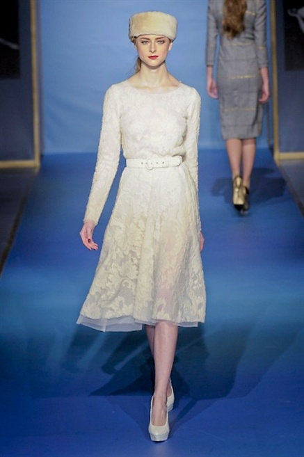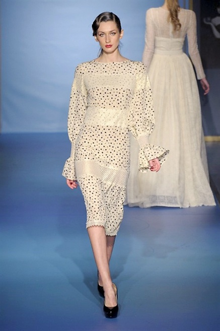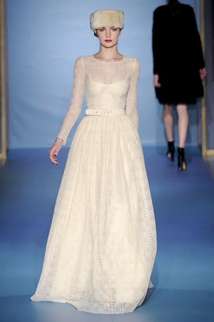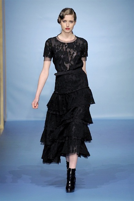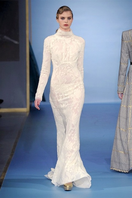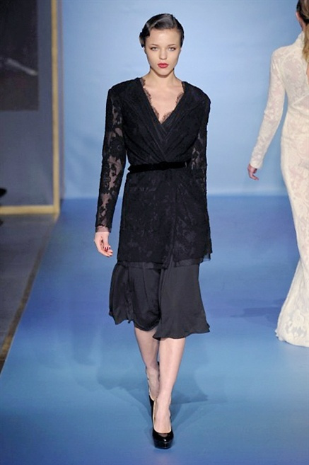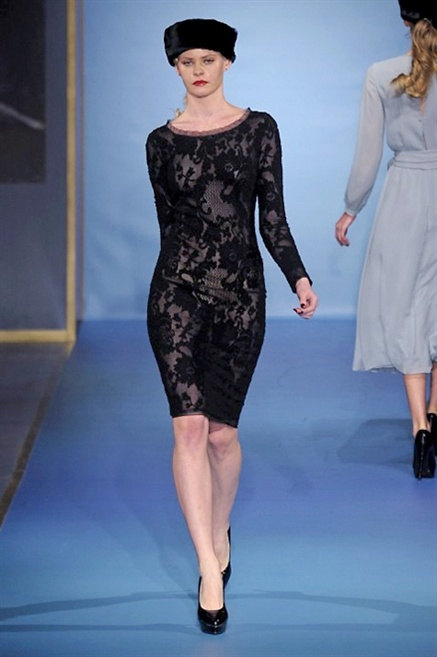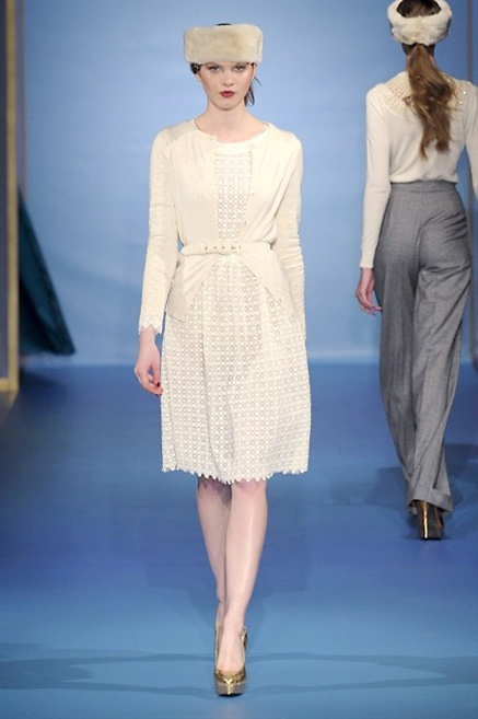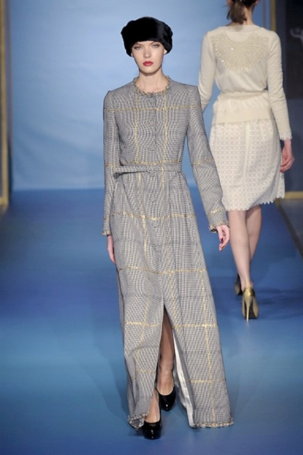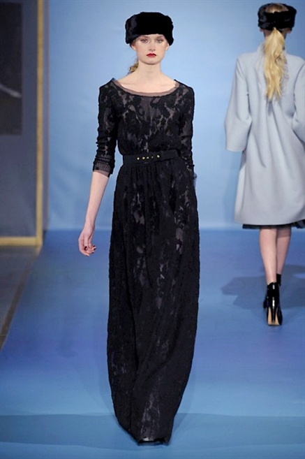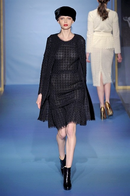 Cappotti lunghi che sembrano tuniche, abiti fascianti, giacche indossate con pantaloni over e lunghi fino a coprire la scarpa, candido pizzo, abiti da sera bianchi come se si dovessero indossare sull’altare. Questa è l’eleganza, che ripropone ancora una volta sulla sua passerella, Luisa Beccaria. Solo sul finale si rompono gli indugi e sotto plissè trasparenti o preziosi ricami si intravede la pelle delle modelle. Gli anni ’30 e ’40 sono assunti a modello di eleganza e reinterpretati con gusto contemporaneo.