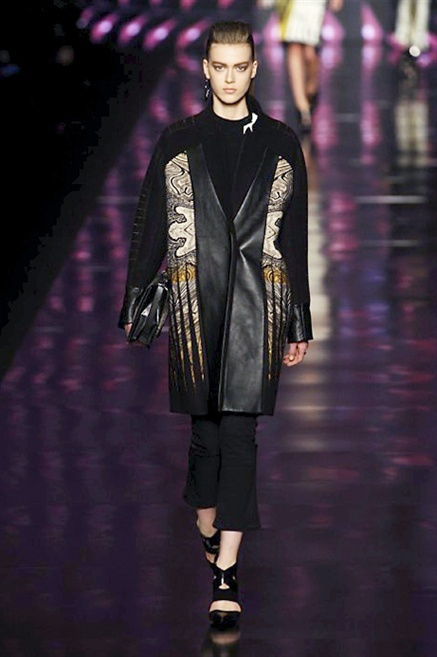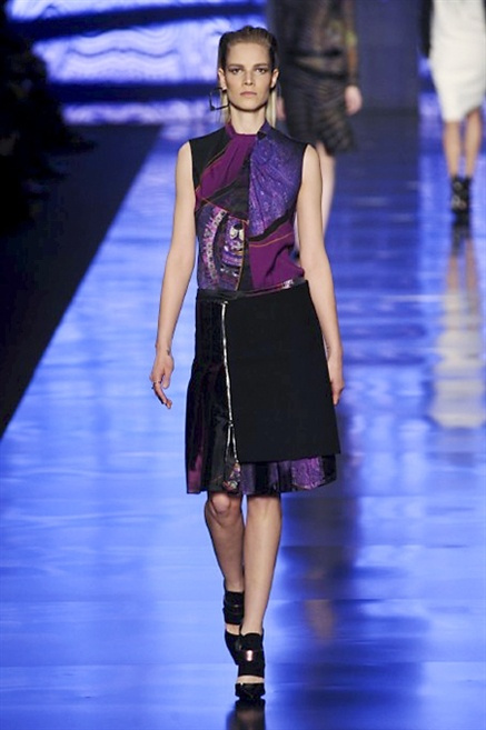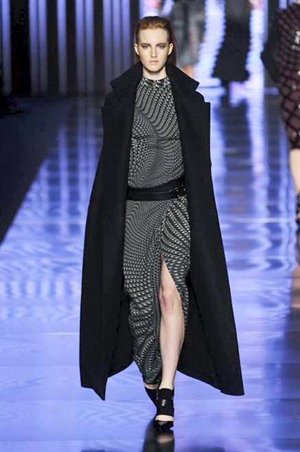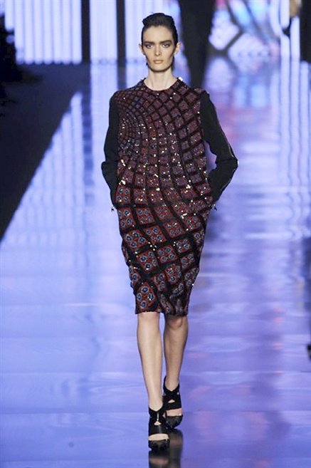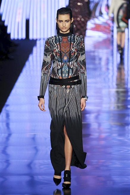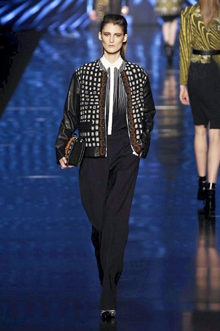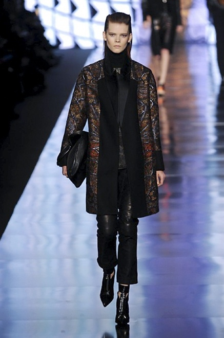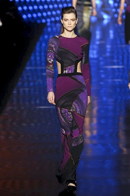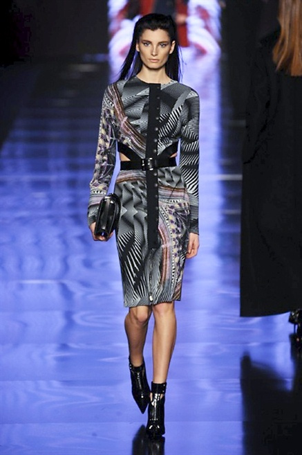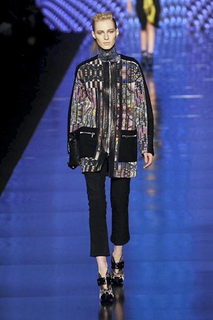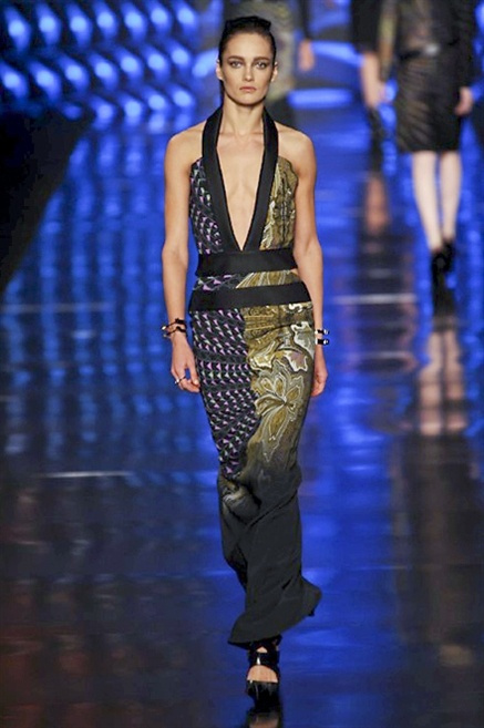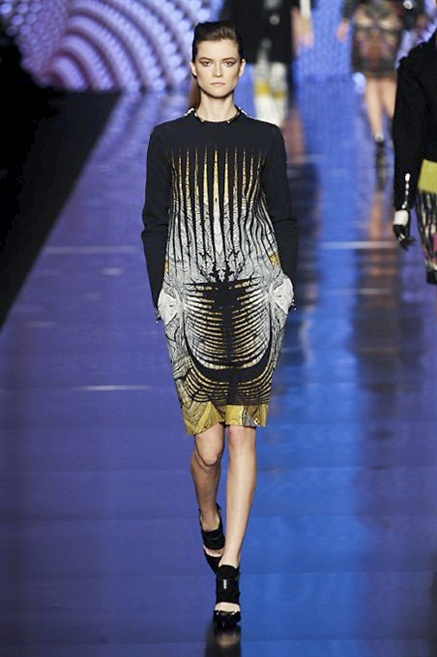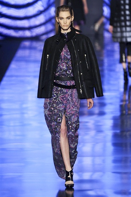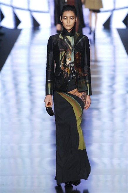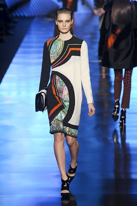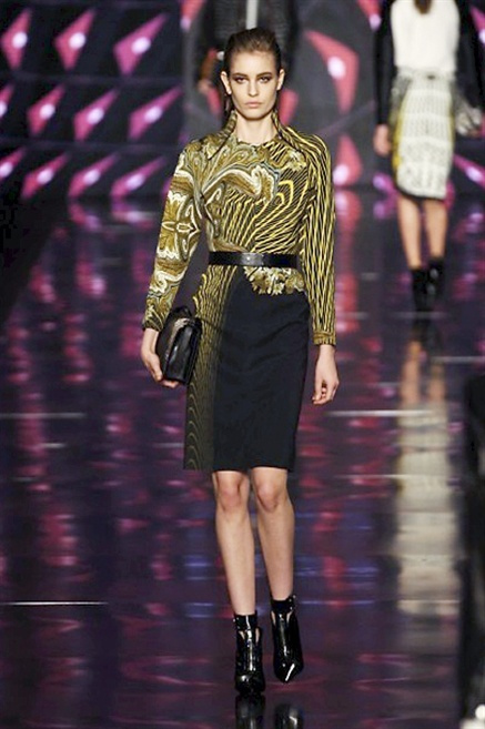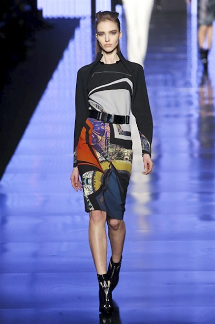 Cosa può trovare spazio in pochi centimetri di sottile stoffa? Un intero universo, perfino epoche intere, se con abilità si gioca a mischiare stampe provenienti da mondi diversi. Etro dunque punta ancora una volta sul proprio pezzo forte, ma non tralascia l’innovazione, così i disegni storici della maiosn, primo tra tutti il paisley, sono rielaborati digitalmente. Porcellane di San Pietroburgo si fondono con incrostazioni lunari, di definito nella collezione c’è solo la silhouette vicina al corpo e la vita segnata da cinture di pelle che a volte sono incorporate negli abiti. Asimmetrie, contrasti di tessuti ed effetti di profondità danno il senso del movimento, della mutazione che nella moda, come nell’universo è costante.
