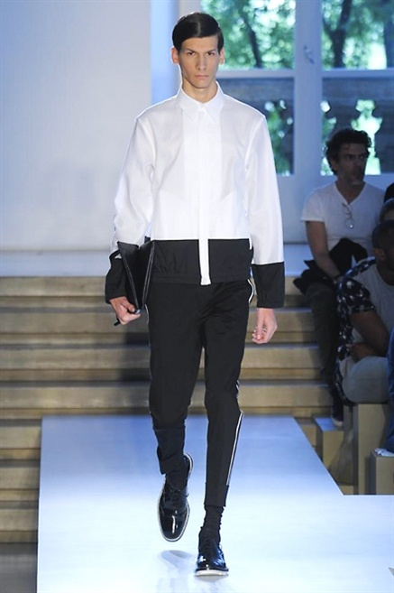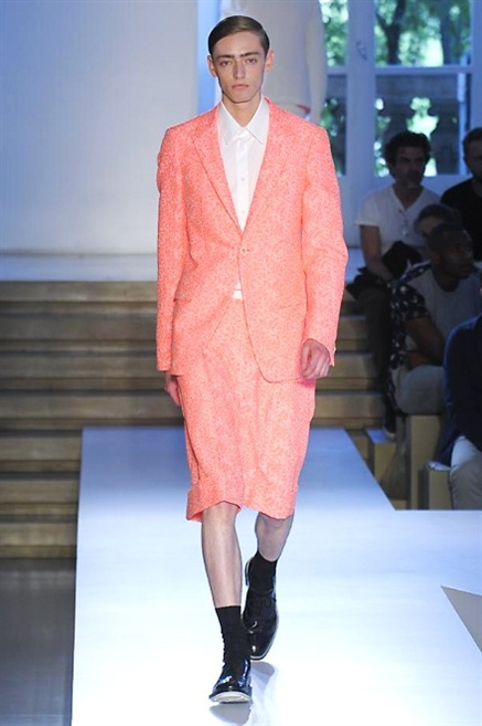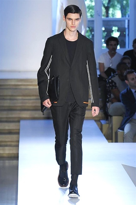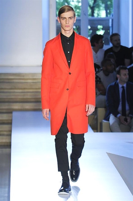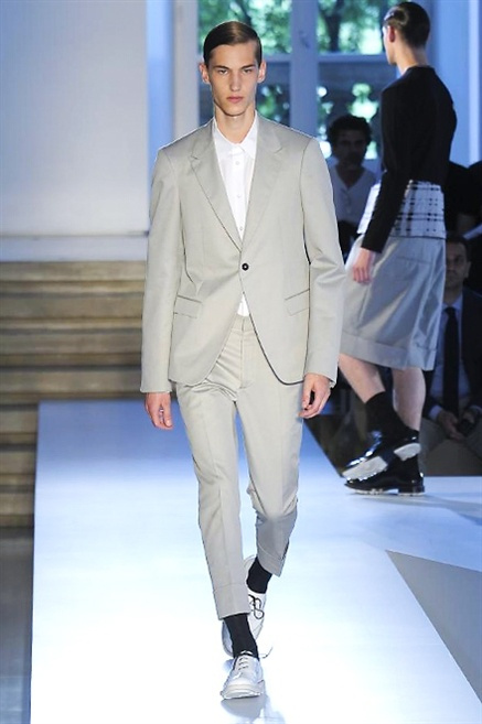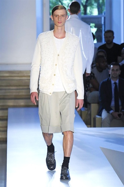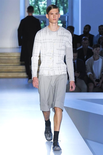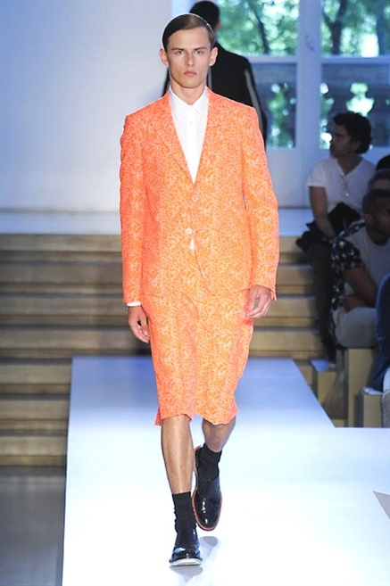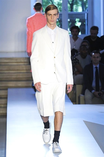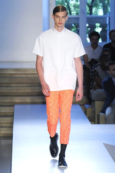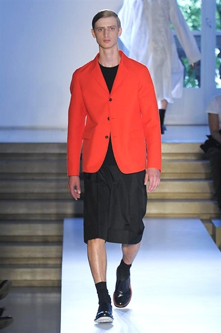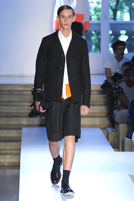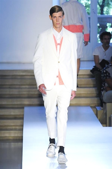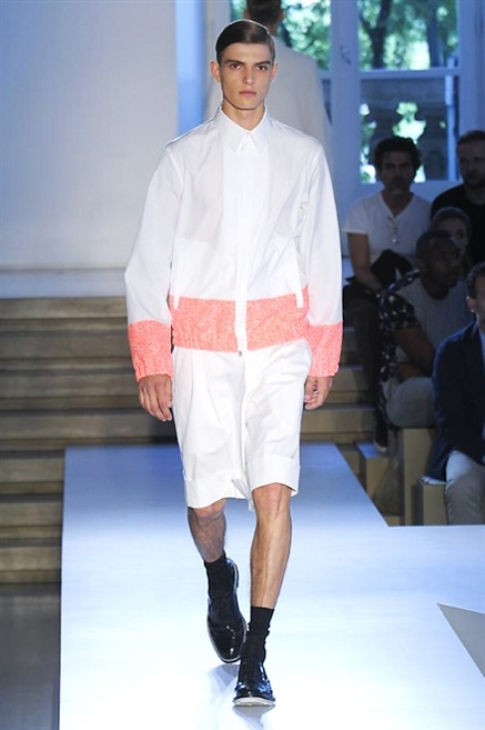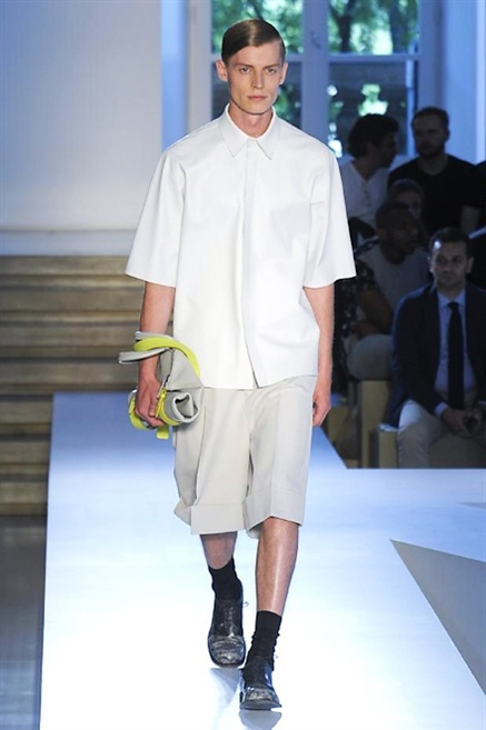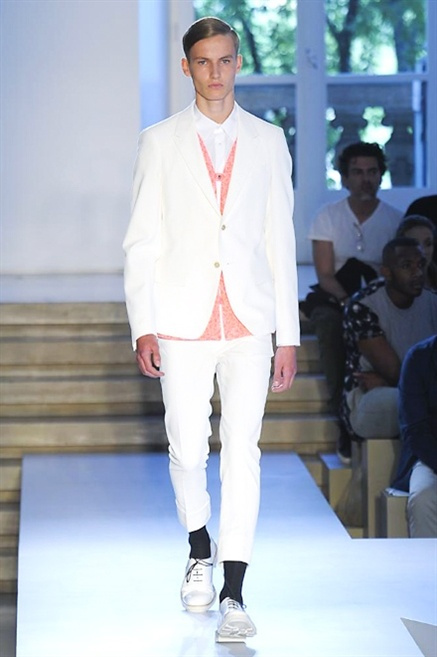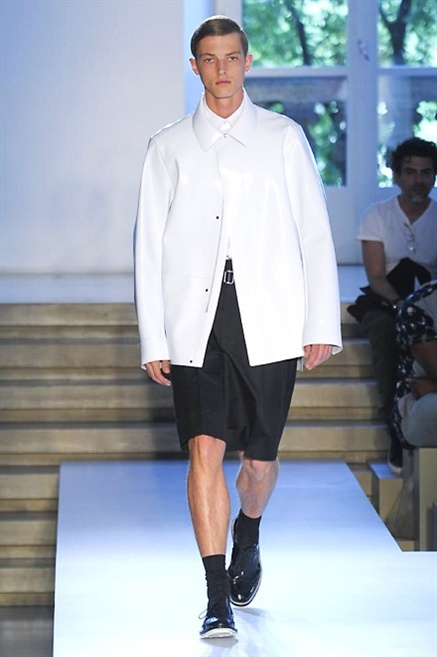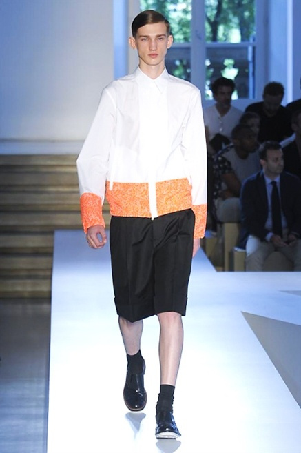 Inizia con un total white la sfilata Jil Sander primevra7estate 2013 e, come spesso succede su questa passerella, il colore compare uscita dopo uscita, la materia si appesantisce e dalla sottile stoffa si giunge ai capospalla dall’effetto semi-lucido. Dapprima si insinua l’arancione aragosta, dopo una tonalità più accesa, tendente al rosso, uniche note diverse in un guardaroba fatto di capi bianchi e avorio, prima della stampa astratta finale vagamente psichedelica da lontano. D’obbligo il bermuda molto ampio.