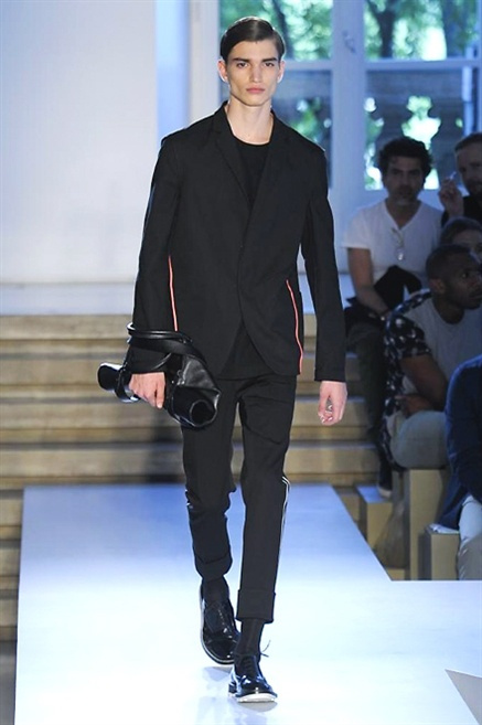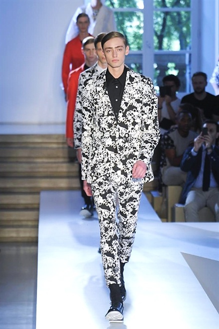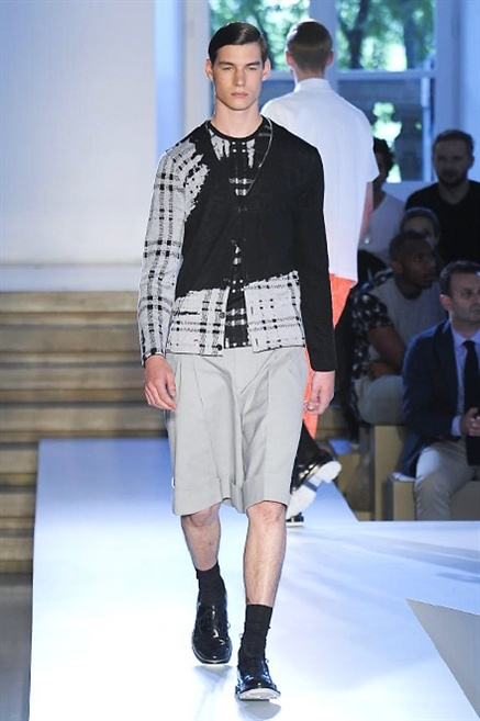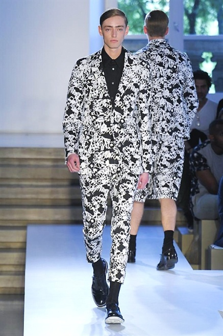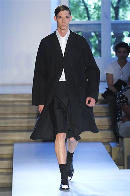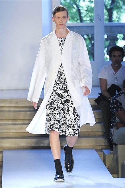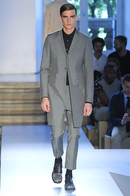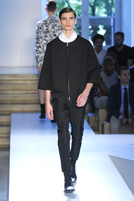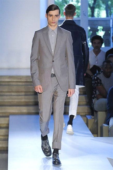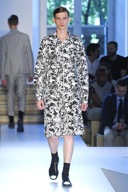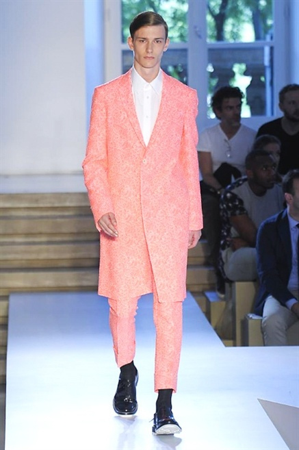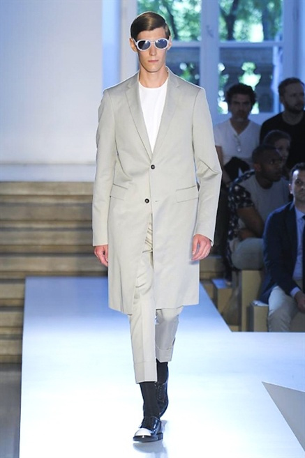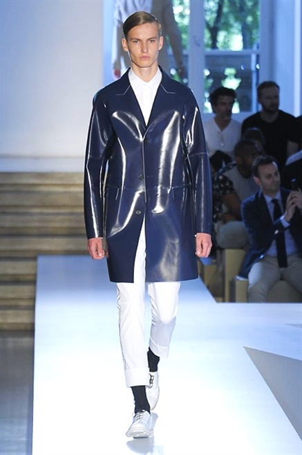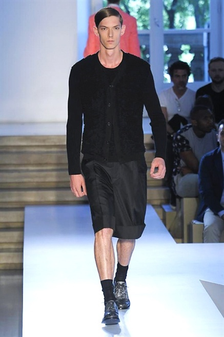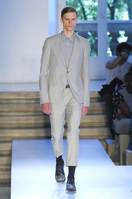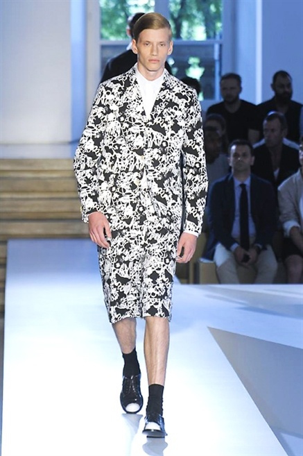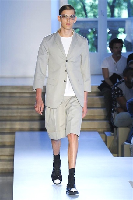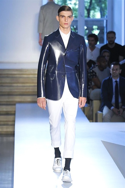Inizia con un total white la sfilata Jil Sander primevra7estate 2013 e, come spesso succede su questa passerella, il colore compare uscita dopo uscita, la materia si appesantisce e dalla sottile stoffa si giunge ai capospalla dall’effetto semi-lucido. Dapprima si insinua l’arancione aragosta, dopo una tonalità più accesa, tendente al rosso, uniche note diverse in un guardaroba fatto di capi bianchi e avorio, prima della stampa astratta finale vagamente psichedelica da lontano. D’obbligo il bermuda molto ampio.