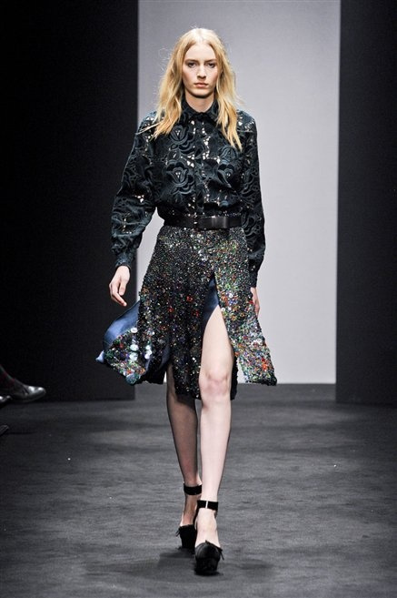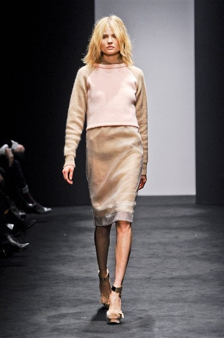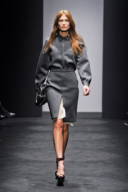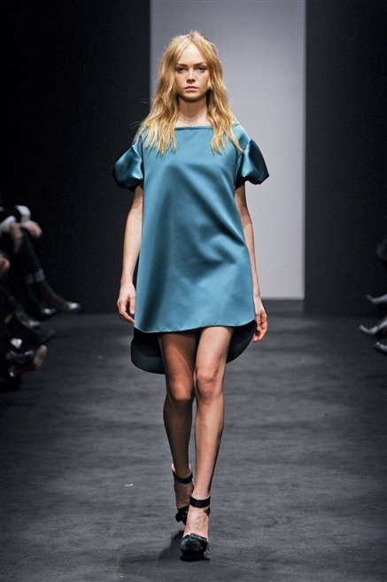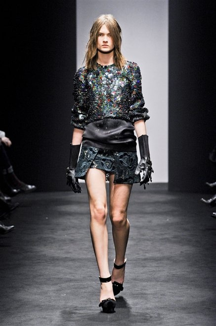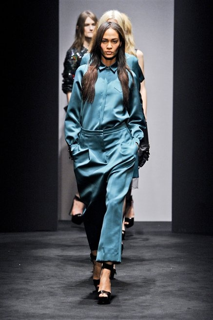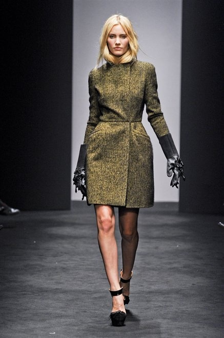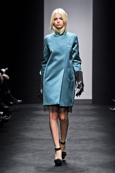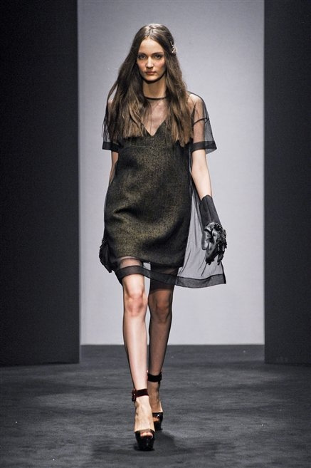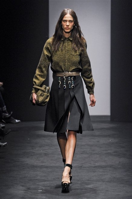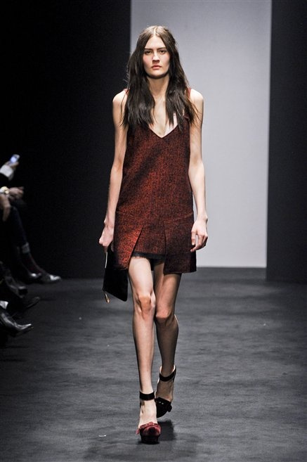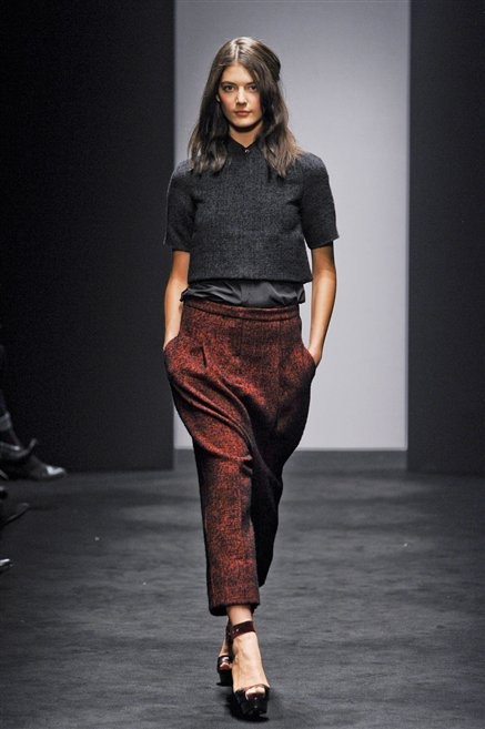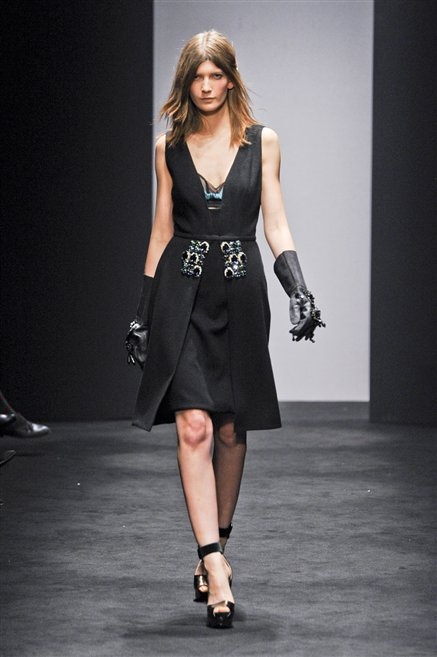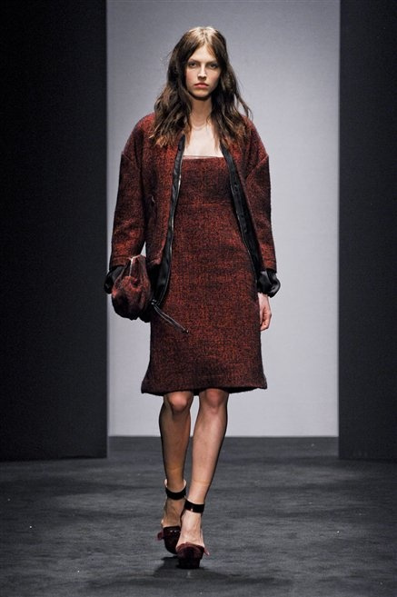 Alessandro Dell’Acqua prende in prestito i colori della collezione da un tappeto di foglie autunnali. I pesanti tessuti degli abiti maschili sono usati per giacche strizzate, le cinture da uomo e i guanti da lavoro sono impreziositi da pietre dure. Il busto è spesso fasciato, talvolta svelato dalle trasparenze di camicie che sottolineano un sofisticato effetto lingerie; le gambe sono sempre scoperte: gonne sopra o al ginocchio dalla vita alta (che slancia la silhouette) e ricche di pieghe geometriche vagamente anni ’40, come le pochette rettangolari, in un'armonia di angoli che costituiscono il codice stilistico di Dell'Acqua. Costruire la femminilità più spiccata inglobando addirittura i codici del vestire maschile è di certo una prova di creatività, ma anche un gioco per tutte le donne che ne sono destinatarie. Bentornato a uno dei più grandi talenti del design italiano.