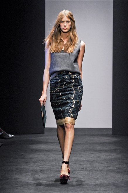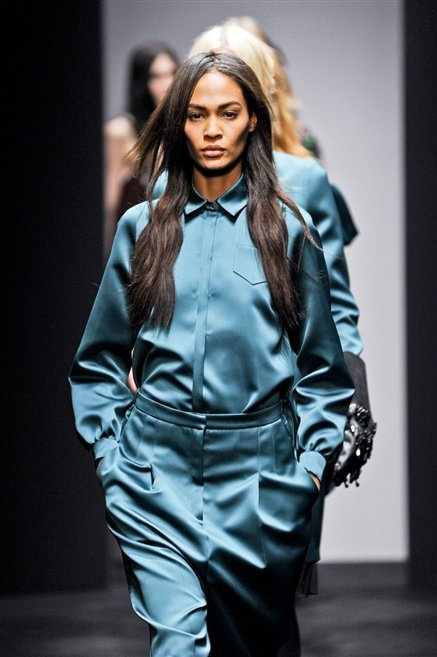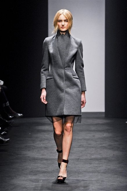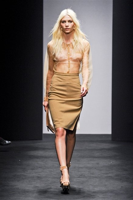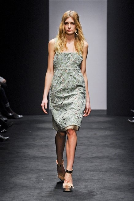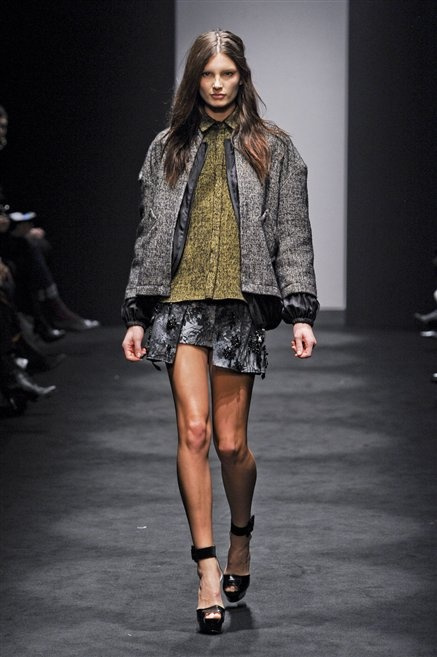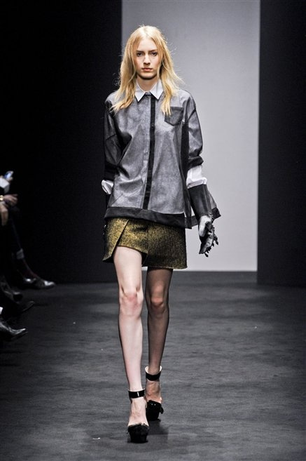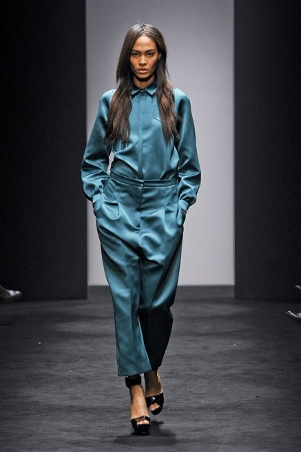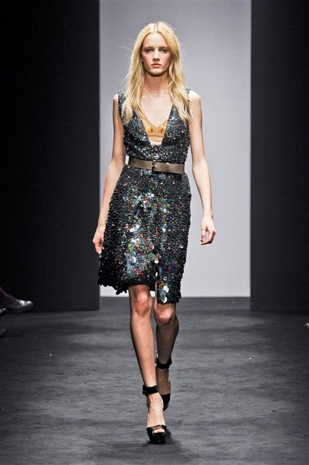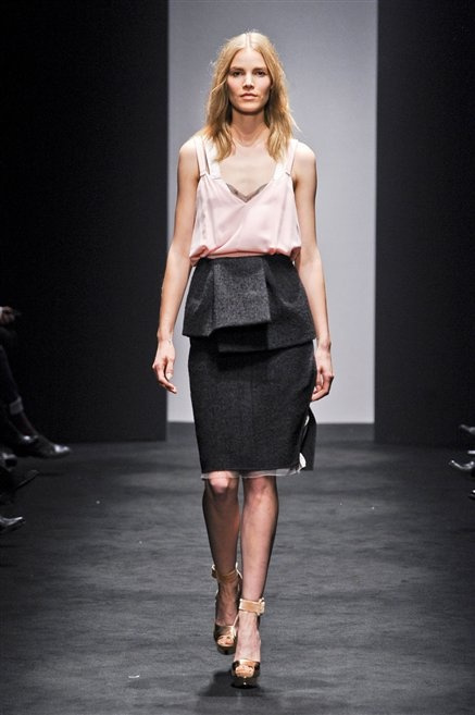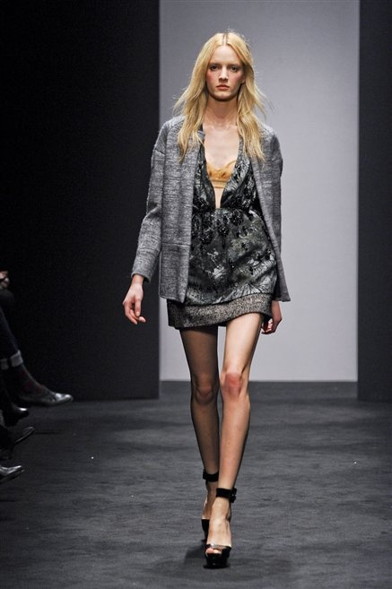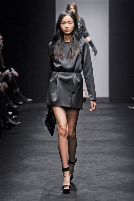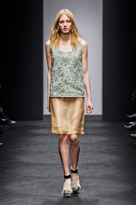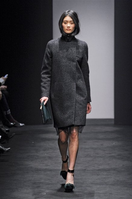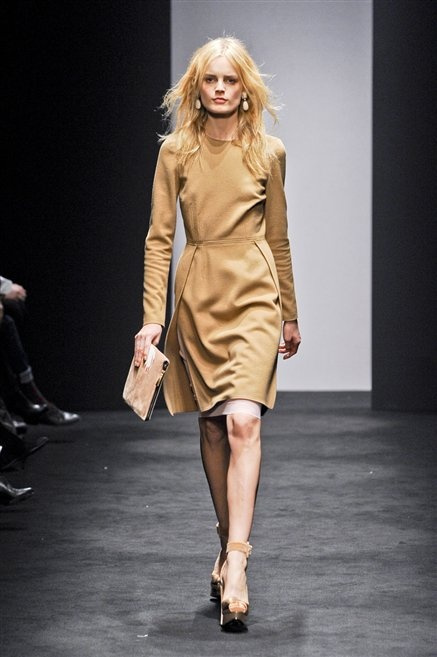 Alessandro Dell’Acqua prende in prestito i colori della collezione da un tappeto di foglie autunnali. I pesanti tessuti degli abiti maschili sono usati per giacche strizzate, le cinture da uomo e i guanti da lavoro sono impreziositi da pietre dure. Il busto è spesso fasciato, talvolta svelato dalle trasparenze di camicie che sottolineano un sofisticato effetto lingerie; le gambe sono sempre scoperte: gonne sopra o al ginocchio dalla vita alta (che slancia la silhouette) e ricche di pieghe geometriche vagamente anni ’40, come le pochette rettangolari, in un'armonia di angoli che costituiscono il codice stilistico di Dell'Acqua. Costruire la femminilità più spiccata inglobando addirittura i codici del vestire maschile è di certo una prova di creatività, ma anche un gioco per tutte le donne che ne sono destinatarie. Bentornato a uno dei più grandi talenti del design italiano.