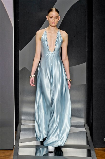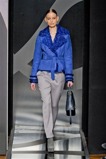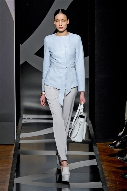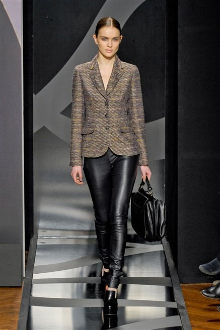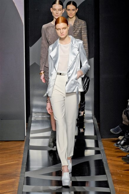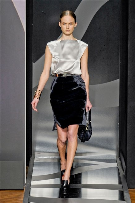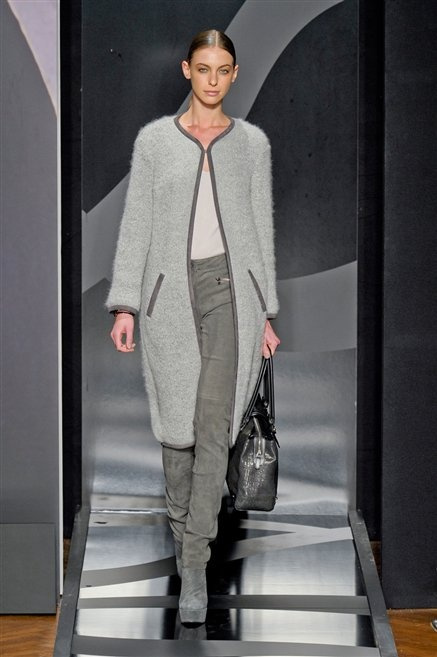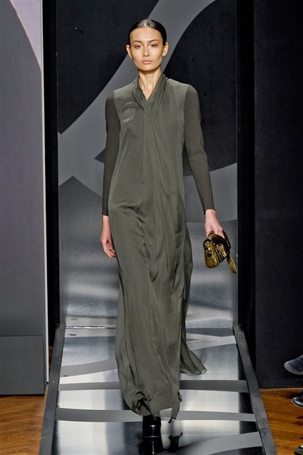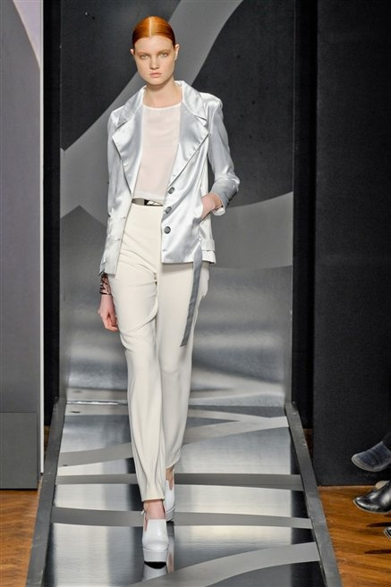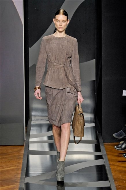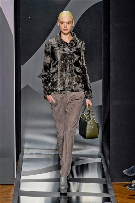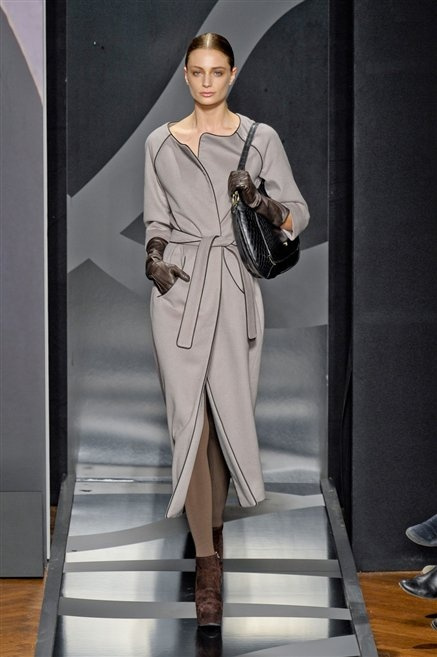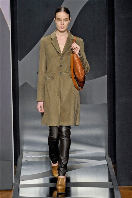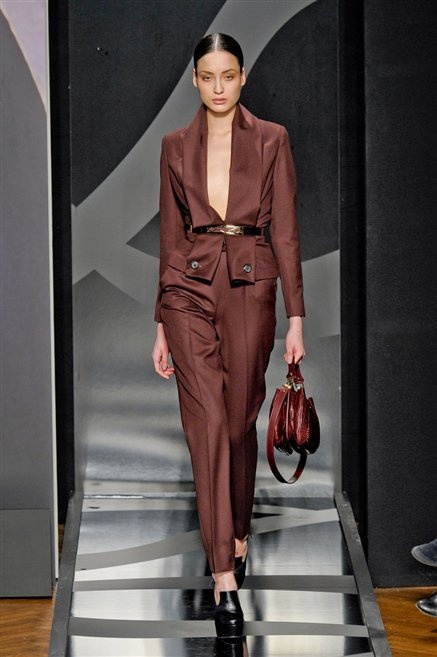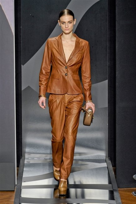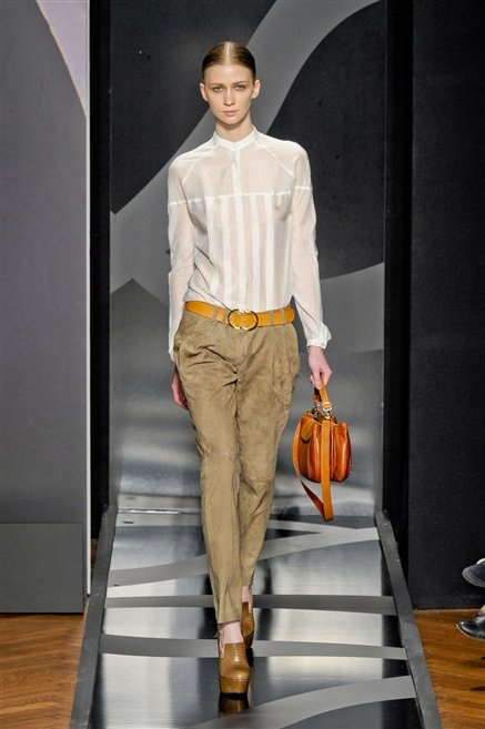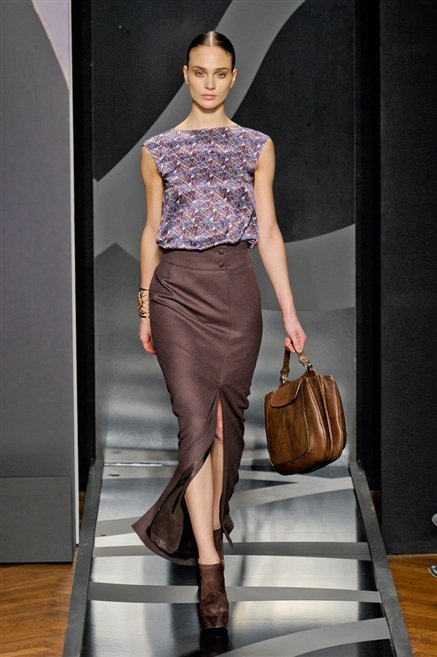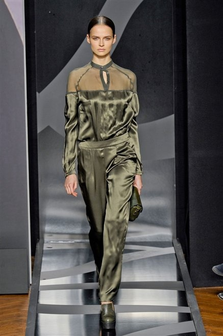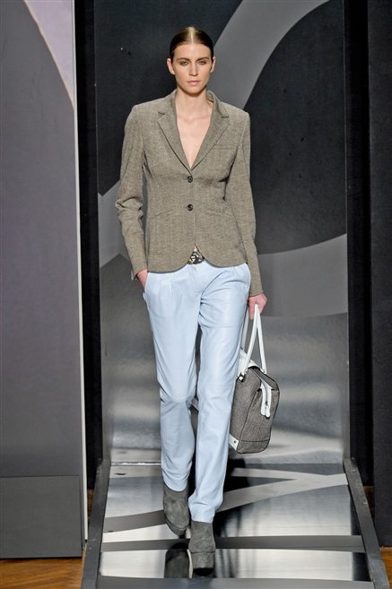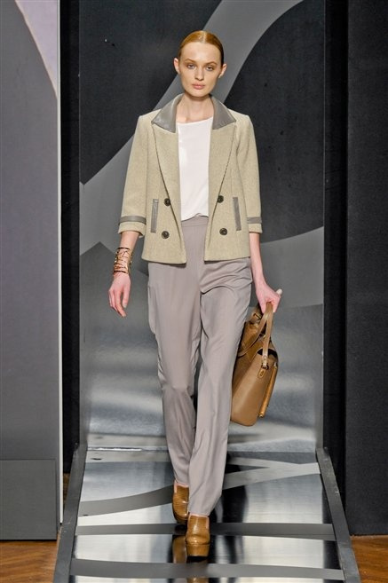 Entrano in passerella con una compassata coda di cavallo, le modelle di Aigner: ma quando lo sguardo si abbassa ecco comparire calzature dalle zeppe vertiginose, la cui silhouette è ingentilita dal disegno di un tacco fatto di preziosi ricami metallici. Tailleur pantalone scamosciato che cade morbido per il giorno, lunghi e leggeri abiti per la sera.