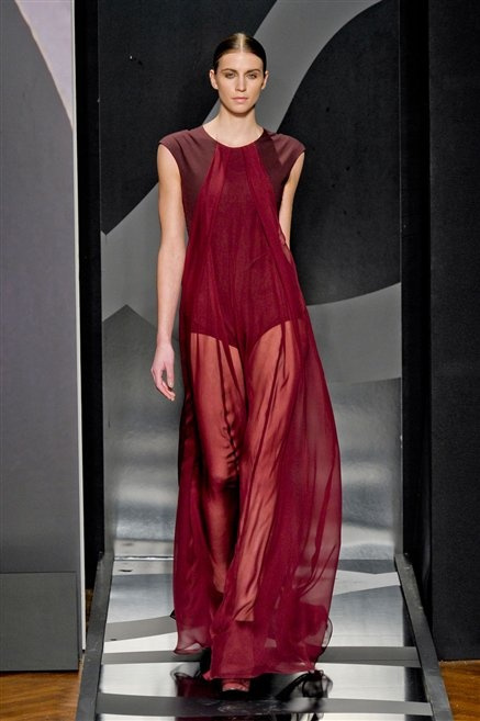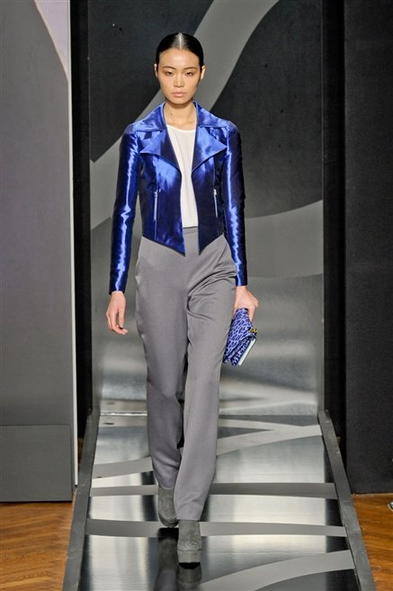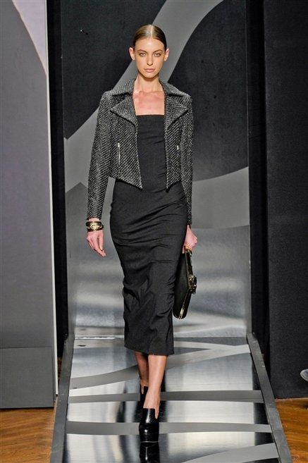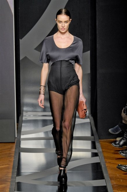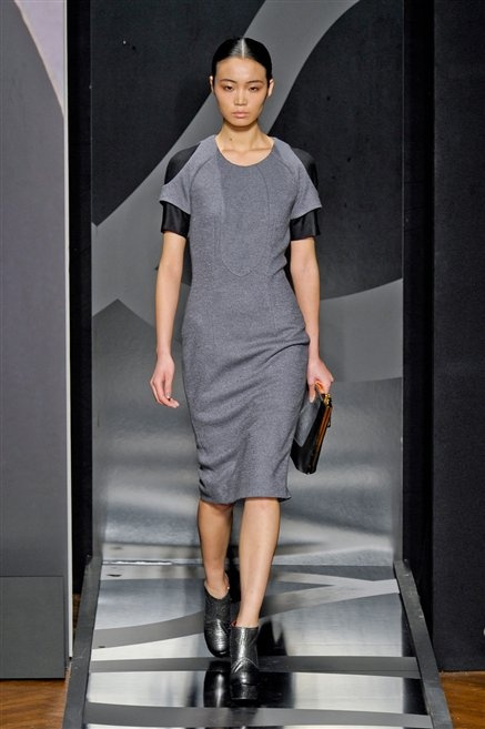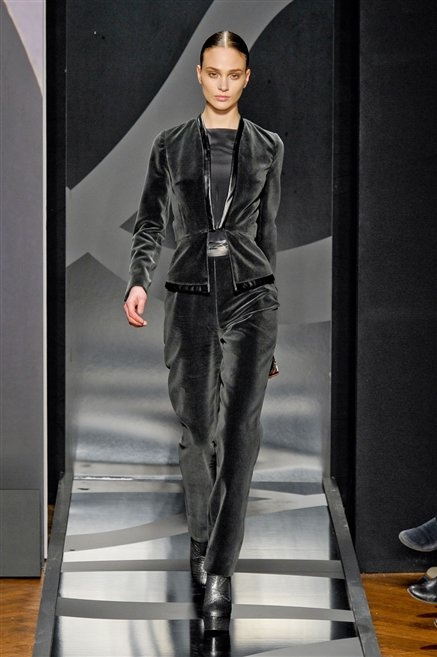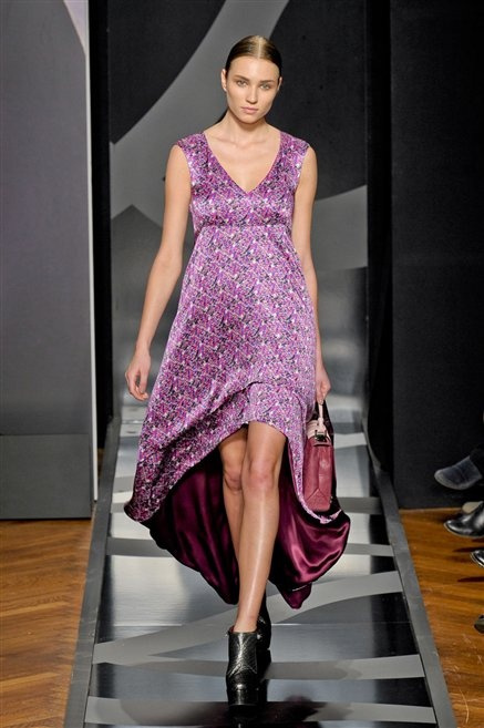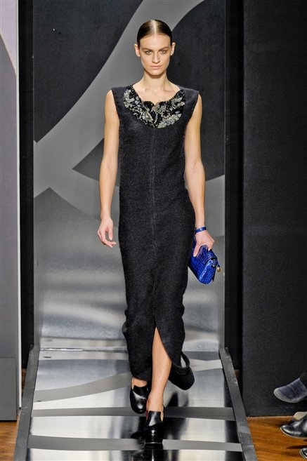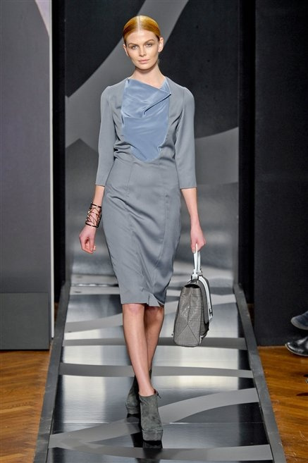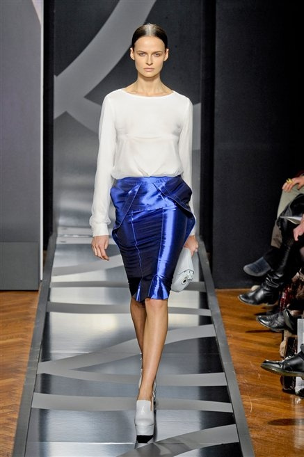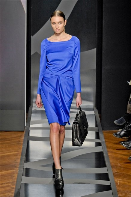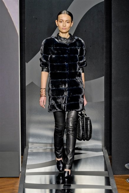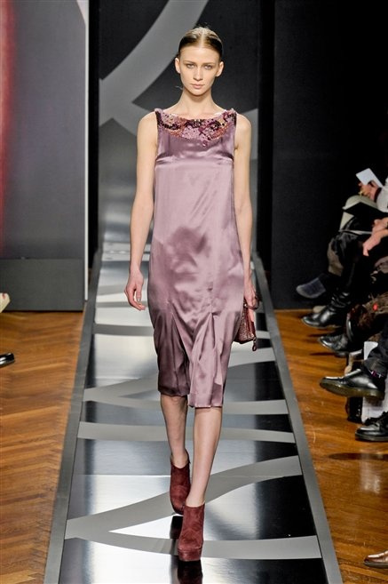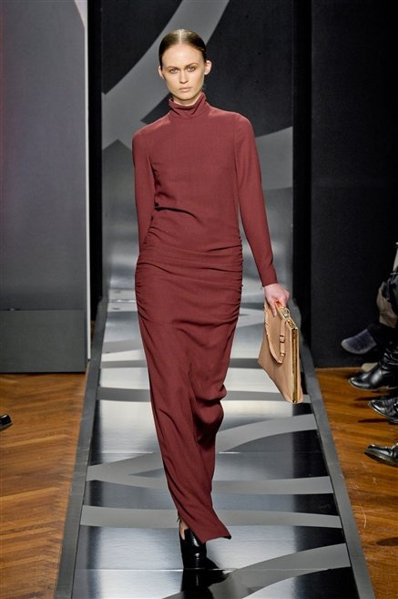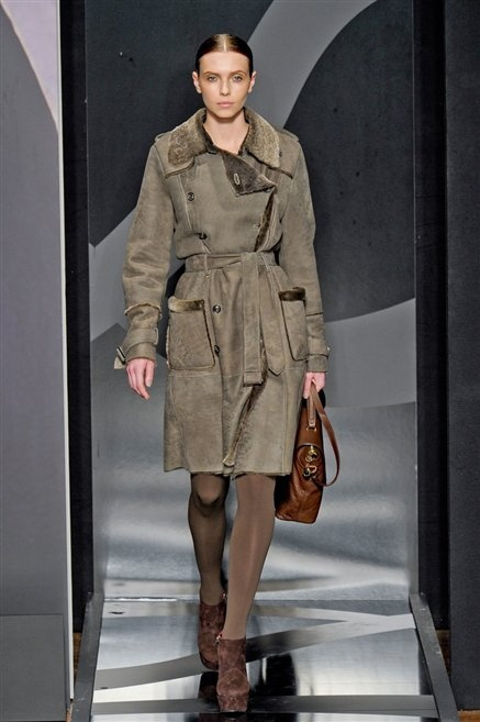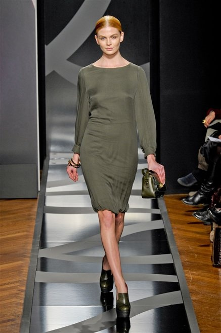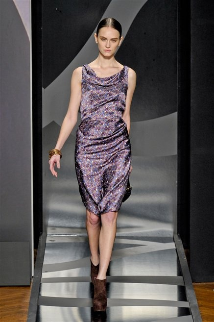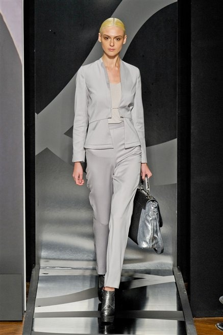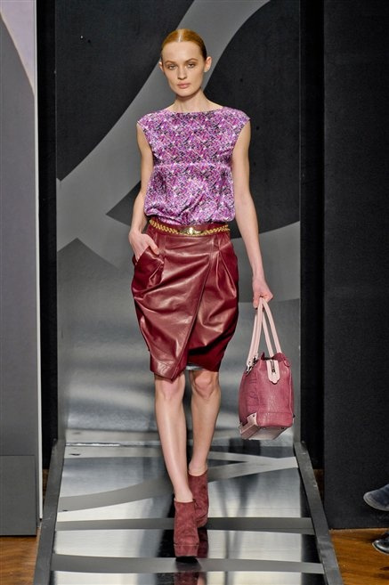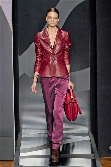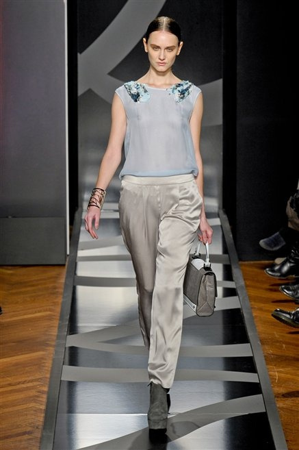 Entrano in passerella con una compassata coda di cavallo, le modelle di Aigner: ma quando lo sguardo si abbassa ecco comparire calzature dalle zeppe vertiginose, la cui silhouette è ingentilita dal disegno di un tacco fatto di preziosi ricami metallici. Tailleur pantalone scamosciato che cade morbido per il giorno, lunghi e leggeri abiti per la sera.