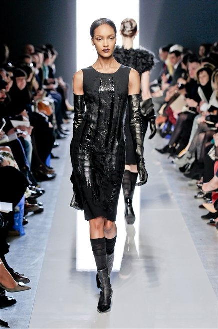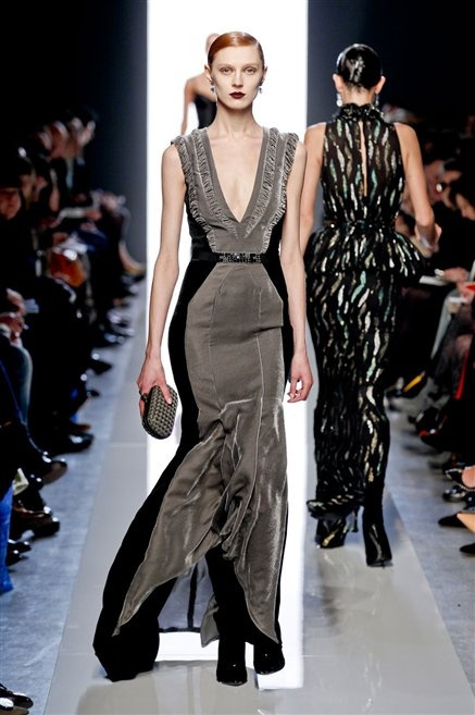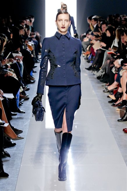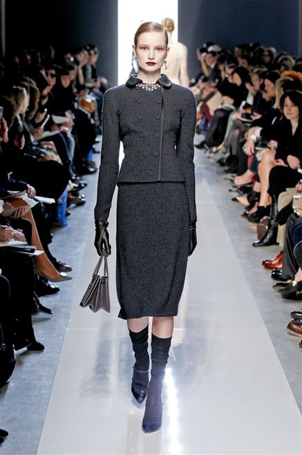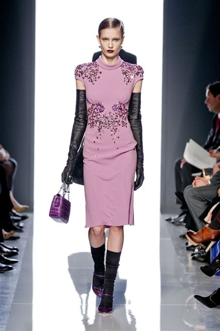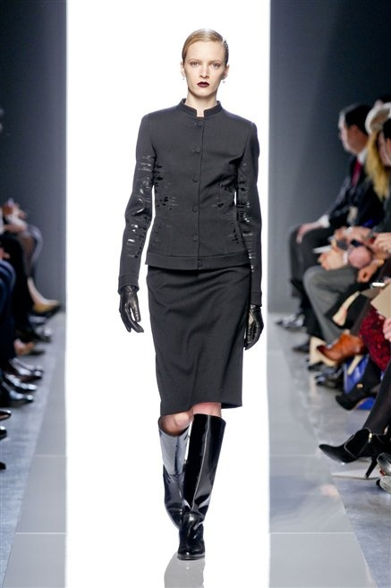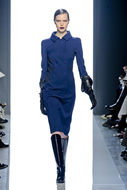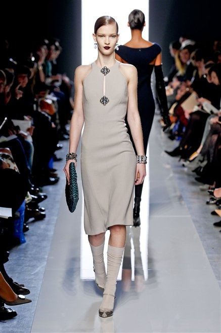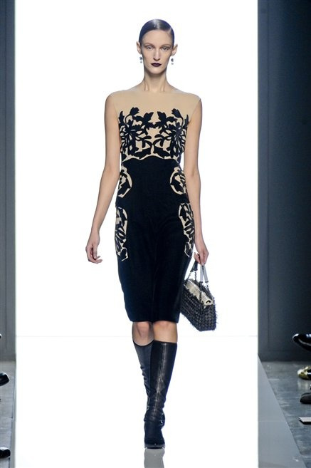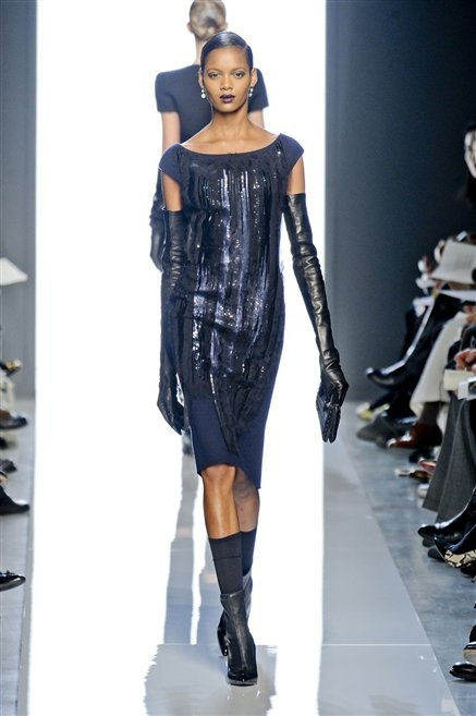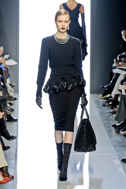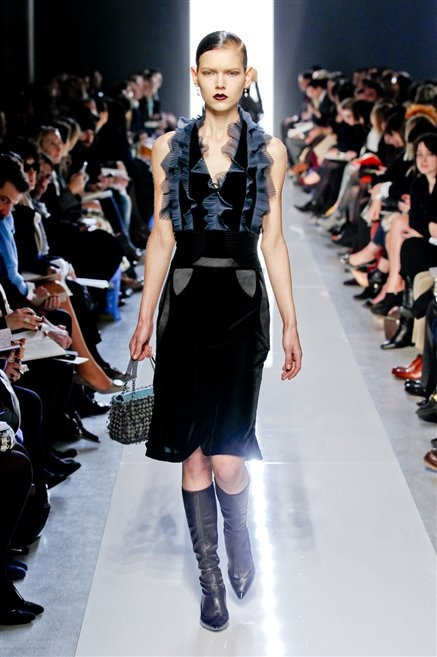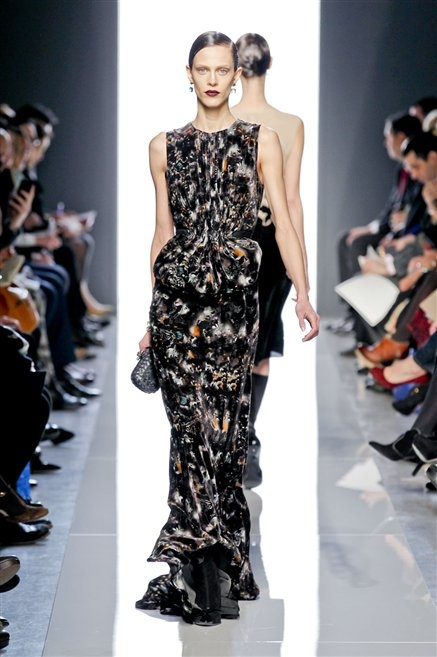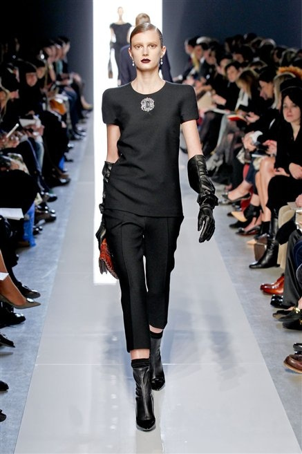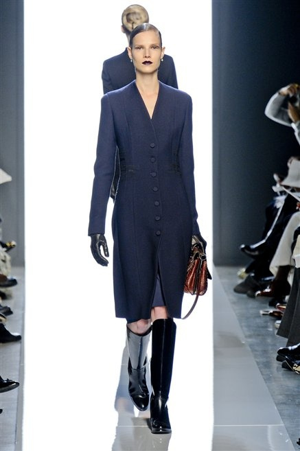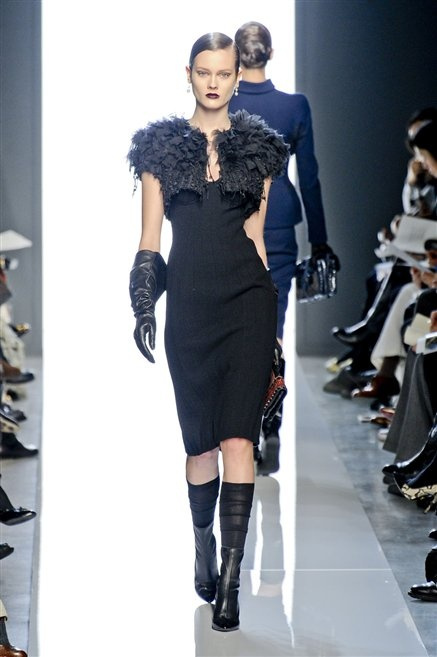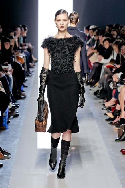 Le protagoniste dei film di Hitchcock oggi indosserebbero la collezione di  Bottega Veneta, un sofisticato rigore stilistico: tubini e cappotti al ginocchio, lunghe file di bottoni che quasi evocano la tunica sacerdotale o chiusure a doppiopetto. Poco spazio per il colore: tra il nero e blu compaiono sulla passerella delle fantasie che ricordano l’action painting di Pollock. Il lusso è la qualità dei materiali e l’attenzione al dettaglio: velluti giapponesi, crêpe di varie fibre intessute fittamente, perle, fili metallici, pietre luminose. Grande attenzione agli accessori: i guanti neri di pelle lunghi ( al quarto giorno di sfilate possiamo dire che sarà trend di stagione), in alcuni casi fin sotto la spalla, stivali bassi leggermente lucidi, Mary Jane ricamate e le preziose borse intrecciate.