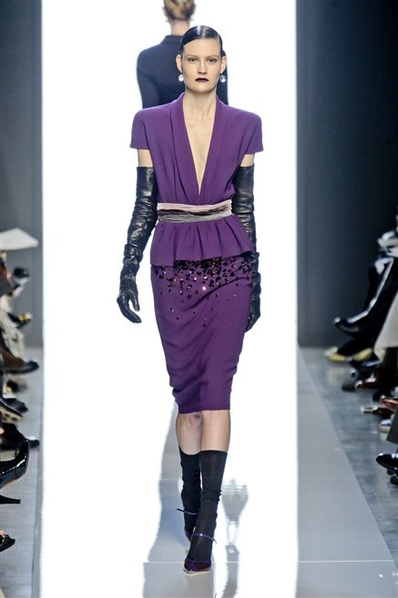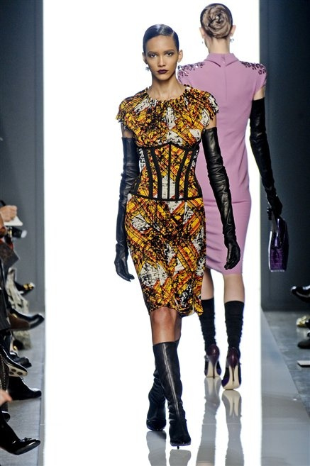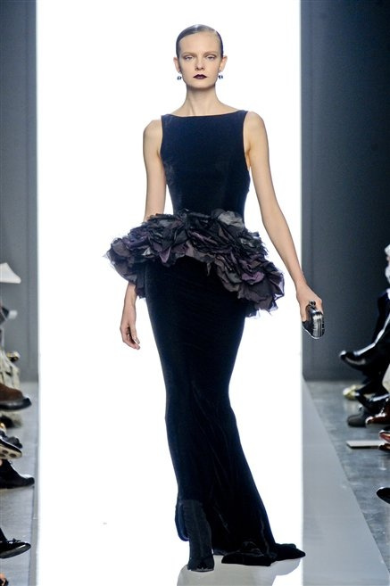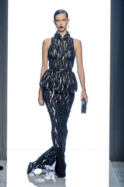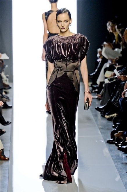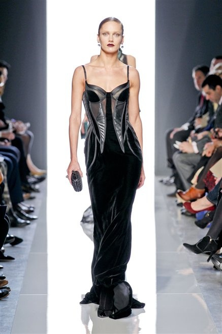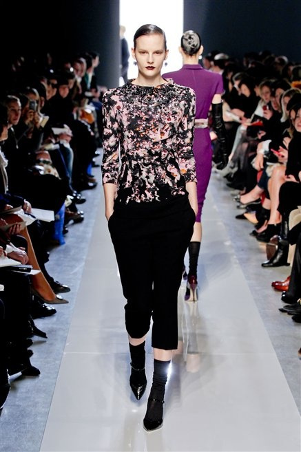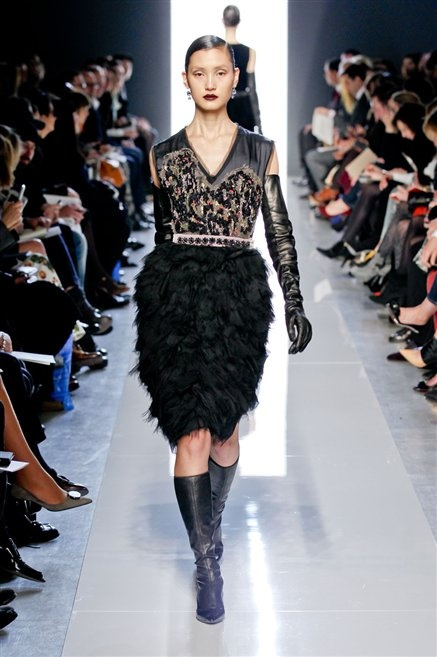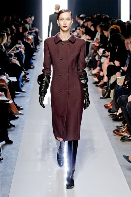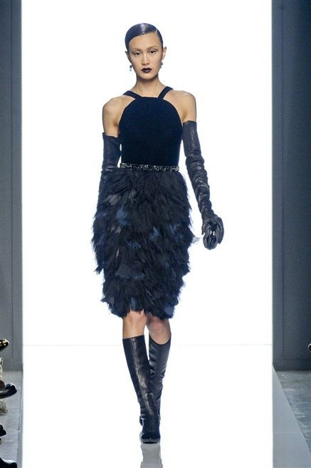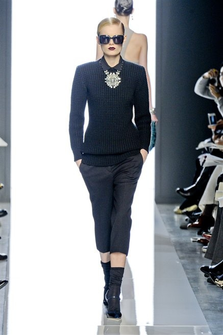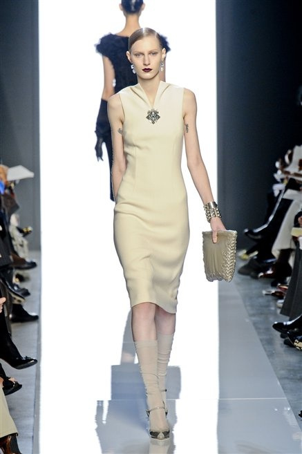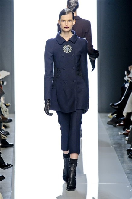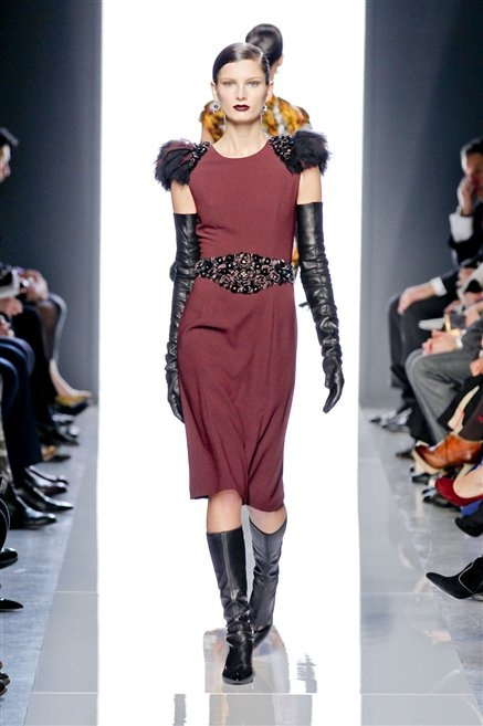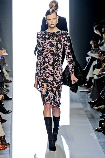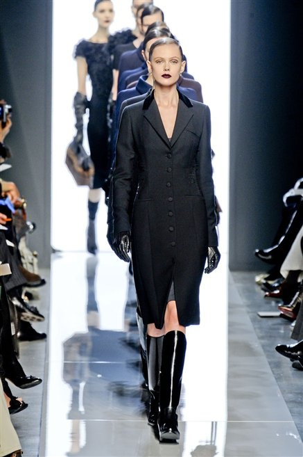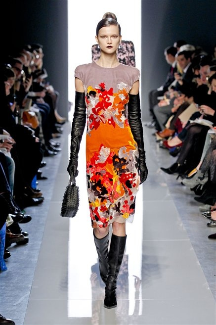 Le protagoniste dei film di Hitchcock oggi indosserebbero la collezione di  Bottega Veneta, un sofisticato rigore stilistico: tubini e cappotti al ginocchio, lunghe file di bottoni che quasi evocano la tunica sacerdotale o chiusure a doppiopetto. Poco spazio per il colore: tra il nero e blu compaiono sulla passerella delle fantasie che ricordano l’action painting di Pollock. Il lusso è la qualità dei materiali e l’attenzione al dettaglio: velluti giapponesi, crêpe di varie fibre intessute fittamente, perle, fili metallici, pietre luminose. Grande attenzione agli accessori: i guanti neri di pelle lunghi ( al quarto giorno di sfilate possiamo dire che sarà trend di stagione), in alcuni casi fin sotto la spalla, stivali bassi leggermente lucidi, Mary Jane ricamate e le preziose borse intrecciate.