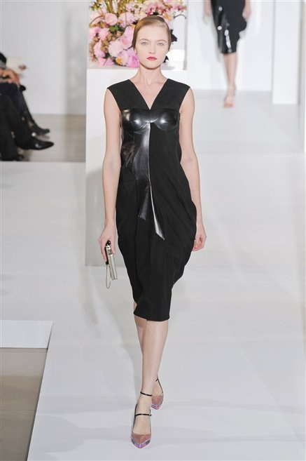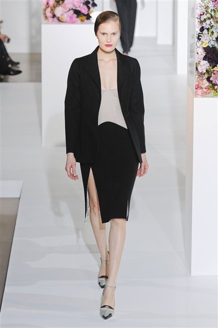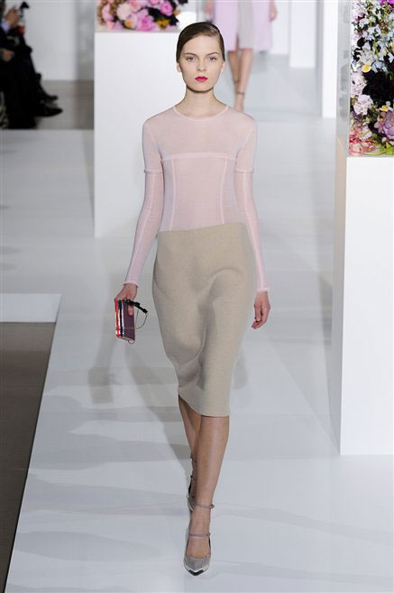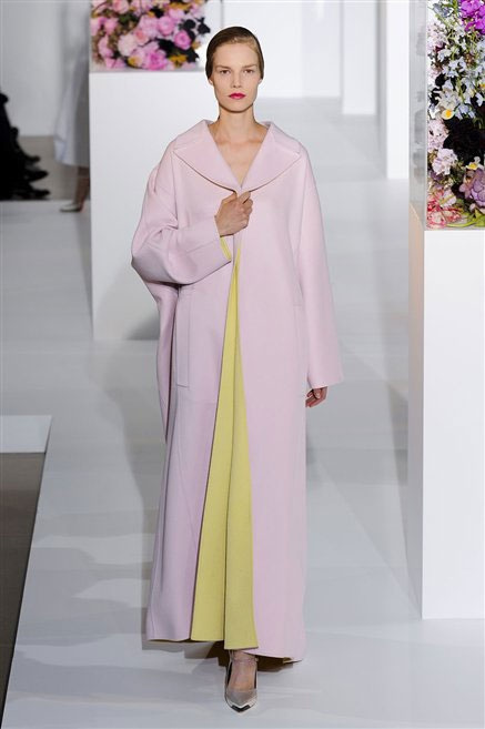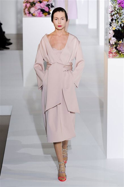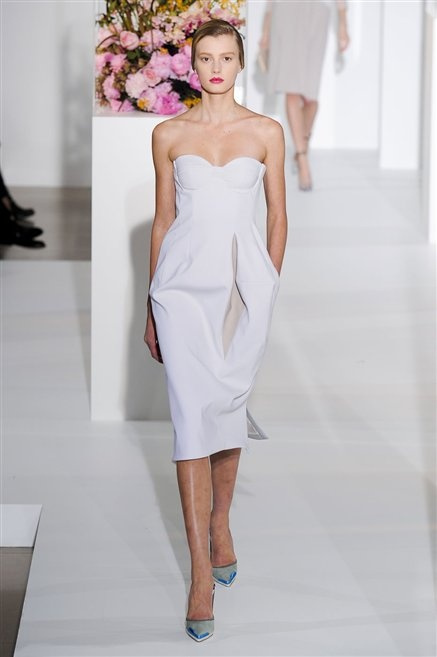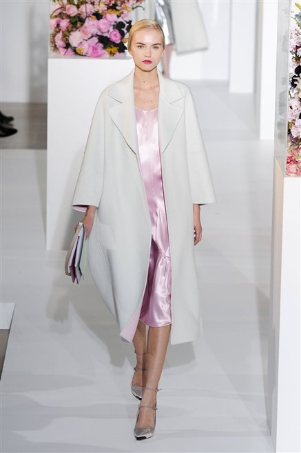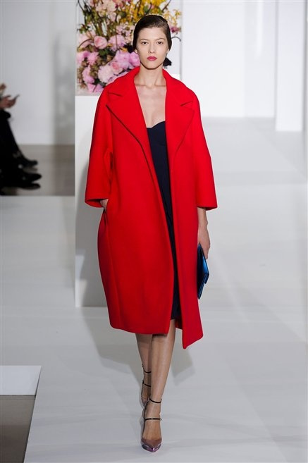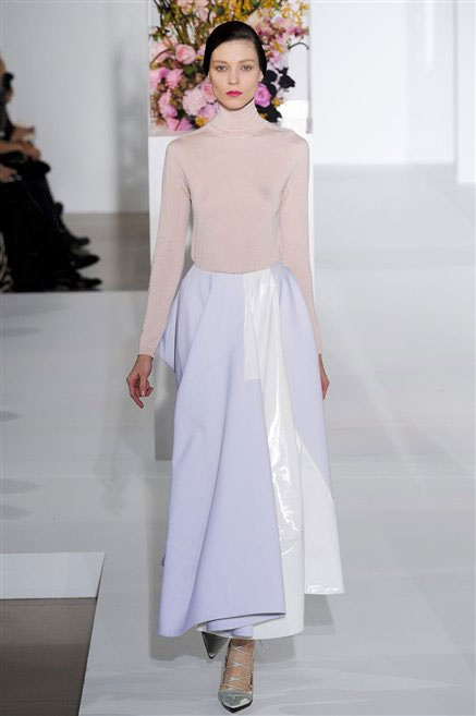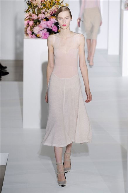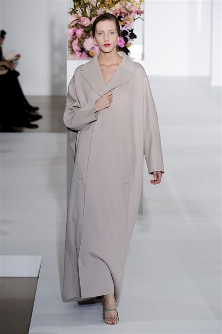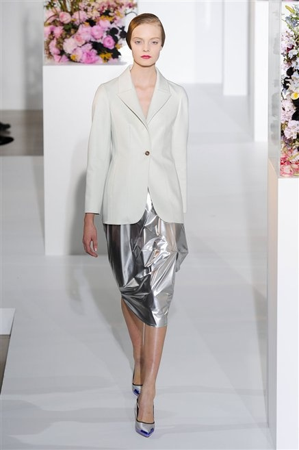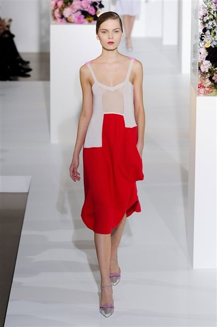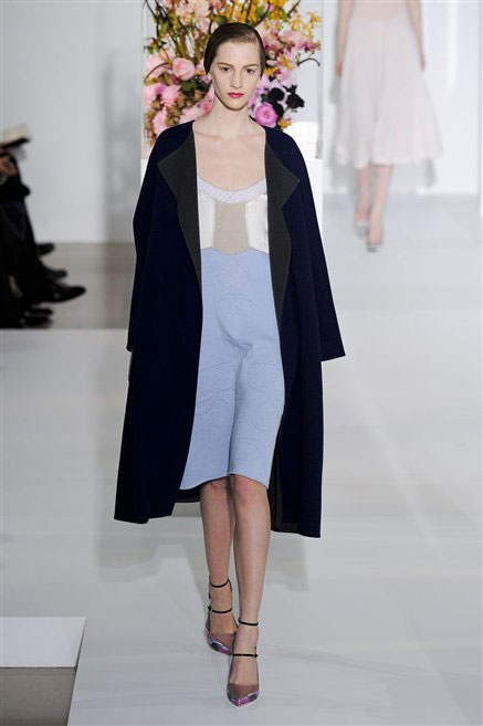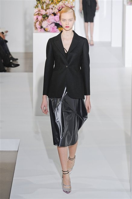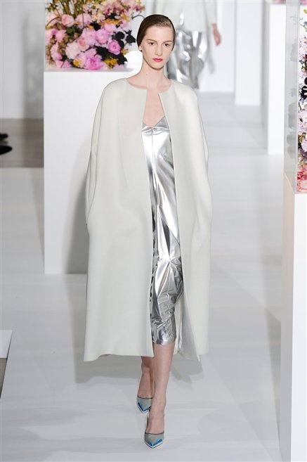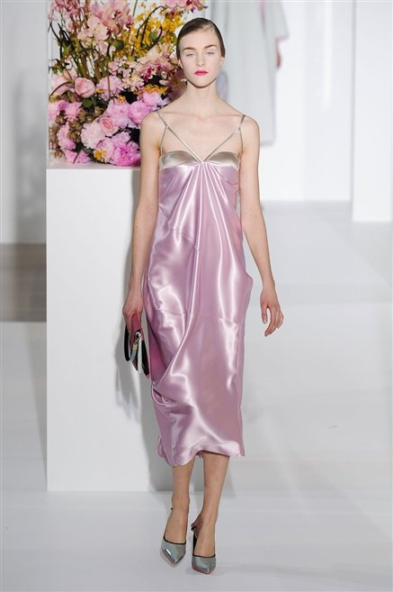 L’ultima collezione di Raf Simons per Jil Sander è una progressione dal non essere all’essere. Si comincia con dei lisci cappotti dal contrasto cromatico tra esterno ed interno e con l’abito color carne che quasi è invisibile. Poi ai colori neutri si aggiungono il rosso, il blu, il nero e infine compare la materia: la pelle che evidenzia il seno e un tessuto quasi plastico. Si parte dai tagli anni ’50, tubini al ginocchio, gonne con le pieghe e si giunge all’abito sottoveste, al jumpsuit dalla vita alzata fin sotto il seno che ridefinisce una nuova silhouette, al corpetto di pelle, ai rivoluzionari volumi fatti di asimmetrie e tagli.