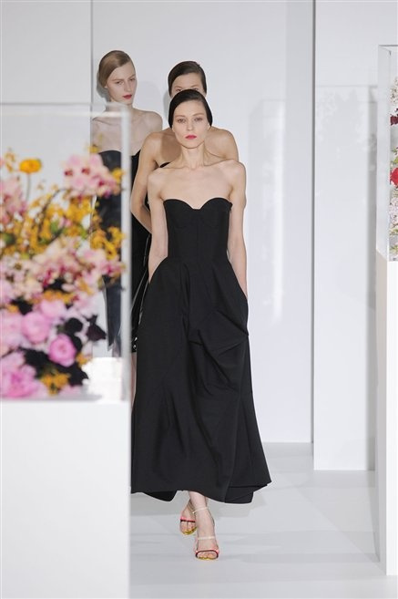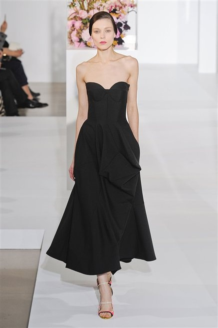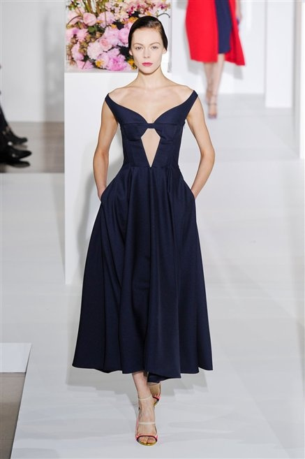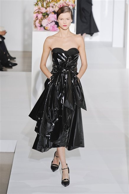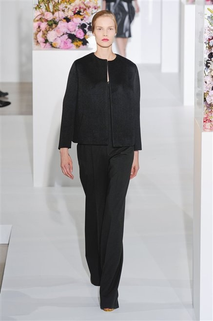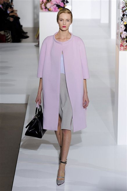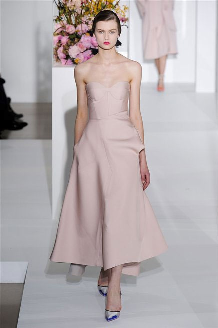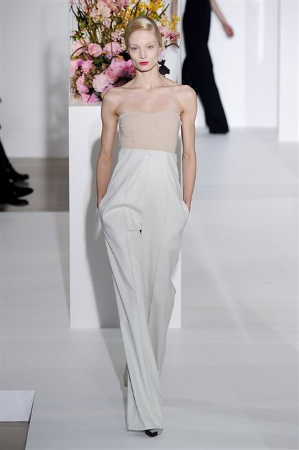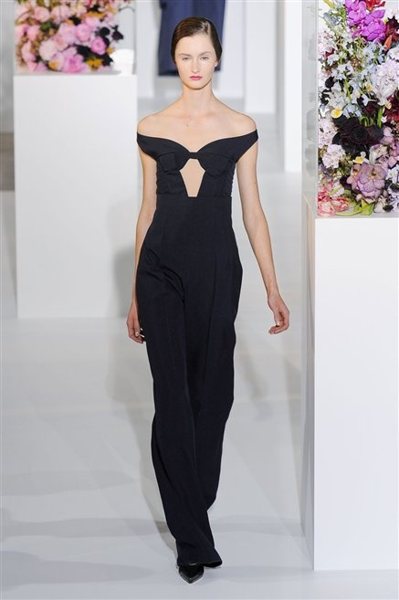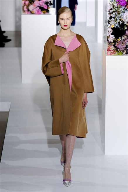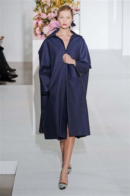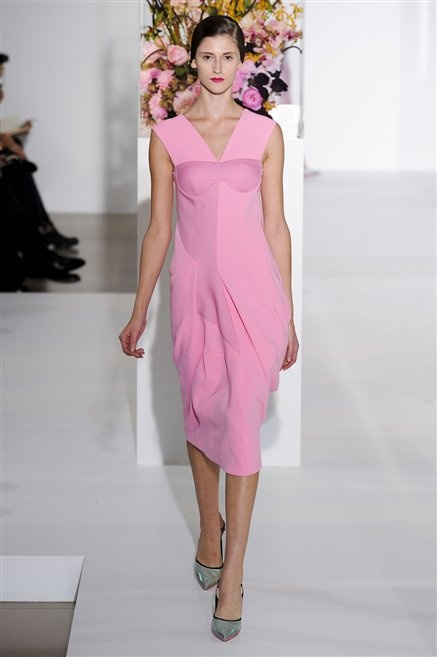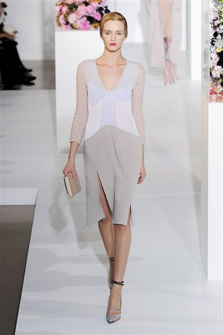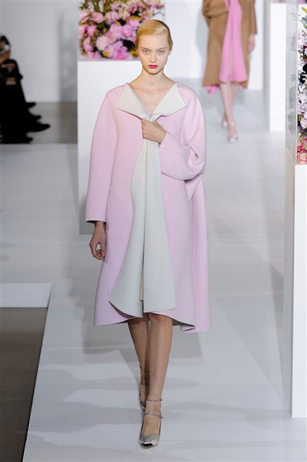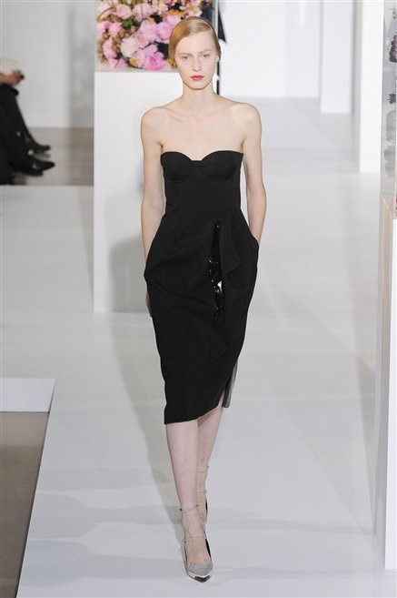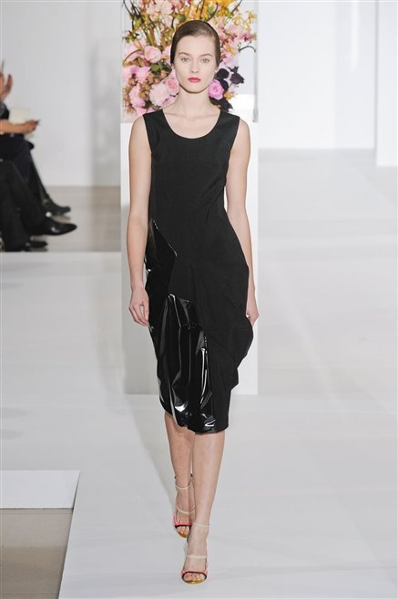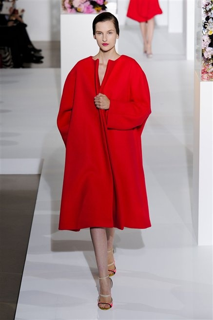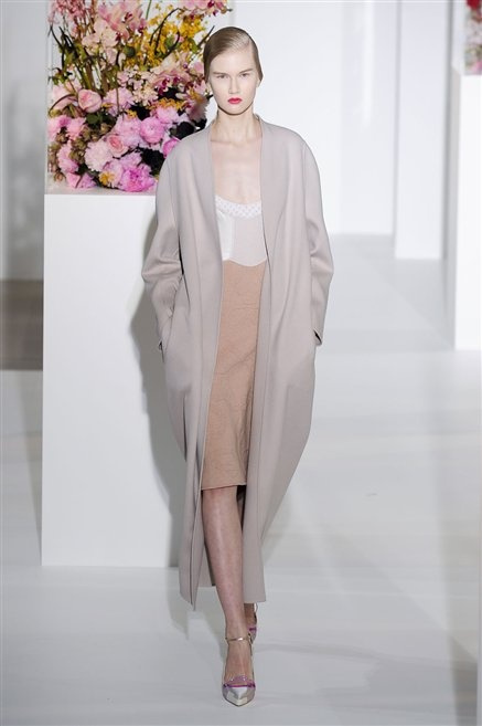 L’ultima collezione di Raf Simons per Jil Sander è una progressione dal non essere all’essere. Si comincia con dei lisci cappotti dal contrasto cromatico tra esterno ed interno e con l’abito color carne che quasi è invisibile. Poi ai colori neutri si aggiungono il rosso, il blu, il nero e infine compare la materia: la pelle che evidenzia il seno e un tessuto quasi plastico. Si parte dai tagli anni ’50, tubini al ginocchio, gonne con le pieghe e si giunge all’abito sottoveste, al jumpsuit dalla vita alzata fin sotto il seno che ridefinisce una nuova silhouette, al corpetto di pelle, ai rivoluzionari volumi fatti di asimmetrie e tagli.
