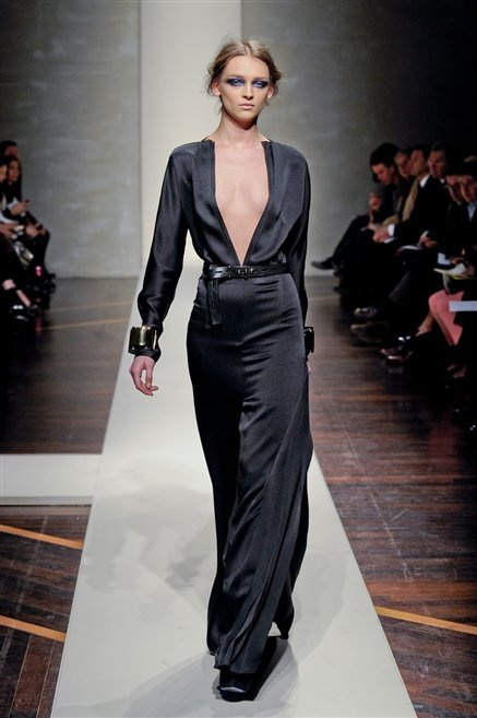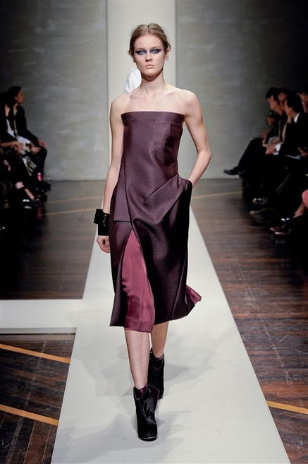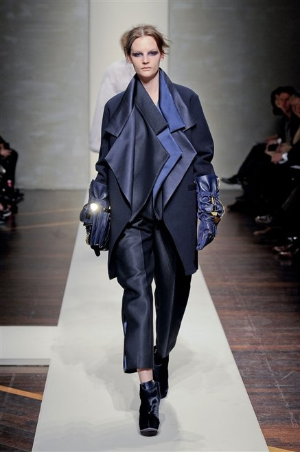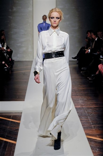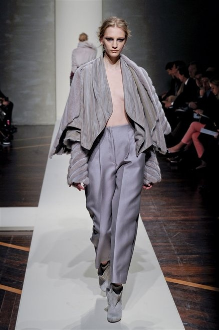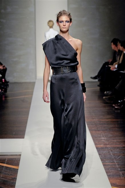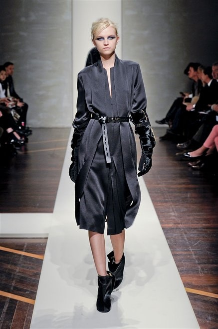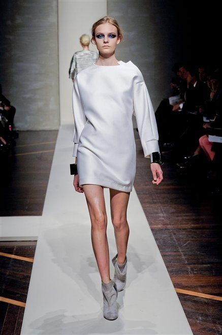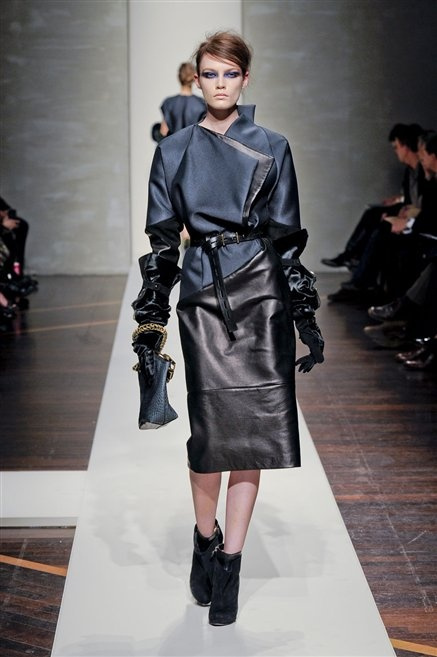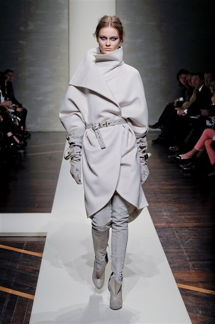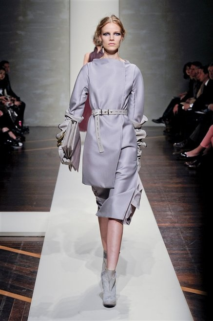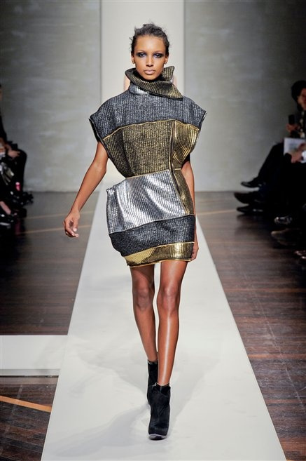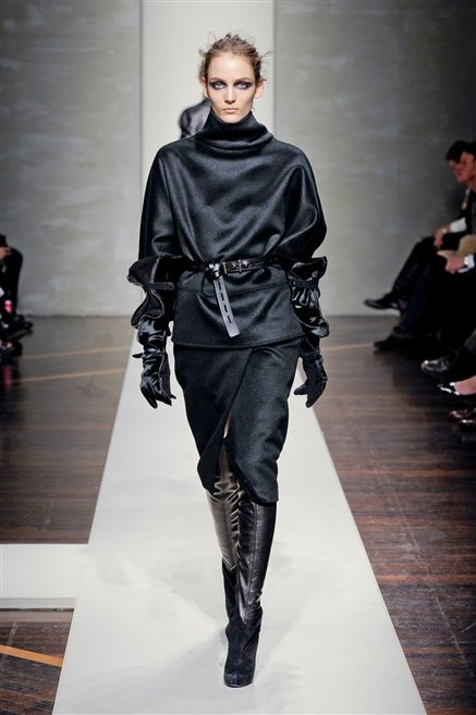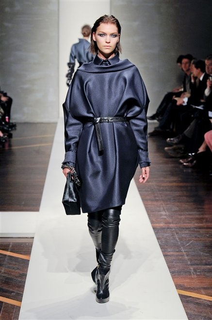 Alla loro seconda collezione Federico Piaggi e Stefano Citron reinterpretano in chiave moderna il senso della costruzione dell’architetto Gianfranco Ferrè. Non esistono bottoni, i tessuti sono appoggiati: le giacche, le maglie e i cappotti avvolgono il corpo creando un gioco di ampiezze e asimmetrie, i reverse della giacca si moltiplicano o tagliano trasversalmente il petto, gli abiti corti sono rettangoli di tessuto poggiati l’uno sull’altro come mattoni (non a caso si tratta di un materiale dall’effetto metallico). Gli abiti da sera sono lunghi, modello impero. Solo una sottile cintura annodata infrange questa pulizia grafica e cromatica: bianco, nero, beige, blu navy, e rigidi bracciali argento.