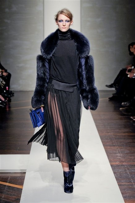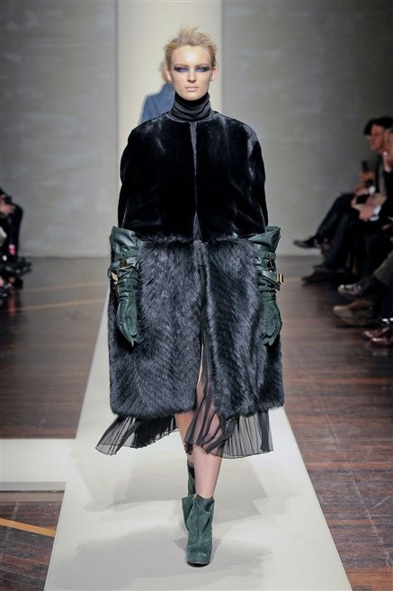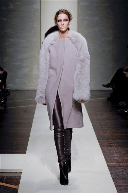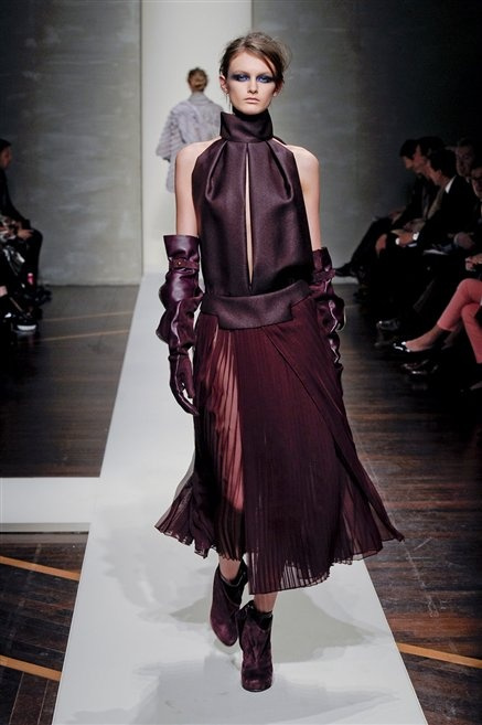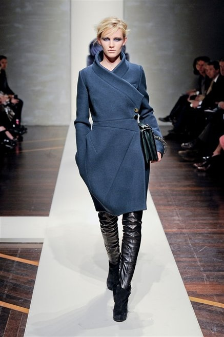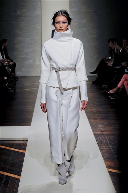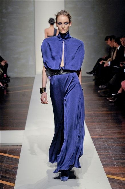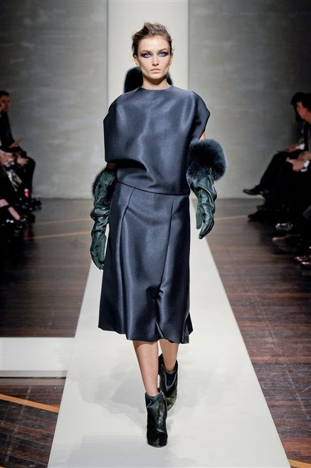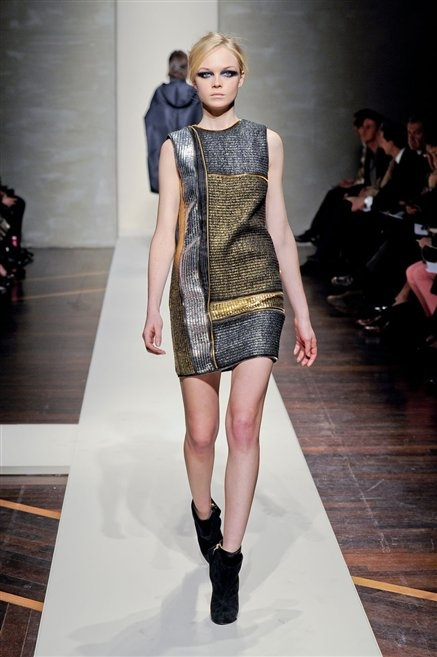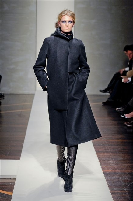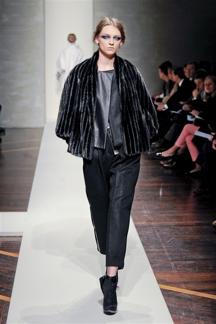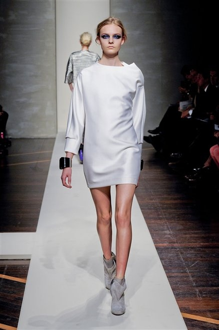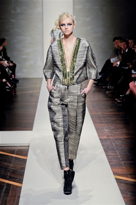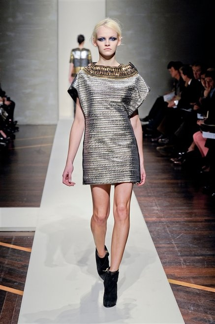Alla loro seconda collezione Federico Piaggi e Stefano Citron reinterpretano in chiave moderna il senso della costruzione dell’architetto Gianfranco Ferrè. Non esistono bottoni, i tessuti sono appoggiati: le giacche, le maglie e i cappotti avvolgono il corpo creando un gioco di ampiezze e asimmetrie, i reverse della giacca si moltiplicano o tagliano trasversalmente il petto, gli abiti corti sono rettangoli di tessuto poggiati l’uno sull’altro come mattoni (non a caso si tratta di un materiale dall’effetto metallico). Gli abiti da sera sono lunghi, modello impero. Solo una sottile cintura annodata infrange questa pulizia grafica e cromatica: bianco, nero, beige, blu navy, e rigidi bracciali argento.