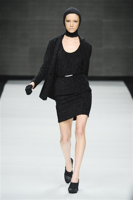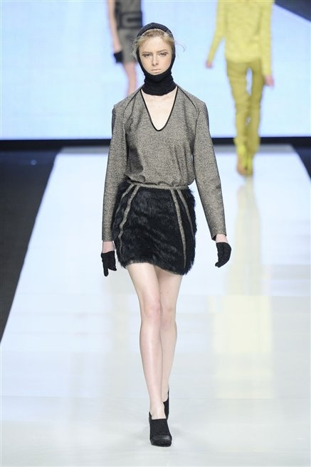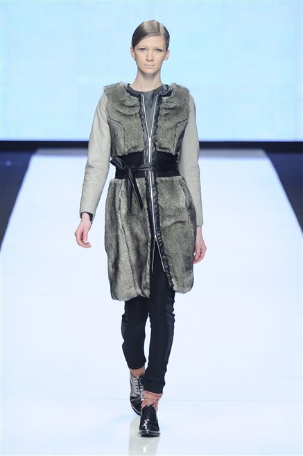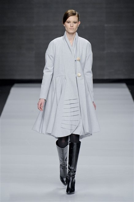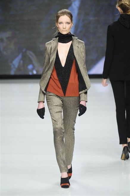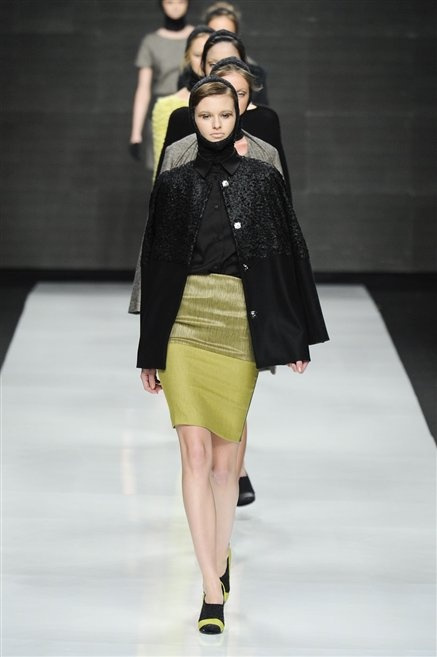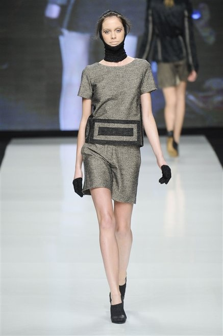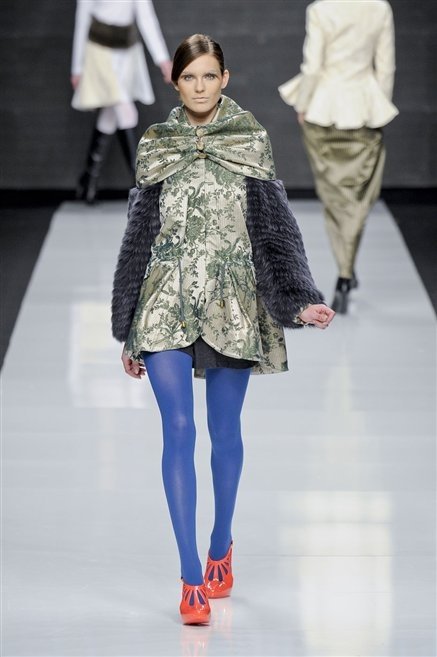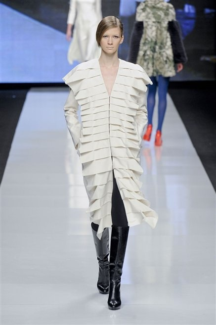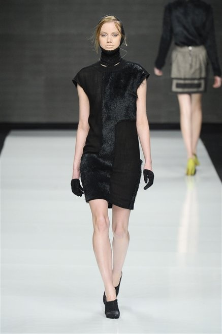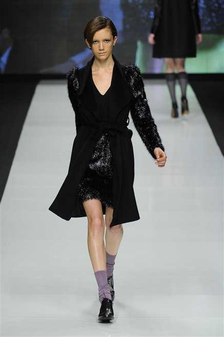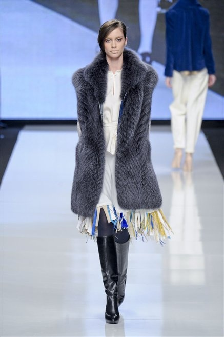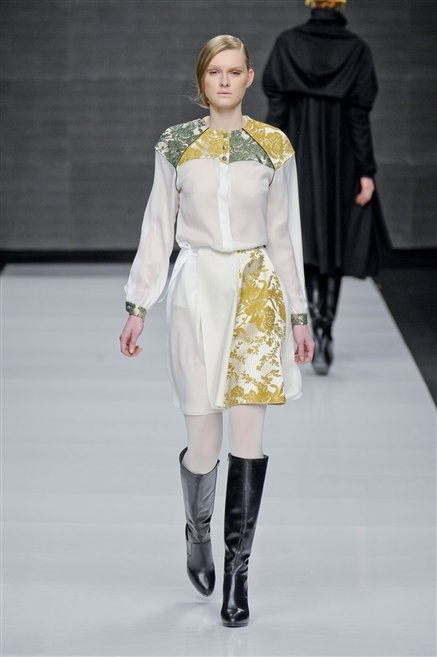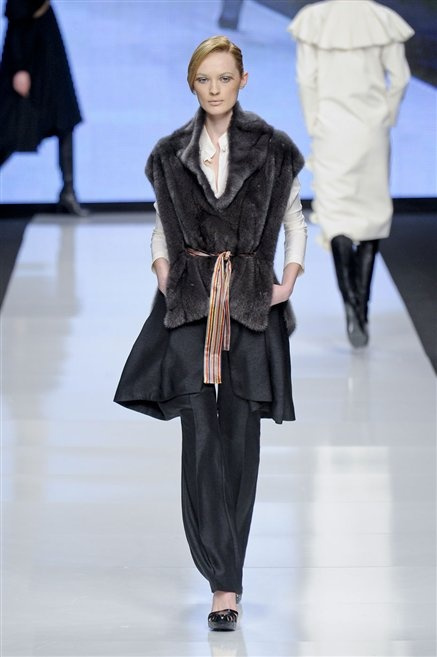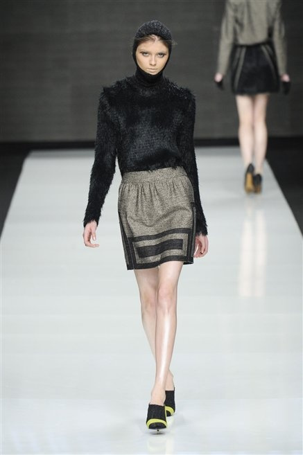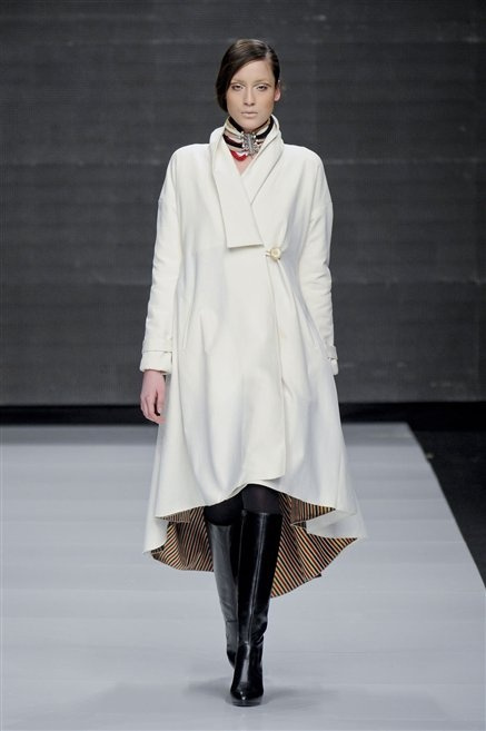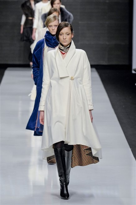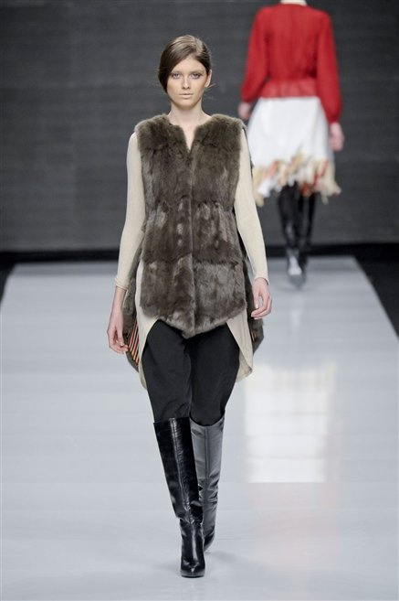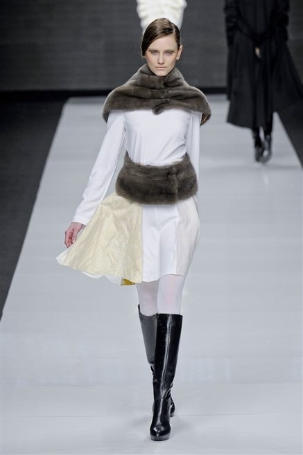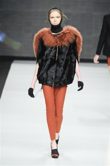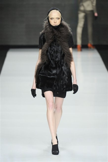 Capo fasciato da un cappuccio come le armature dei Crociati a cui Mauro Gasperi ruba anche l’oro e l’argento ed ecco arrivare sulla passerella una donna da Medioevo metropolitano. Il corpo è fasciato come quello dei soldati, ma sono lana cotta e pelliccia (astrakan) ad avvolgere la figura femminile in costruzioni che giocano con i tagli diagonali, incroci e asimmetrie. Ai piedi sandali indossata con un fantasmino di lana a vista.