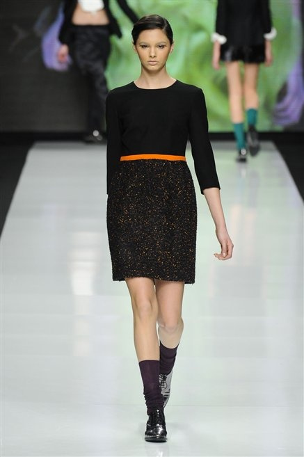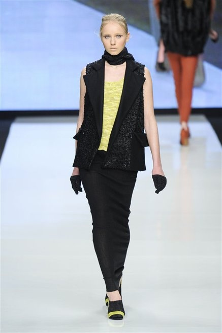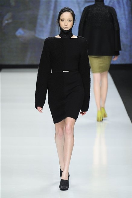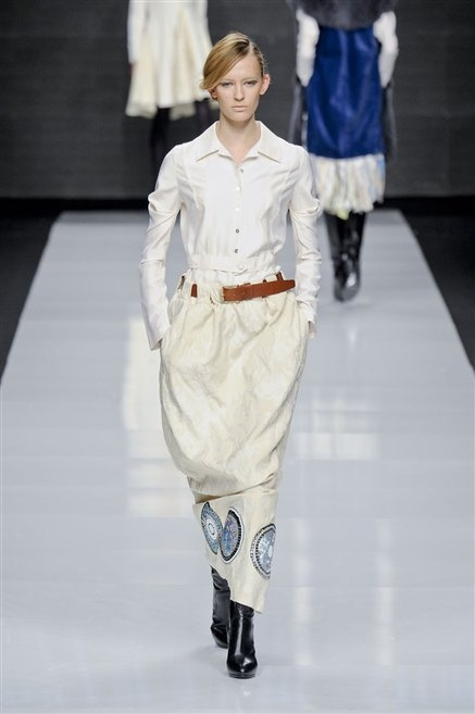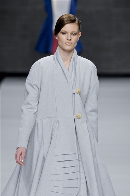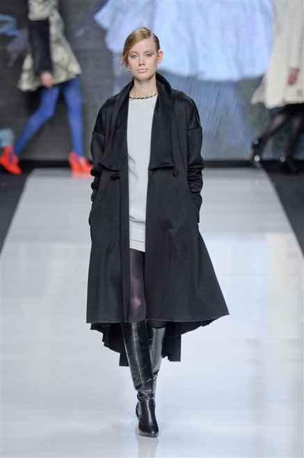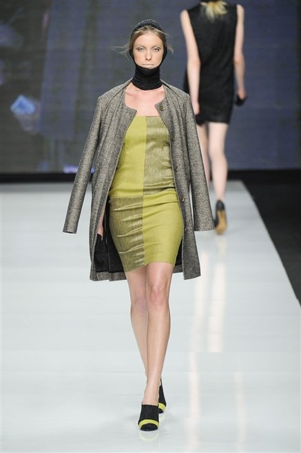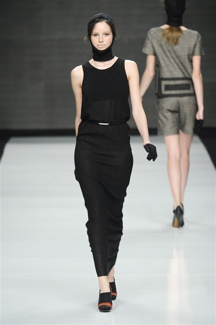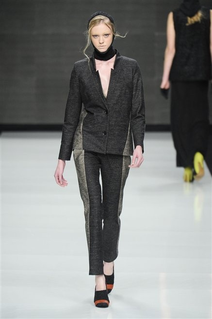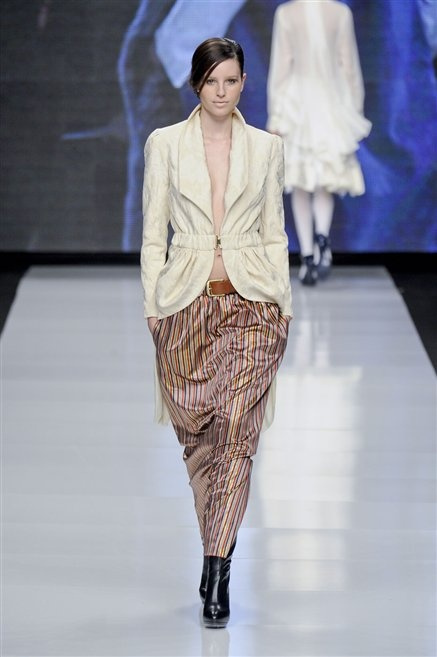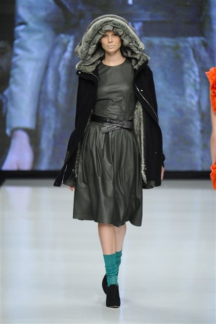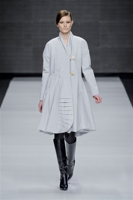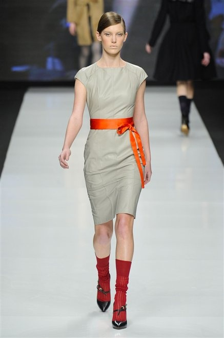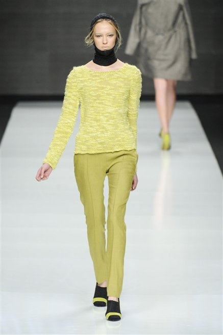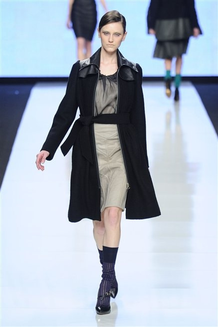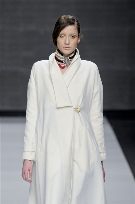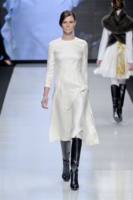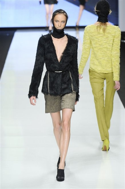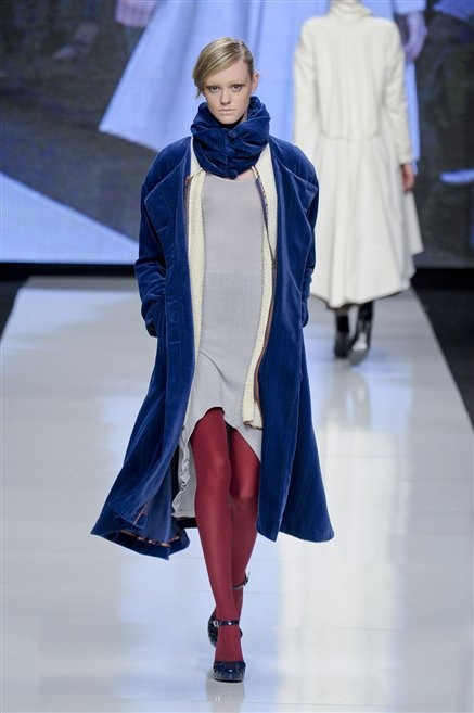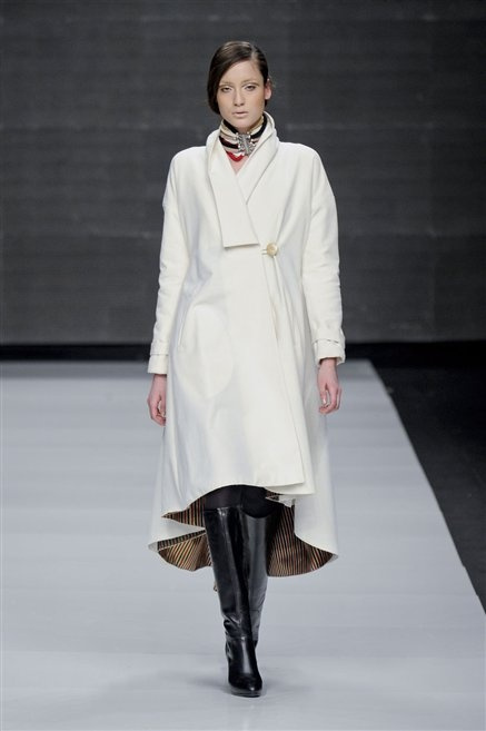Capo fasciato da un cappuccio come le armature dei Crociati a cui Mauro Gasperi ruba anche l’oro e l’argento ed ecco arrivare sulla passerella una donna da Medioevo metropolitano. Il corpo è fasciato come quello dei soldati, ma sono lana cotta e pelliccia (astrakan) ad avvolgere la figura femminile in costruzioni che giocano con i tagli diagonali, incroci e asimmetrie. Ai piedi sandali indossata con un fantasmino di lana a vista.