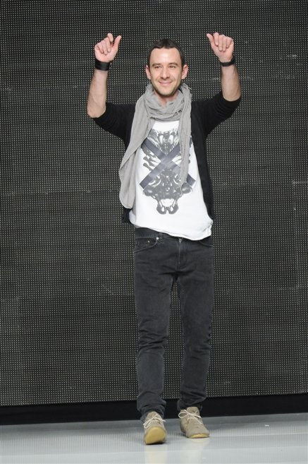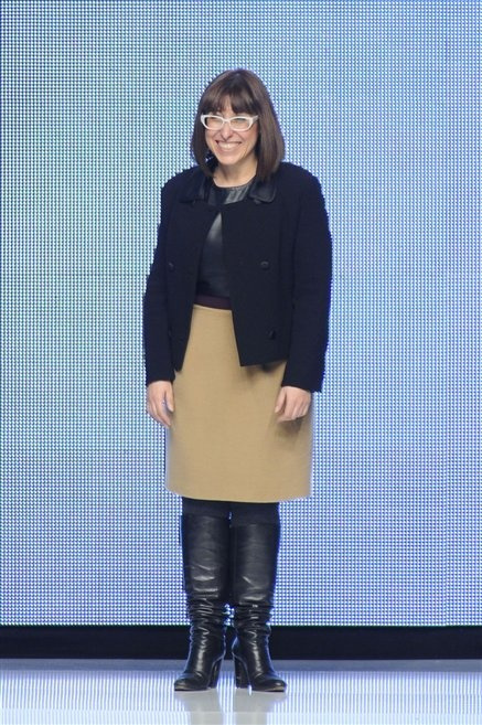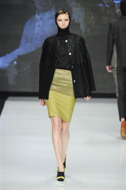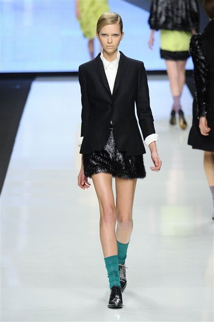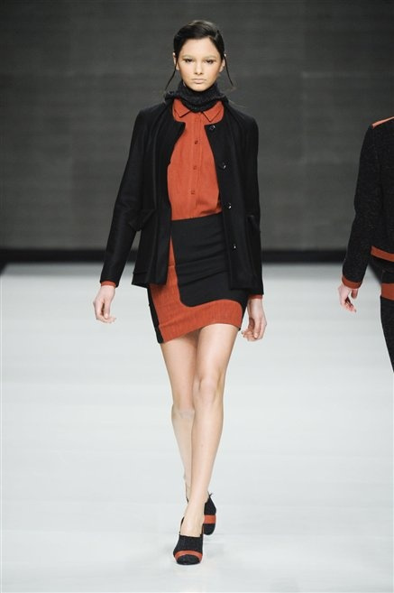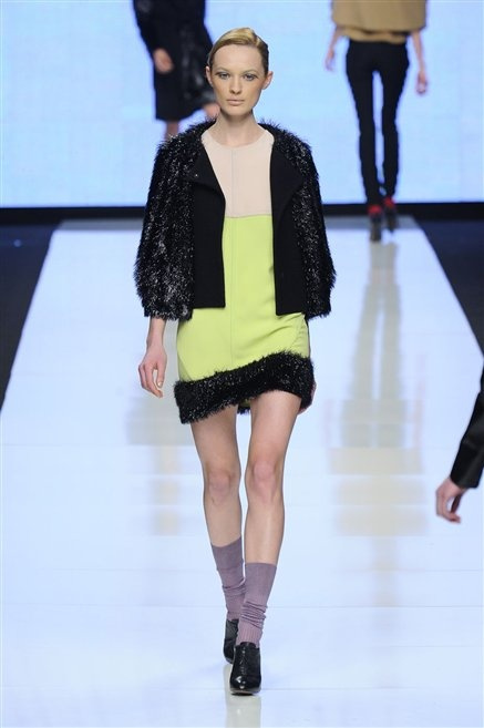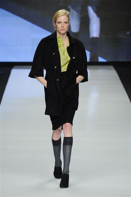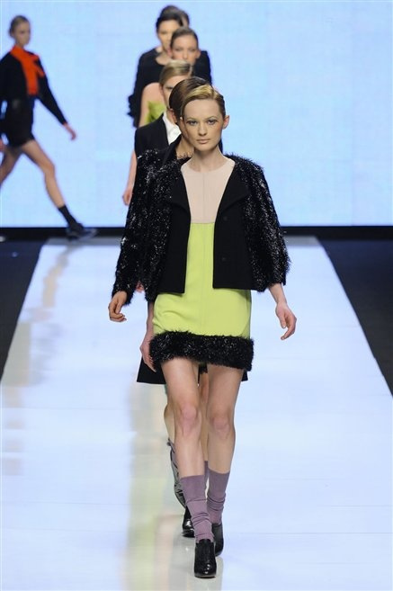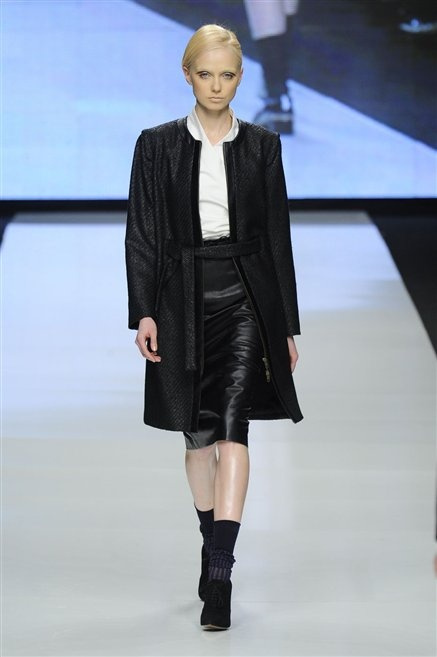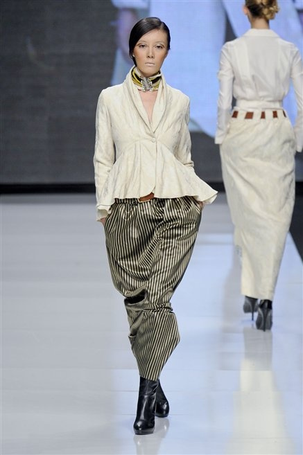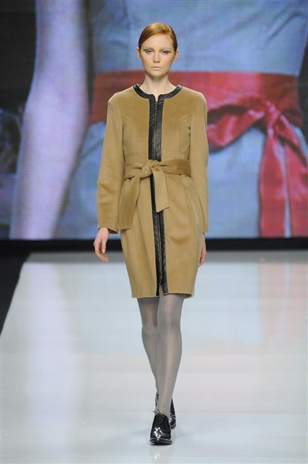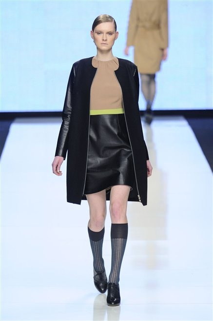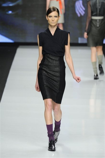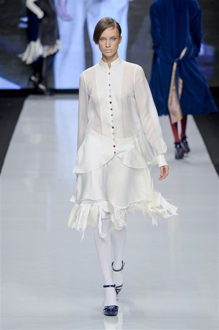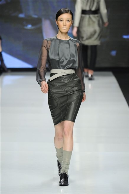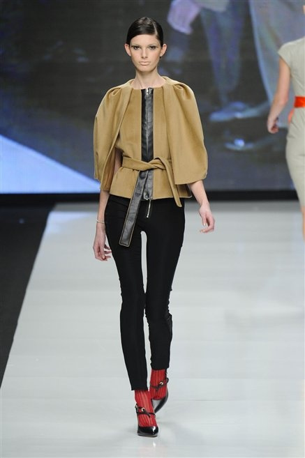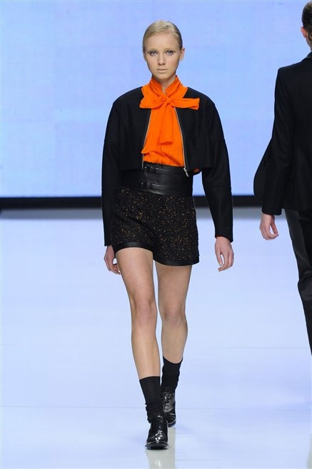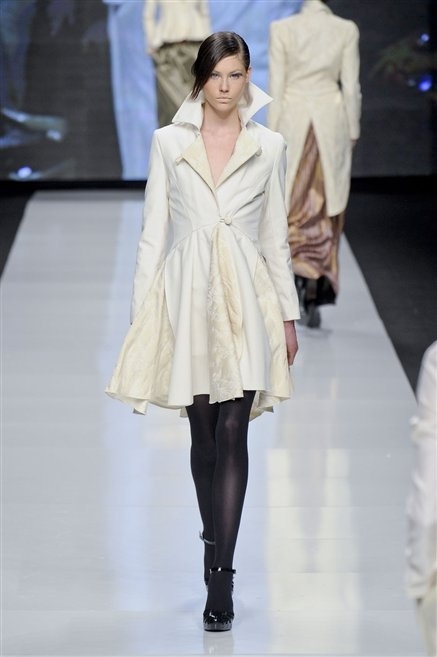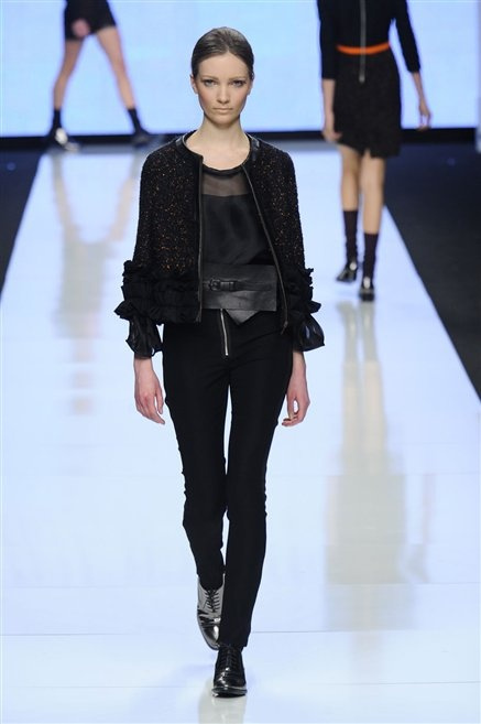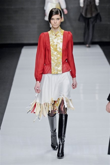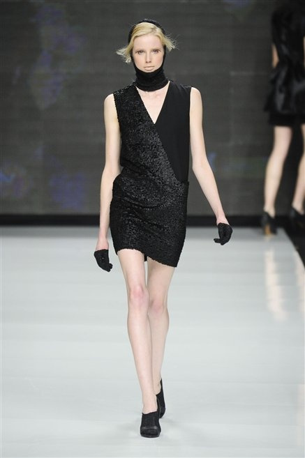Capo fasciato da un cappuccio come le armature dei Crociati a cui Mauro Gasperi ruba anche l’oro e l’argento ed ecco arrivare sulla passerella una donna da Medioevo metropolitano. Il corpo è fasciato come quello dei soldati, ma sono lana cotta e pelliccia (astrakan) ad avvolgere la figura femminile in costruzioni che giocano con i tagli diagonali, incroci e asimmetrie. Ai piedi sandali indossata con un fantasmino di lana a vista.