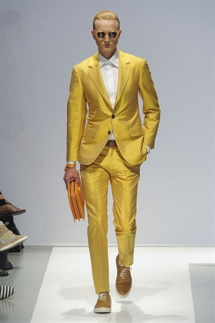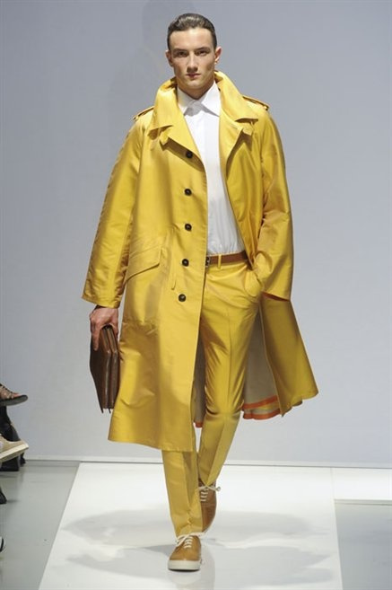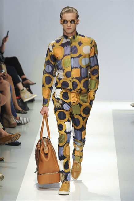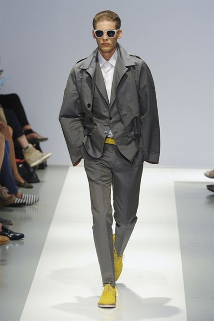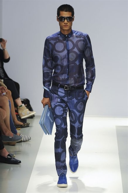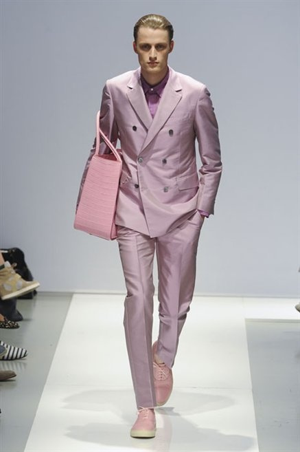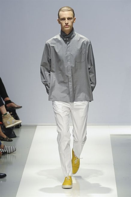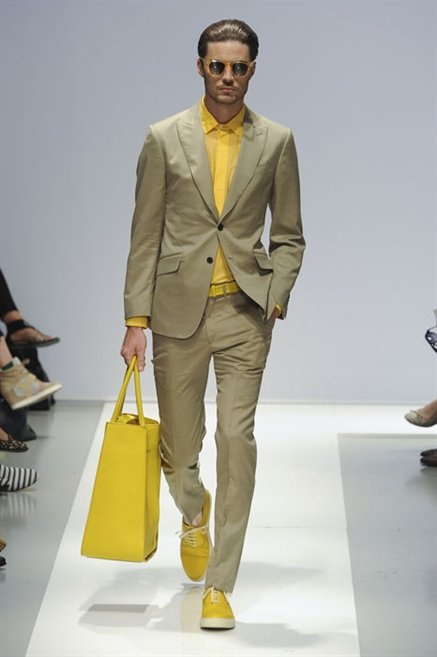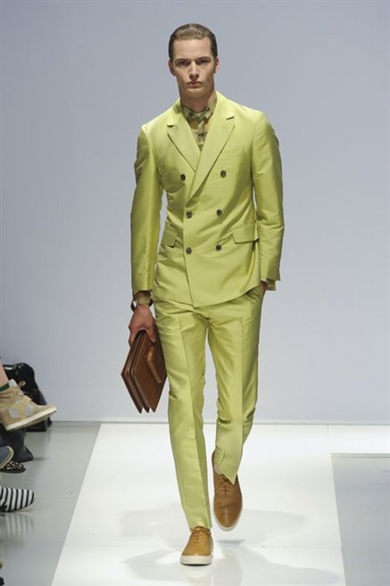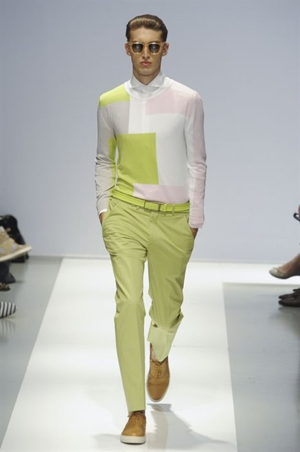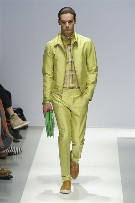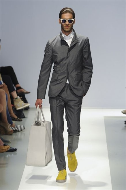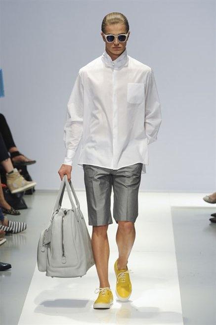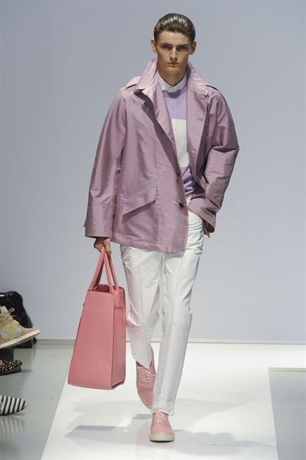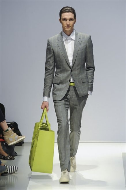 Per la prossima primavera/estate Fiona Cibani e Ian Hylton realizzano una collezione all’insegna della freschezza. Prima per i volumi ampi della camicia bianca che diventa un capo cult, con le maniche trapezoidali tagliate al gomito o leggermente scivolate a metà coscia; poi c’è il colore: il giallo, il lime, il viola, il rosa, anche nelle stampe che sembrano rappresentare grandi bolle, non a caso spesso si tratta di tessuti trasparenti; la silhouette è giovane, asciutta, ma comoda, il taglio degli abiti è preciso e slancia la figura. Gli accessori invece ricordano a quest’uomo così proiettato verso la leggerezza della bella stagione che gli impegni incombono, così eccolo tenere in mano dei portadocumenti di pelle rigorosamente in coordinato con il resto dell’outfit.