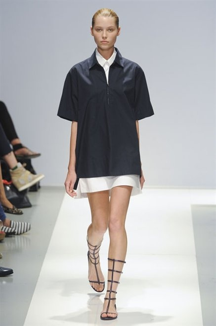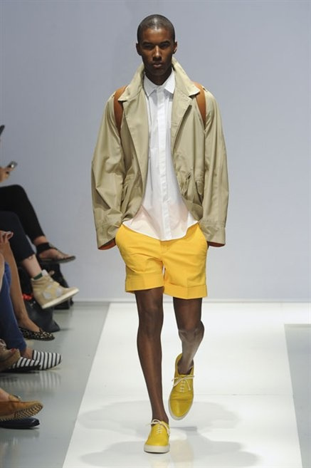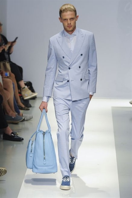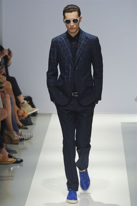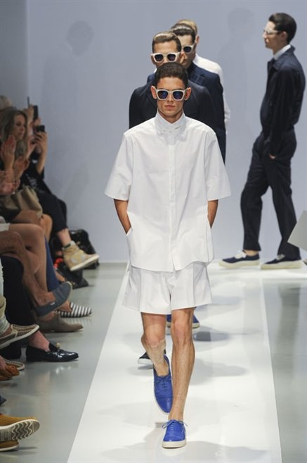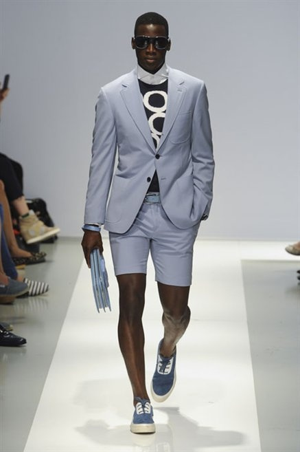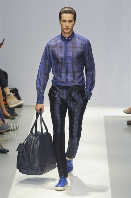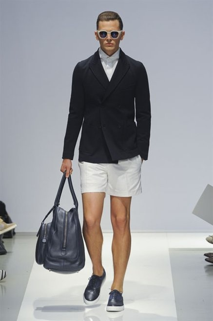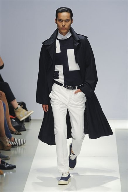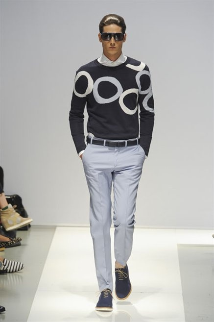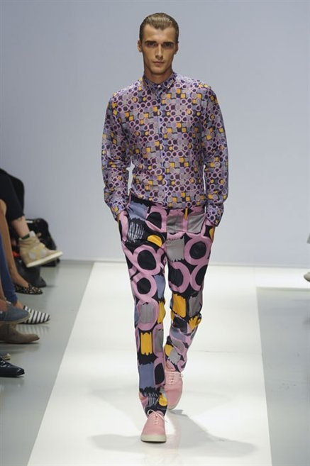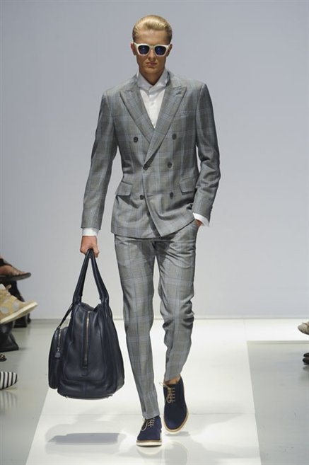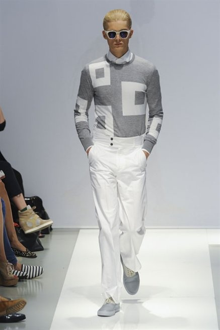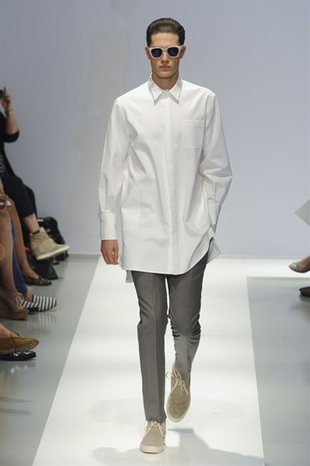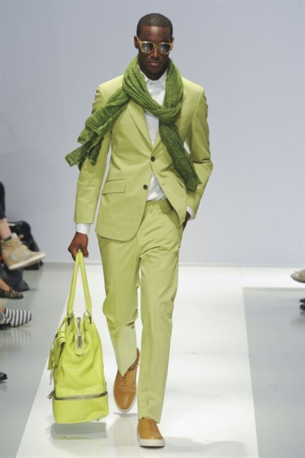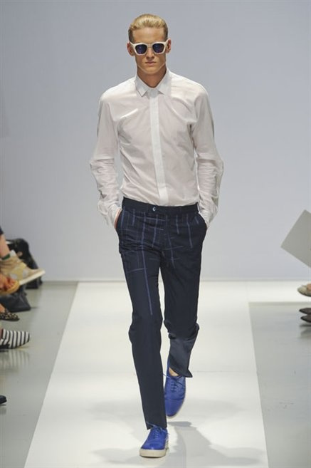 Per la prossima primavera/estate Fiona Cibani e Ian Hylton realizzano una collezione all’insegna della freschezza. Prima per i volumi ampi della camicia bianca che diventa un capo cult, con le maniche trapezoidali tagliate al gomito o leggermente scivolate a metà coscia; poi c’è il colore: il giallo, il lime, il viola, il rosa, anche nelle stampe che sembrano rappresentare grandi bolle, non a caso spesso si tratta di tessuti trasparenti; la silhouette è giovane, asciutta, ma comoda, il taglio degli abiti è preciso e slancia la figura. Gli accessori invece ricordano a quest’uomo così proiettato verso la leggerezza della bella stagione che gli impegni incombono, così eccolo tenere in mano dei portadocumenti di pelle rigorosamente in coordinato con il resto dell’outfit.