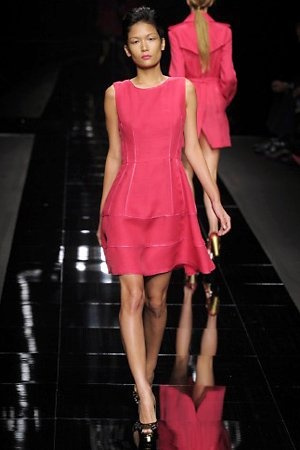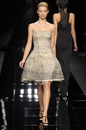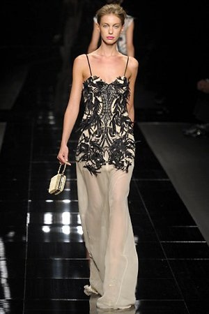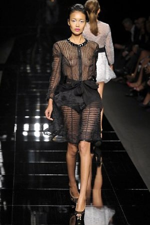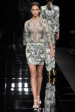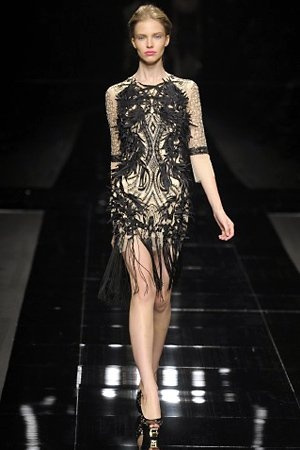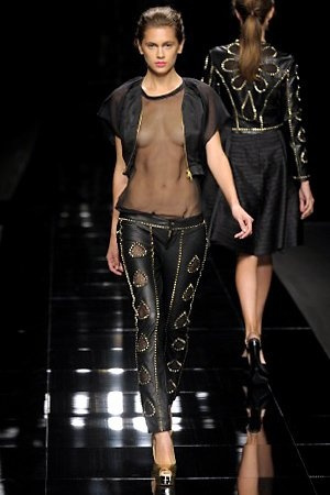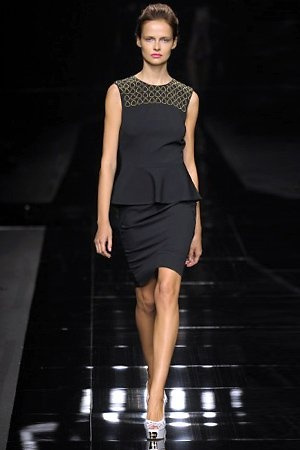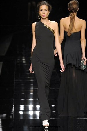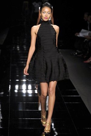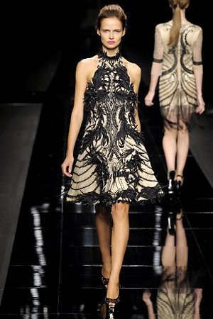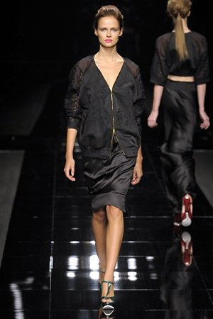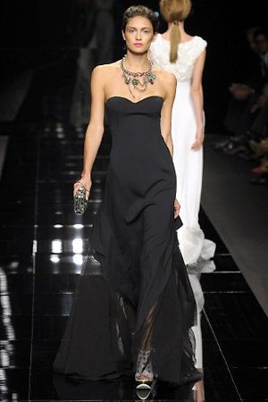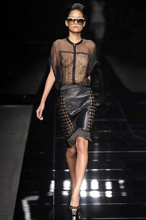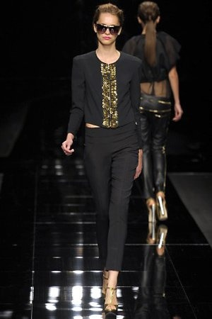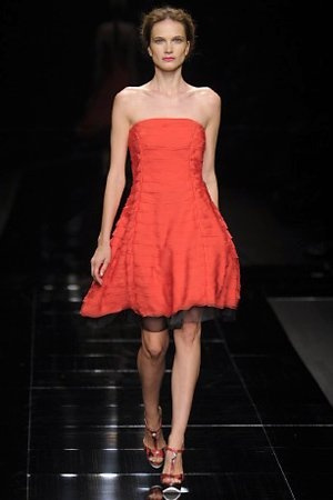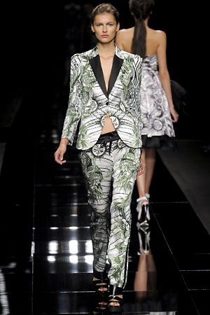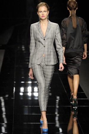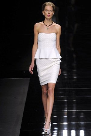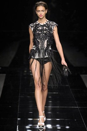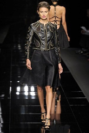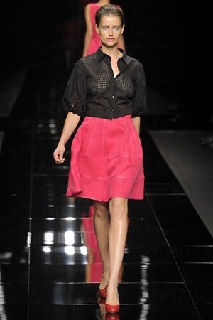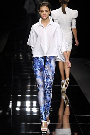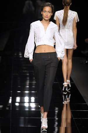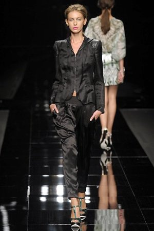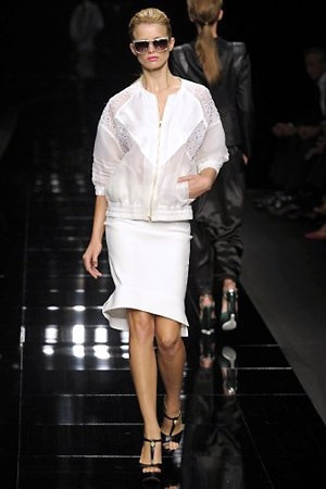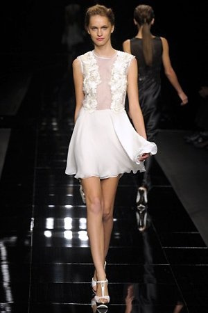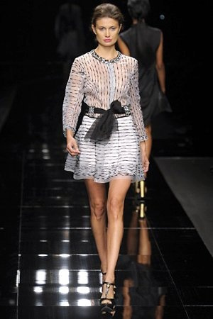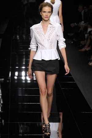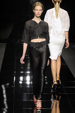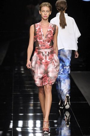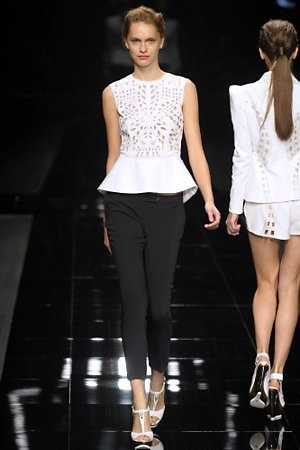Per la prossima primavera/estate John Richmond ha scelto di lavorare su diversi temi offrendo una varietà di outfit accomunati dal carattere forte della sua donna. Dal tailleur bianco dalle spalle strutturate che mette in evidenza il punto vita si passa alla versione rock di giacche traforate, anche di sottile pelle, su cui a volte non mancano borchie dorate quasi a disegnarne delle impunture.C’è un riferimento agli anni ’50 piuttosto romantico nelle gonne a ruota a cui fanno da contraltare quelle lunghe trasparenti e seducenti che esprimono un’indole da seduttrice. Le linee pulite e geometriche sono interrotti da dettagli peplo su giacche, corsetti ed abiti che conferiscono femminilità anche al formale look da lavoro, come del resto gli accessori: su scarpe, borse e gioielli compare tanto oro. Molti look total black e molti total white, ma c’è anche un grande lavoro sulle stampe che rispetta i canoni della migliore tradizione John Richmond: disegni astratti tra il rosso, l’acquamarina, il blu e ancora optical o tatoo, l’inconfondibile firma rock del designer.
