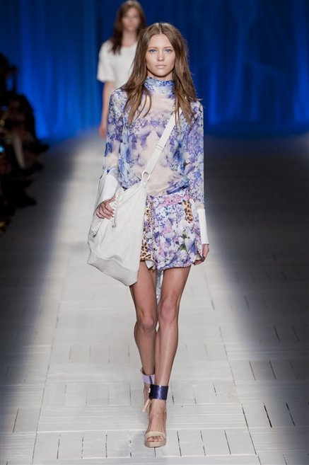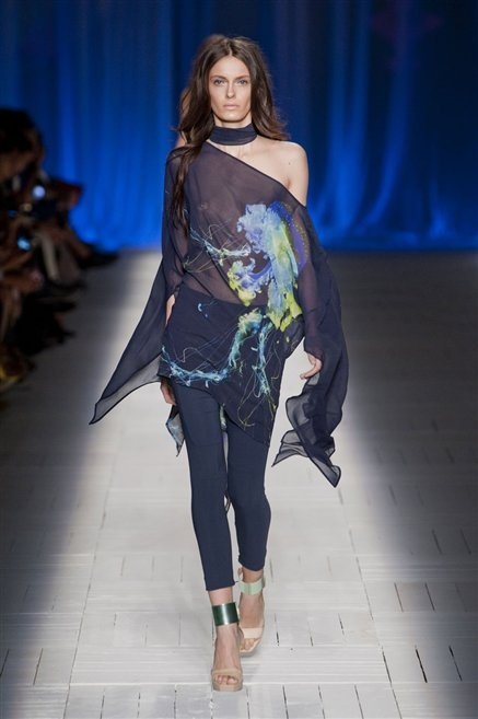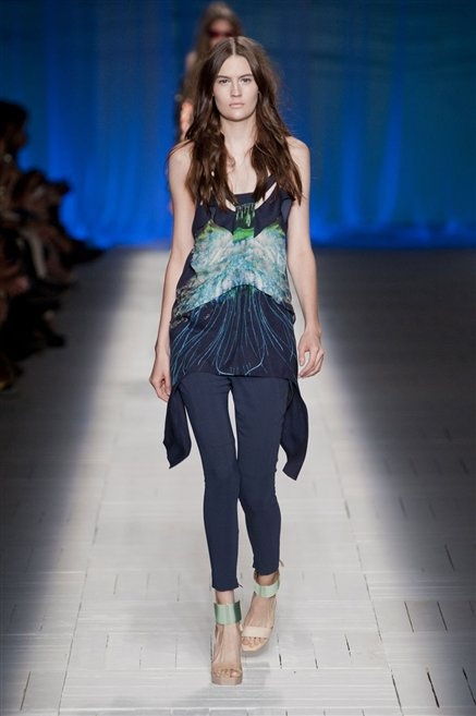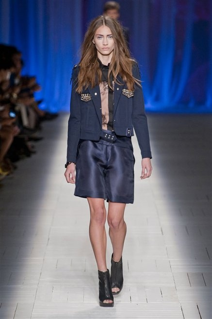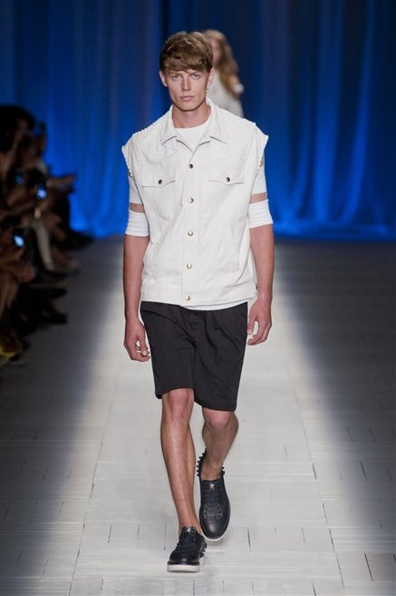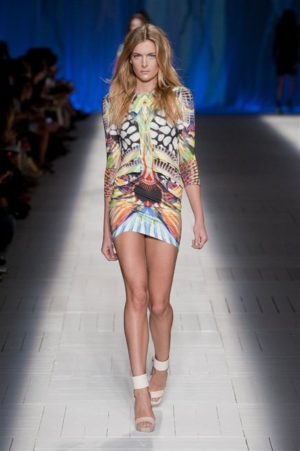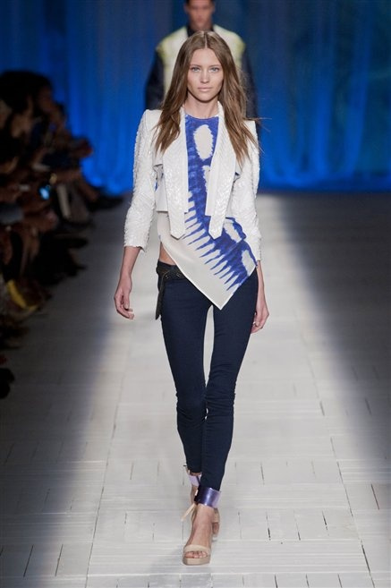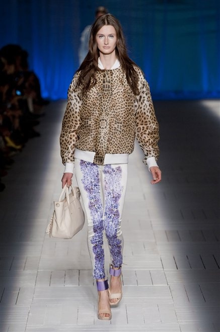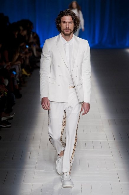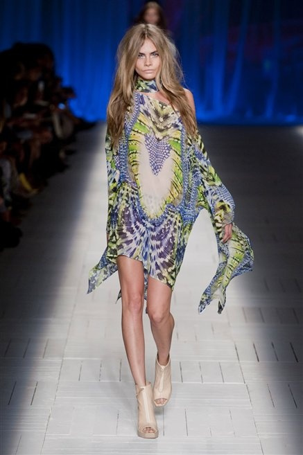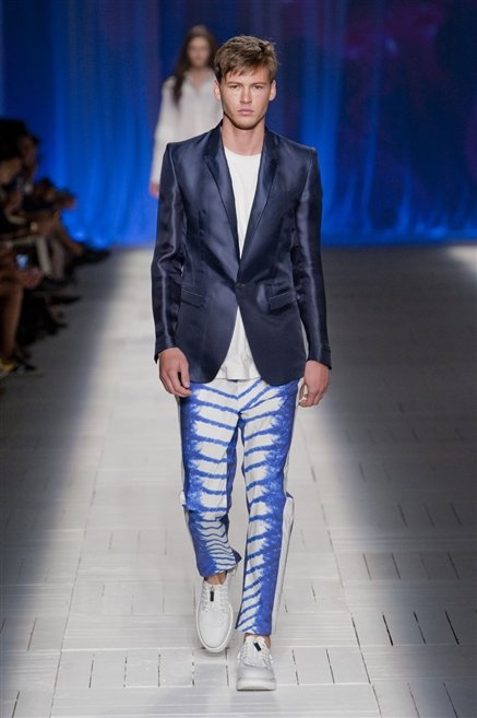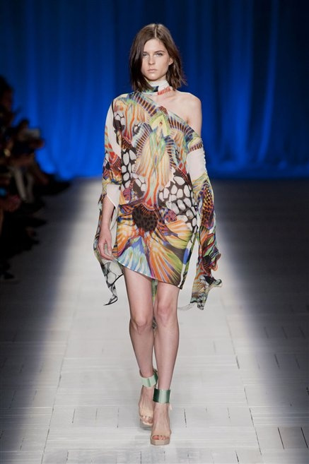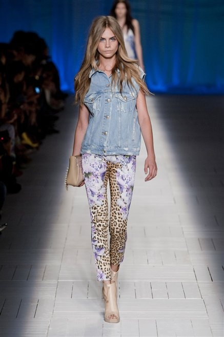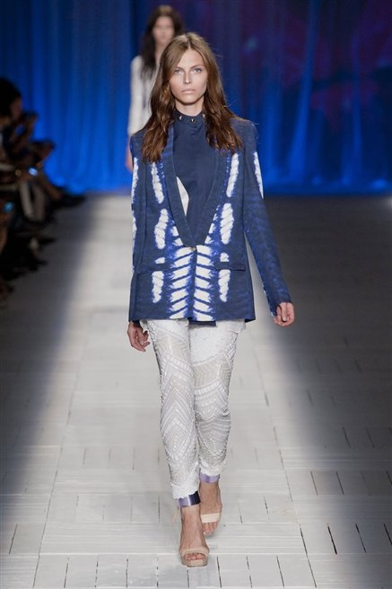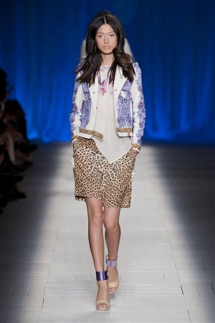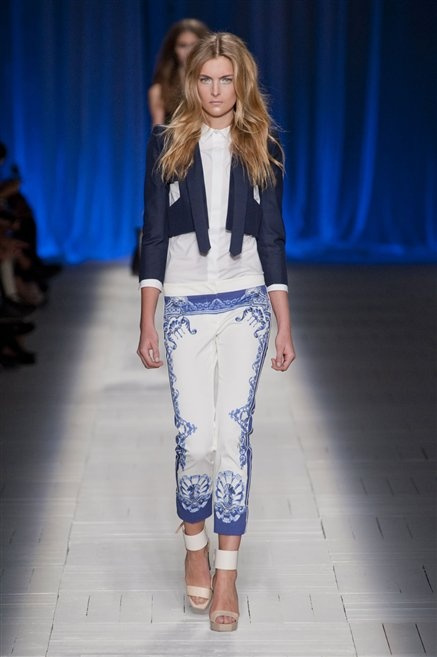 Molte giacche per la primavera/estate 2013 di Just Cavalli: accompagnano gonne leggere e svolazzanti o pantaloni skinny. Il mare è l’universo iconografico a cui Roberto Cavalli attinge per le stampe, i colori sono così più tenui rispetto alle consuete atmosfere rock, così tra il bianco e il blu ecco comparire conchiglie da cui sembra fuoriuscire l’irrinunciabile animalier, ma anche disegni astratti che in fondo evocano i più strani e remoti essere del mare, stampe quasi al neon. Gli anni ’70 sono un riferimento costante, soprattutto nelle maniche a pipistrello e nei larghi abiti vagamente hippy.