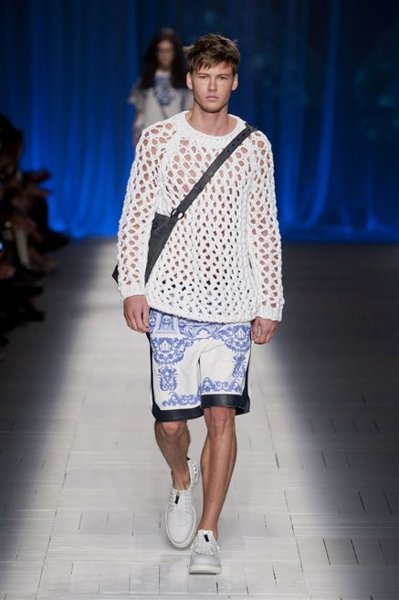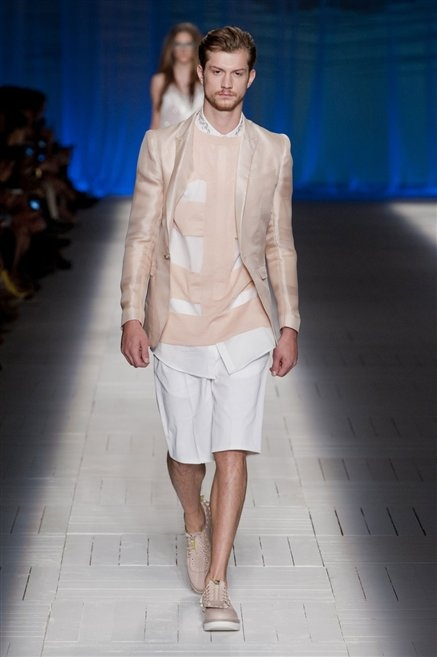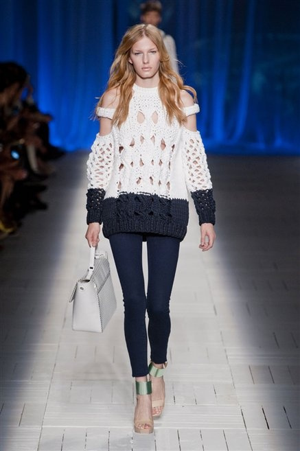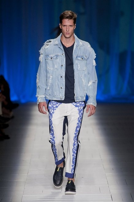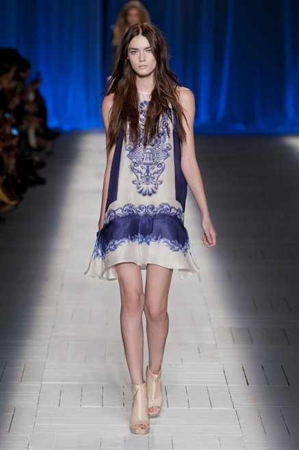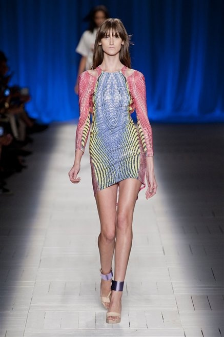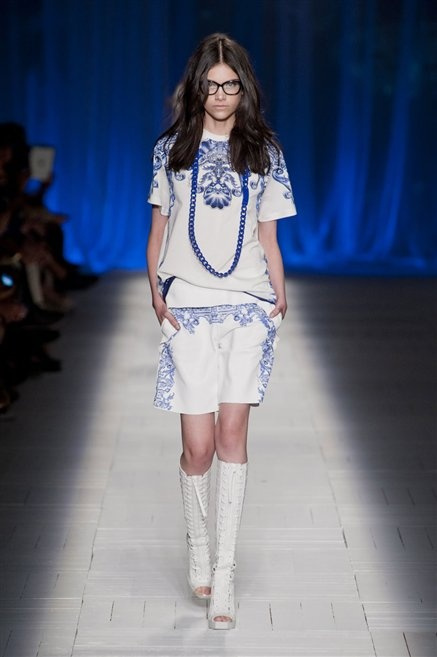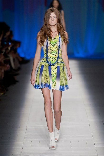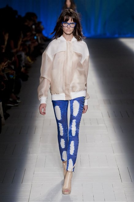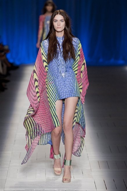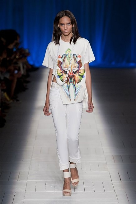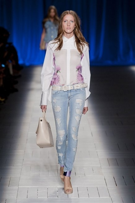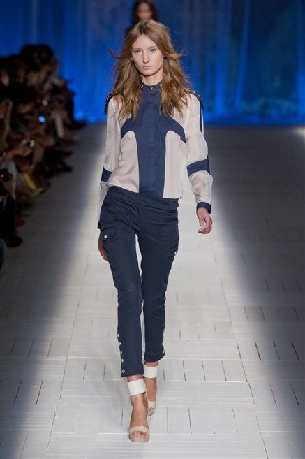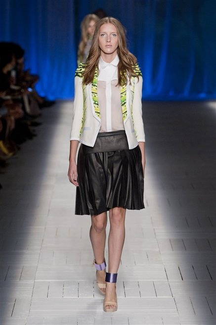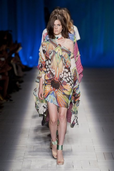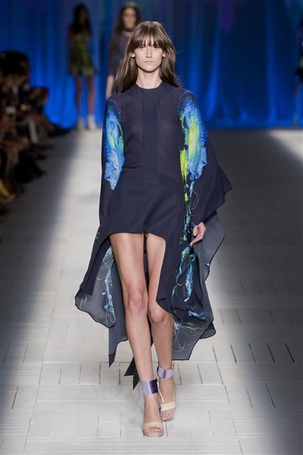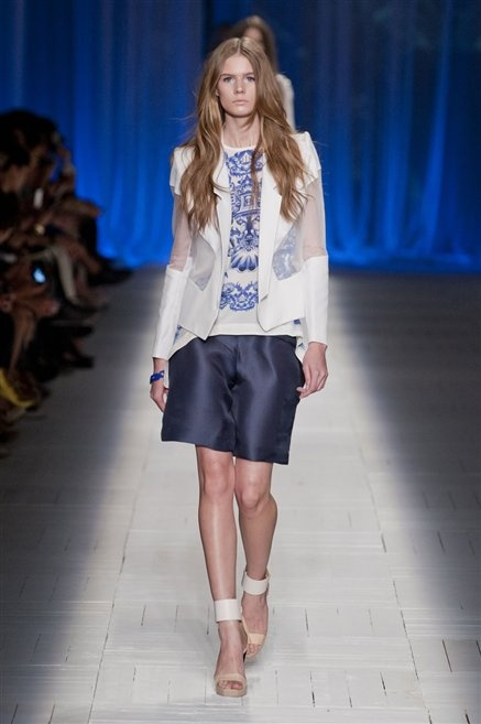 Molte giacche per la primavera/estate 2013 di Just Cavalli: accompagnano gonne leggere e svolazzanti o pantaloni skinny. Il mare è l’universo iconografico a cui Roberto Cavalli attinge per le stampe, i colori sono così più tenui rispetto alle consuete atmosfere rock, così tra il bianco e il blu ecco comparire conchiglie da cui sembra fuoriuscire l’irrinunciabile animalier, ma anche disegni astratti che in fondo evocano i più strani e remoti essere del mare, stampe quasi al neon. Gli anni ’70 sono un riferimento costante, soprattutto nelle maniche a pipistrello e nei larghi abiti vagamente hippy.