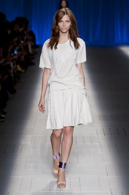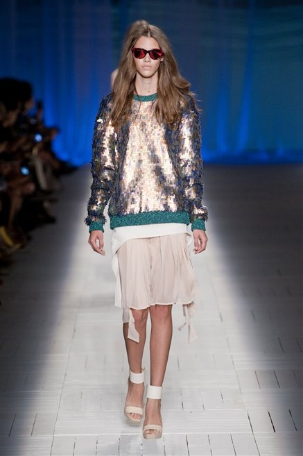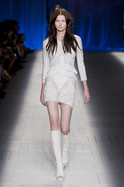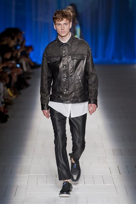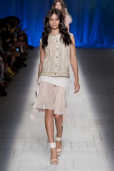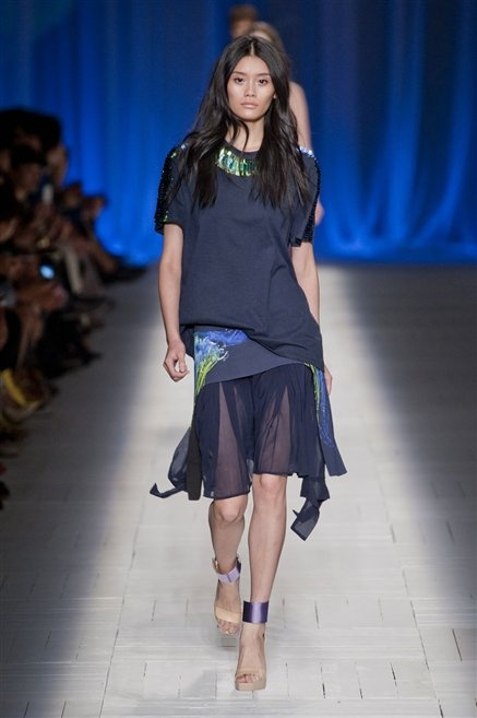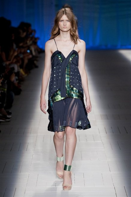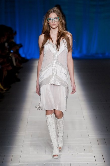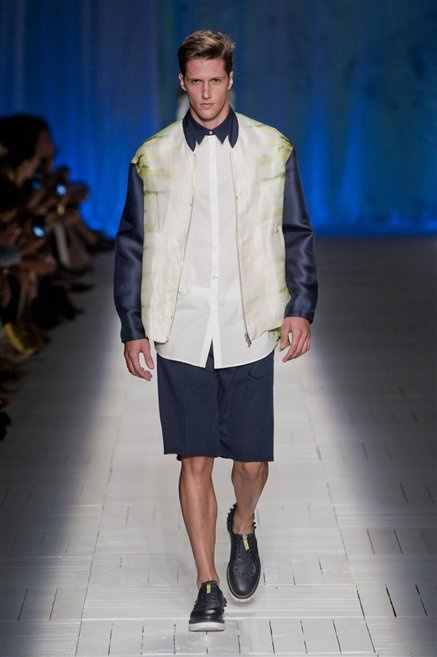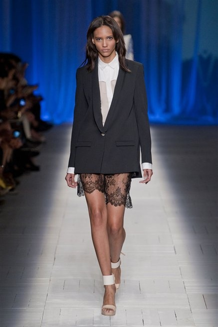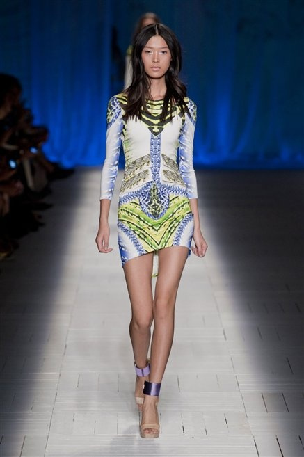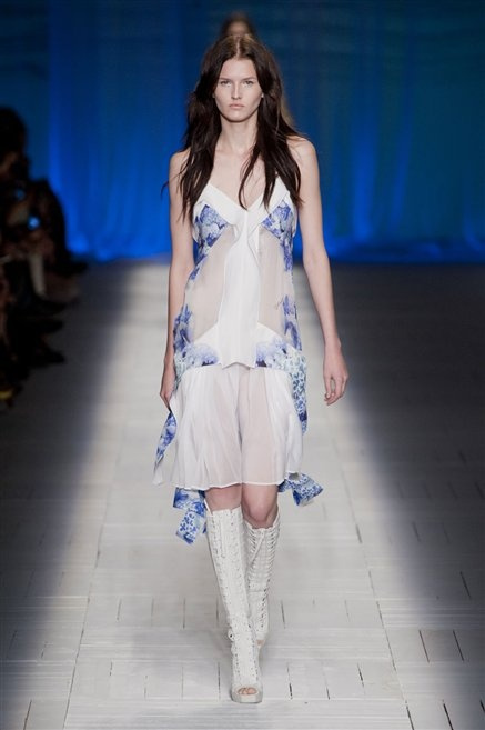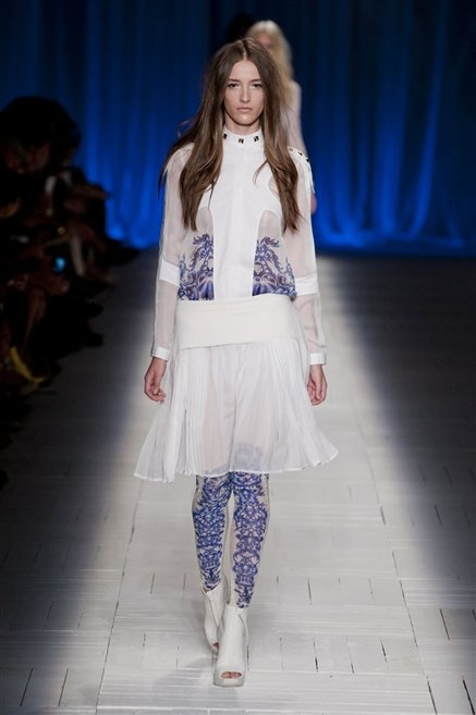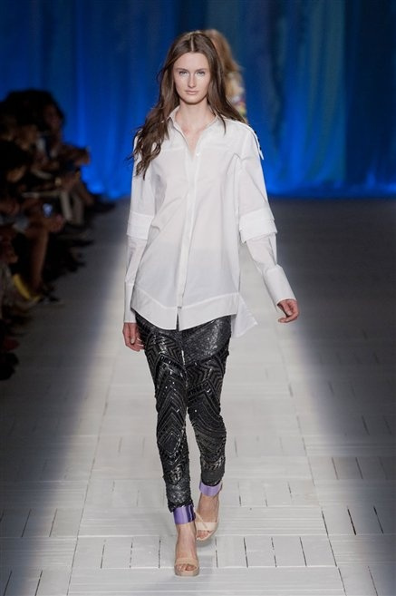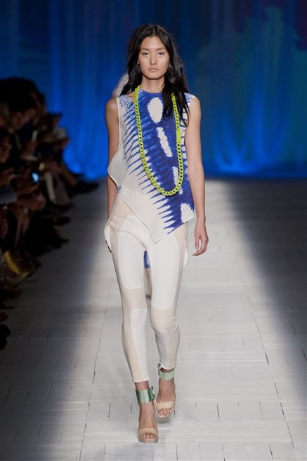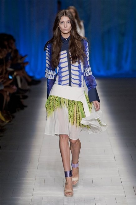 Molte giacche per la primavera/estate 2013 di Just Cavalli: accompagnano gonne leggere e svolazzanti o pantaloni skinny. Il mare è l’universo iconografico a cui Roberto Cavalli attinge per le stampe, i colori sono così più tenui rispetto alle consuete atmosfere rock, così tra il bianco e il blu ecco comparire conchiglie da cui sembra fuoriuscire l’irrinunciabile animalier, ma anche disegni astratti che in fondo evocano i più strani e remoti essere del mare, stampe quasi al neon. Gli anni ’70 sono un riferimento costante, soprattutto nelle maniche a pipistrello e nei larghi abiti vagamente hippy.
