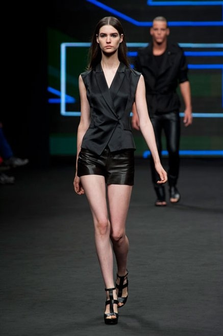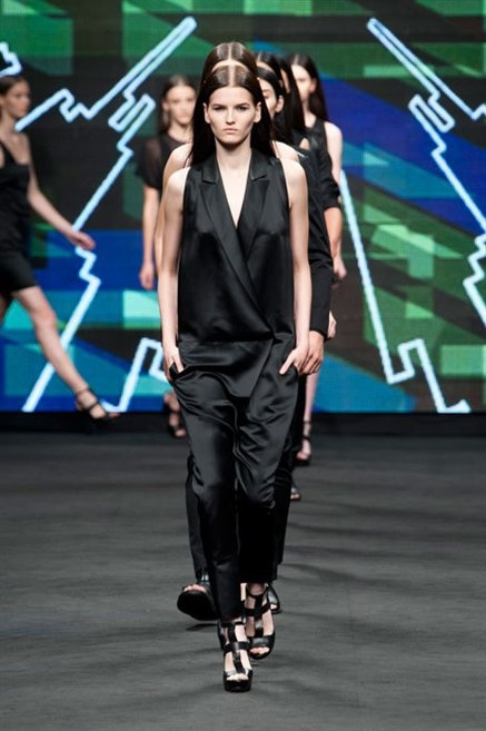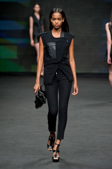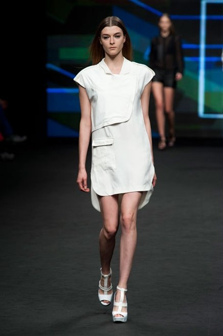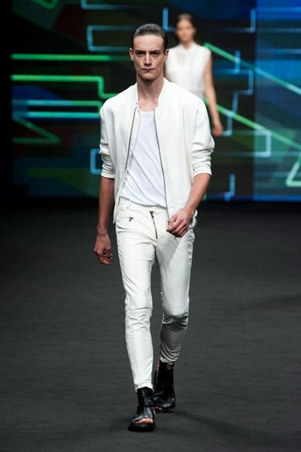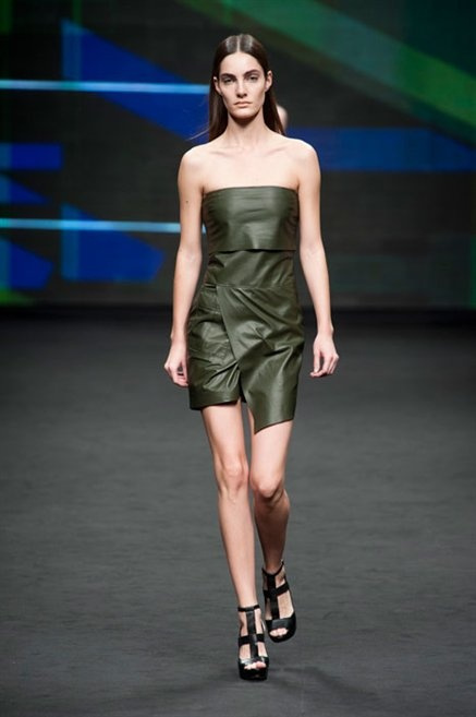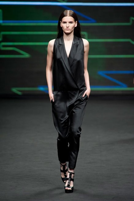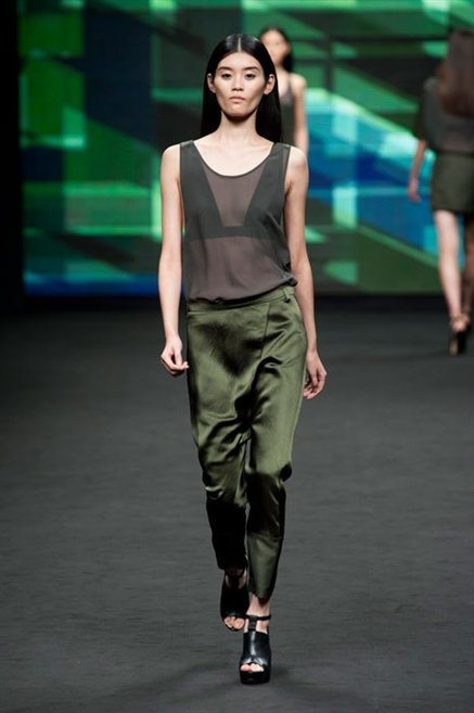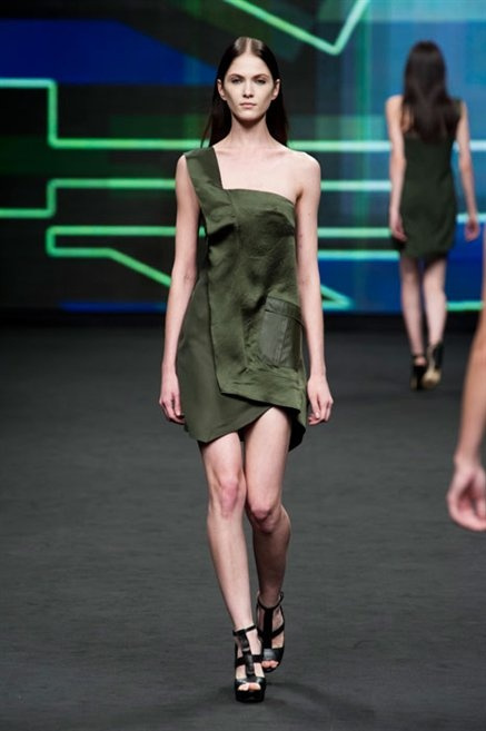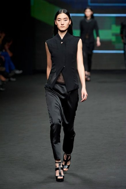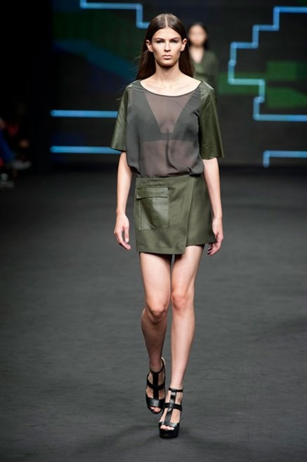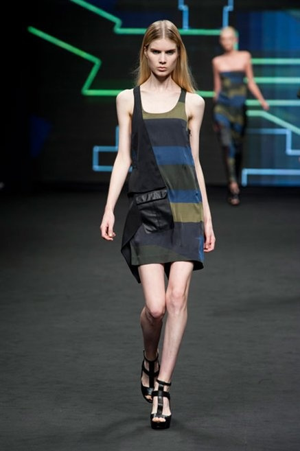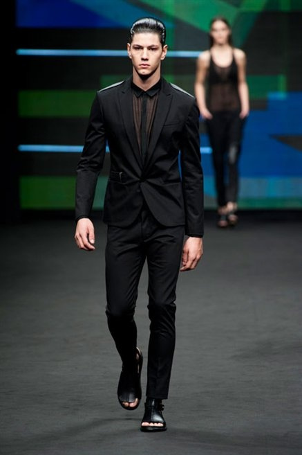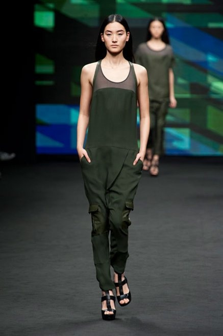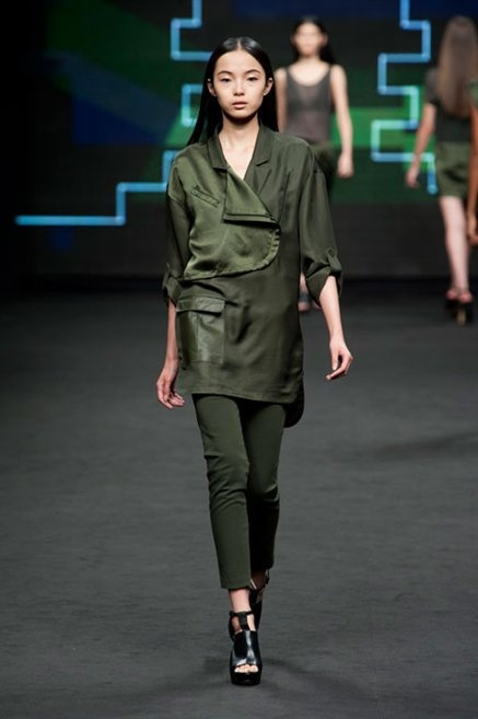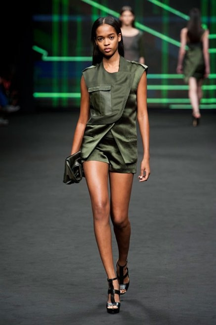 Il verde domina gran parte della collezione e si candida a colore della prossima primavera/estate. Ennio Capasa porta sulla passerella la sua giovane ragazza metropolitana, ma depone la biker delle ultime stagioni e si ispira di più al mondo militare. Gli abiti sono asimmetrici, sembra il tessuto che si ripiega su se stesso, così non imprigiona mai il corpo, il corto vince senza mezzi termini. Tasche ovunque, un po’ per comodità, un po’ per vezzo: sui pantaloni skinny, sui tuxedo jumpsuit, sugli abiti. Le uniche eccezioni al verde militare ( è una regola il monocromo su questa passerella) sono il bianco e il nero.